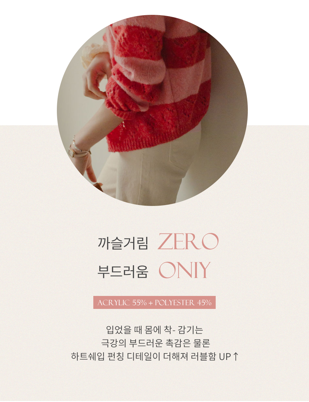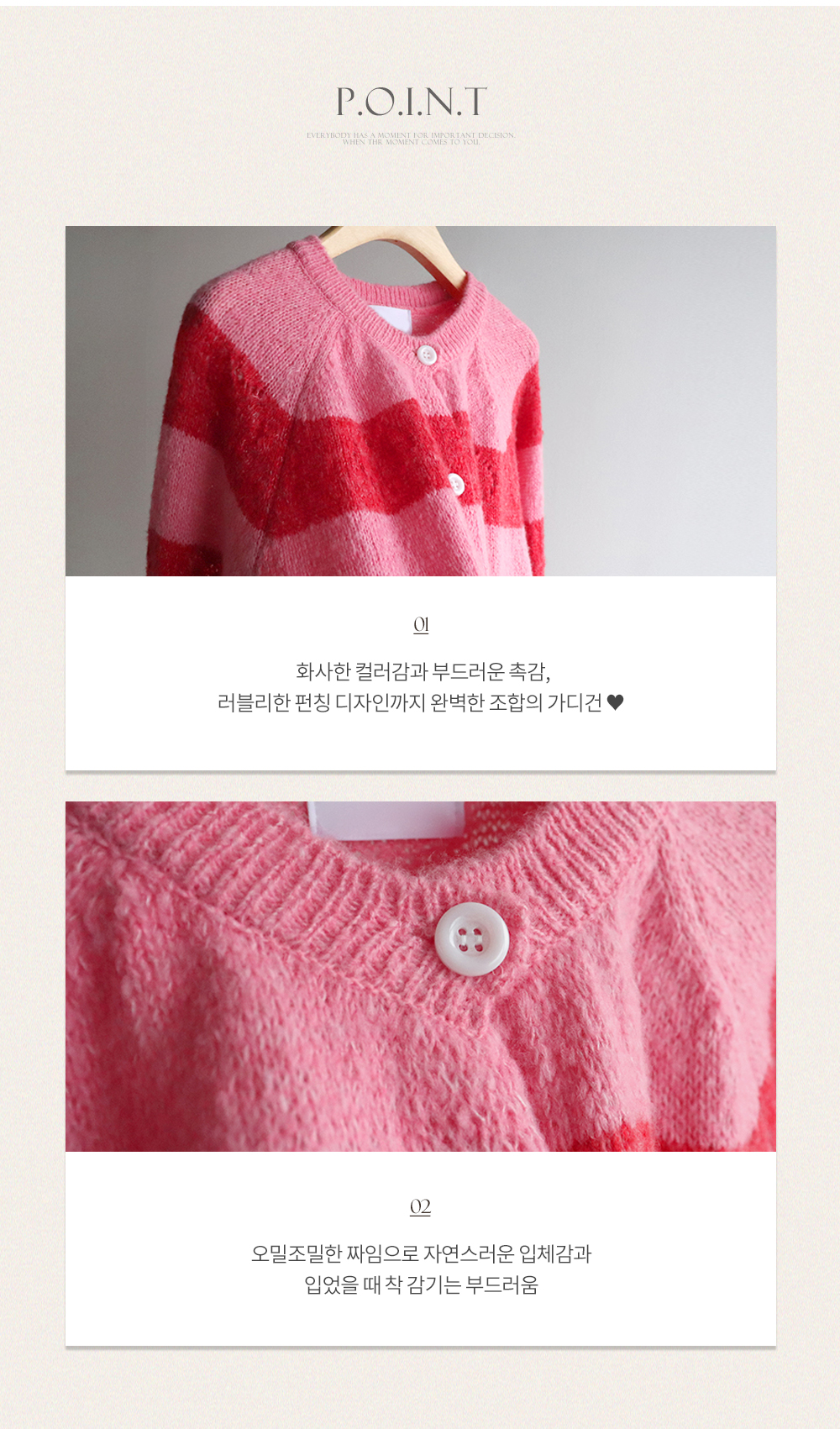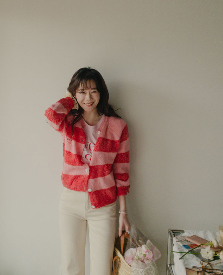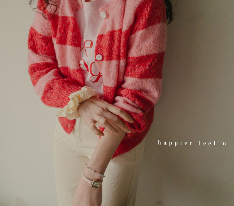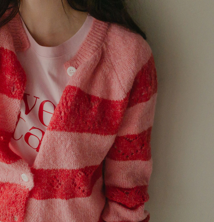 러블리한 스트라이프 조합이 돋보이는 사랑스러운 가디건 소개할게요 :) 오밀조밀한 짜임에 자연스러운 입체감이 느껴지고 살짝 후들~한 느낌도 들었던 아이인데요~ 입었을 때 착- 감기는 극강의 부드러운 촉감이 자꾸만 입고 싶어지는 가디건이더라구요! ㅎㅎ 까슬거림 없다보니 피부 예민하신분들도 충분히 편하게 입으시기 좋으실거에요 프렌치한 분위기가 느껴지기 보다는 왠지 모를 사랑스러움이 느껴졌는데요,,! 단가라 한 쪽 라인에 하트쉐입 펀칭이 전체적으로 더해진 디자인이라 더더욱 러블리함이 풍겨지더라구요♡ 적당한 간격의 단가라 패턴에 전체적으로 화사한 분위기를 연출해주는 단가라 조합으로 모델언니처럼 면바지나 데님에 가볍게 코디해주셔도 넘 멋스러움이 살아나는 아이랍니다 *.* 티나 나시에 가볍게 걸치기 좋은 사이즈에 어깨라인 부각이 없는 나그랑 디자인으로 더욱 편안하게 입어지는 가디건이에요~! 클로징해서 단독으로 원피스와 함께 입어도 예쁘고 세미크롭 기장으로 부담스럽지 않으며 다리도 훅- 길어보이는 효과까지 주는 가디건! 컬러는 화사함 가득한 핑크+레드 단가라조합의 핑크컬러, 산뜻한 무드가 느껴지는 라이트그린+ 아이보리 단가라조합의 라이트그린컬러, 여리여리함이 더욱 살아나는 라이트블루+블루 단가라조합의 라이트블루 컬러까지 총 3가지 컬러 준비했어요 :) 취향에 맞게 한 컬러쯤 꼭! 소장하셔서 봄 기운 물씬~느껴보세요♥ **니트 소재 특성상 보풀, 필링 현상이 있을 수 있어 드라이클리닝을 권장드려요**