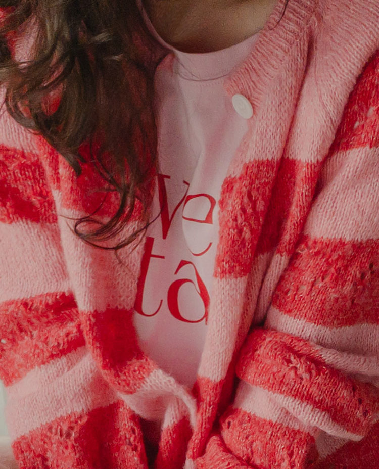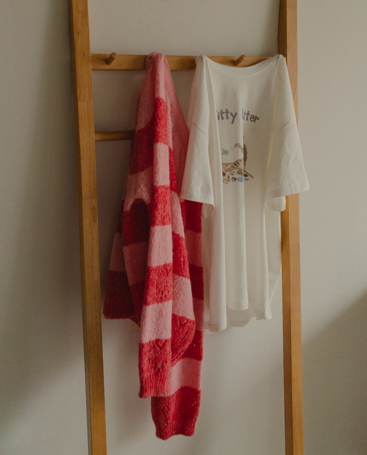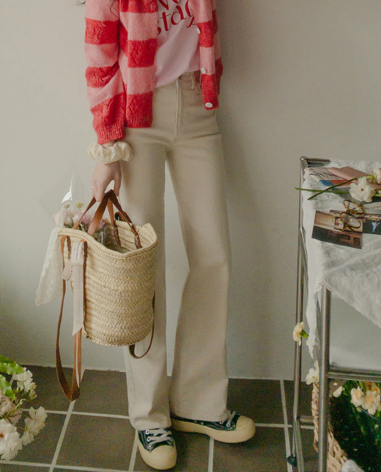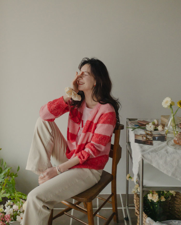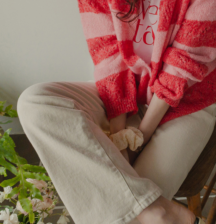 러블리한 스트라이프 조합이 돋보이는 사랑스러운 가디건 소개할게요 :) 오밀조밀한 짜임에 자연스러운 입체감이 느껴지고 살짝 후들~한 느낌도 들었던 아이인데요~ 입었을 때 착- 감기는 극강의 부드러운 촉감이 자꾸만 입고 싶어지는 가디건이더라구요! ㅎㅎ 까슬거림 없다보니 피부 예민하신분들도 충분히 편하게 입으시기 좋으실거에요 프렌치한 분위기가 느껴지기 보다는 왠지 모를 사랑스러움이 느껴졌는데요,,! 단가라 한 쪽 라인에 하트쉐입 펀칭이 전체적으로 더해진 디자인이라 더더욱 러블리함이 풍겨지더라구요♡ 적당한 간격의 단가라 패턴에 전체적으로 화사한 분위기를 연출해주는 단가라 조합으로 모델언니처럼 면바지나 데님에 가볍게 코디해주셔도 넘 멋스러움이 살아나는 아이랍니다 *.* 티나 나시에 가볍게 걸치기 좋은 사이즈에 어깨라인 부각이 없는 나그랑 디자인으로 더욱 편안하게 입어지는 가디건이에요~! 클로징해서 단독으로 원피스와 함께 입어도 예쁘고 세미크롭 기장으로 부담스럽지 않으며 다리도 훅- 길어보이는 효과까지 주는 가디건! 컬러는 화사함 가득한 핑크+레드 단가라조합의 핑크컬러, 산뜻한 무드가 느껴지는 라이트그린+ 아이보리 단가라조합의 라이트그린컬러, 여리여리함이 더욱 살아나는 라이트블루+블루 단가라조합의 라이트블루 컬러까지 총 3가지 컬러 준비했어요 :) 취향에 맞게 한 컬러쯤 꼭! 소장하셔서 봄 기운 물씬~느껴보세요♥ **니트 소재 특성상 보풀, 필링 현상이 있을 수 있어 드라이클리닝을 권장드려요**