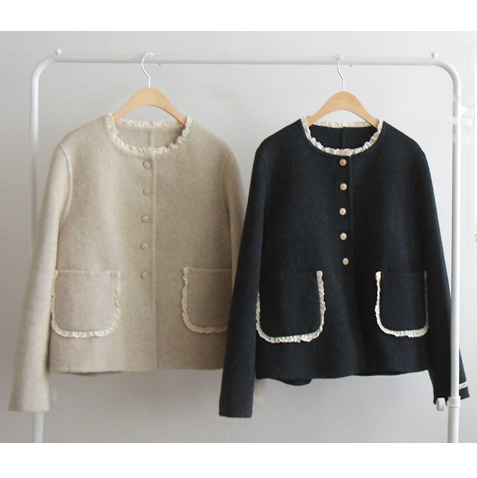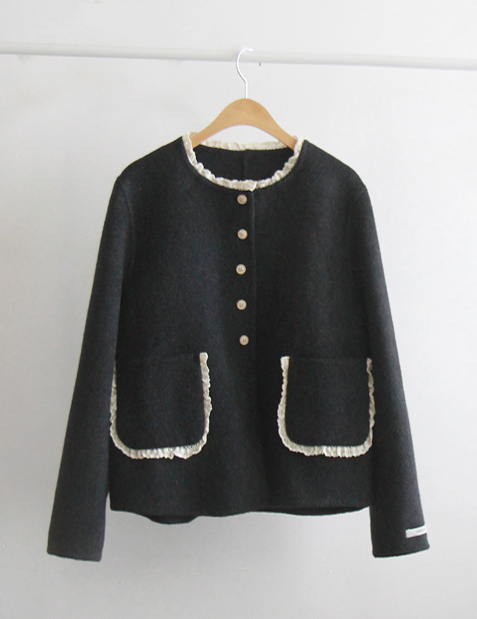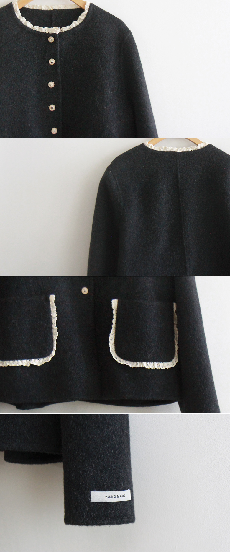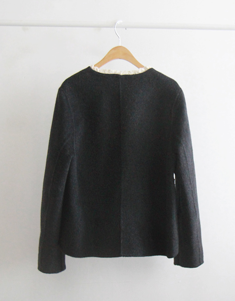 【ウール100%含有量のスタイリッシュなムードを載せたハンドメイドジャケット】【レースデコロソフィスティケイトデザイン】【ポケットもレースデコでラブリーなデザイン】