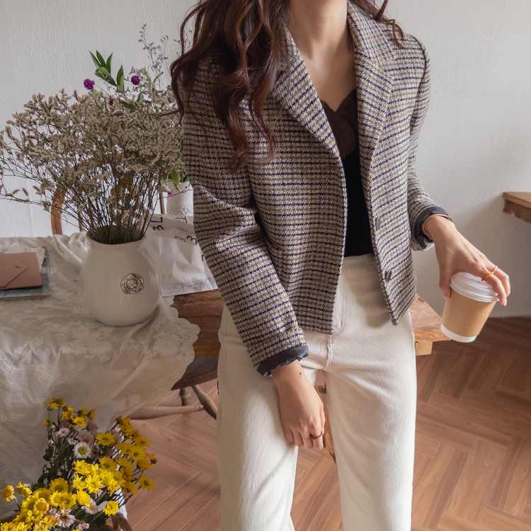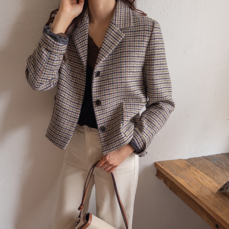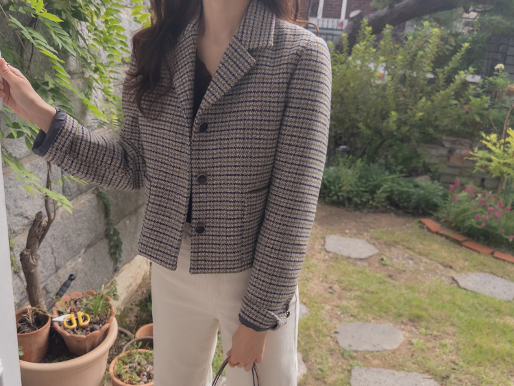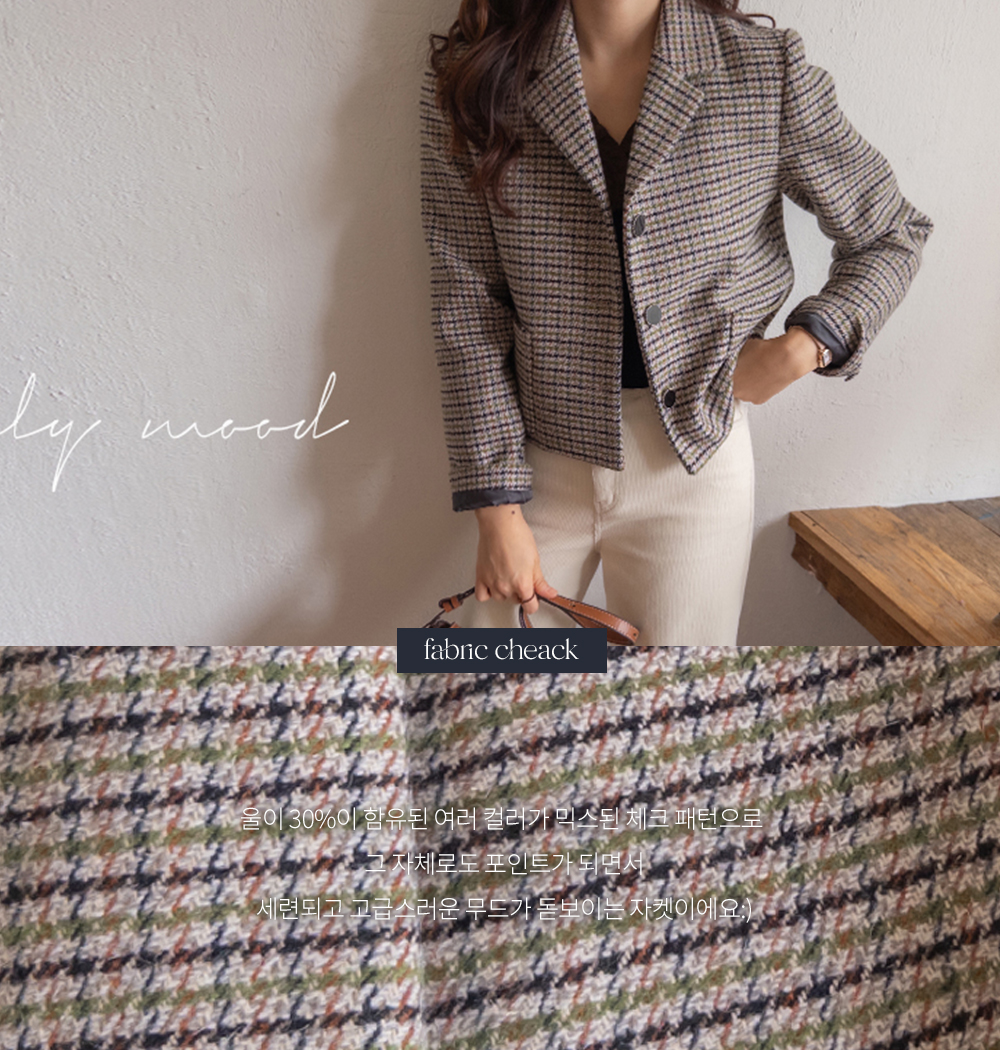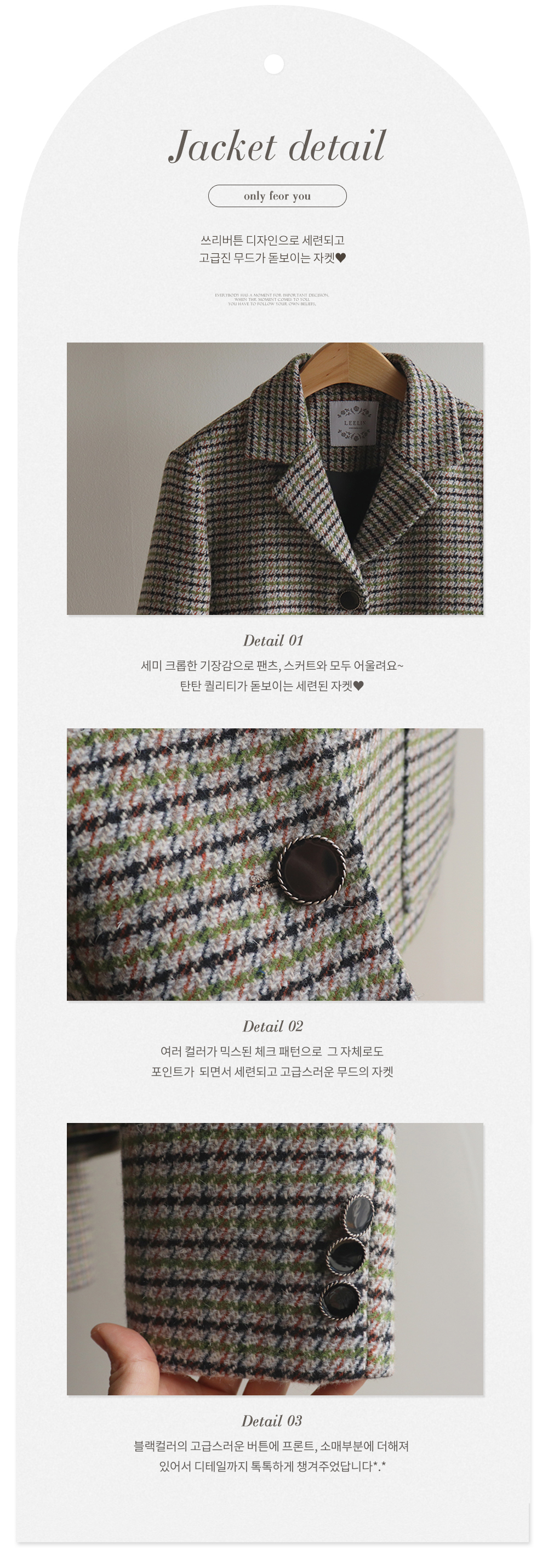 이제 본격적으로 아우터의 계절이 다가오면서 다양한 류의 아우터 찾으시는 분들 많으실텐데요~ 자켓 맛집! 리린에서 야심차게 준비해서 보여드리는 트위드 자켓 소개드려 볼게요 ㅎㅎ 요 트위드 자켓은 울이 30% 블랜딩되어서 보온성과 퀄리티 톡톡하게 챙겨준 아이인데요! 여러 컬러가 믹스된 체크 패턴으로 그 자체로도 포인트가 되면서 세련되고 고급스러운 무드가 돋보이는 자켓이에요:) 깔끔한 쉐입의 아웃포켓으로 실용성도 챙겨주었고 블랙컬러의 고급스러운 버튼 디테일이 프론트, 소매부분에 더해져 있어서 디테일까지 톡톡하게 챙겨주었답니다*.* 세미크롭한 길이감으로 어떤 하의류와도 이지하게 코디하기 좋고 출근룩은 물론이구요 데일리나 중요한 자리가 많아지는 가을시즌에 하객룩 등으로도 강추! 컬러도 과하지 않으면서도 룩에 존재감을 더해줄 두가지 컬러로 준비했으니 소장하셔서 매년마다 오래오래 함께해주세요~♡