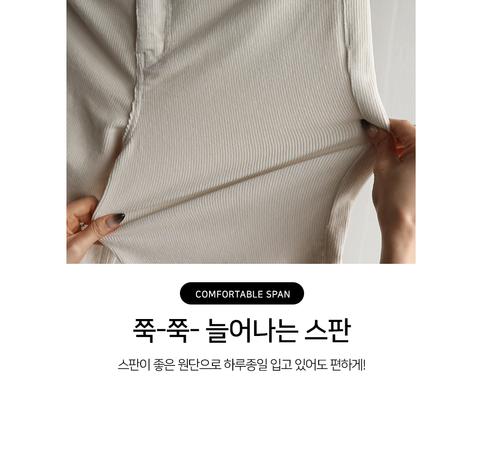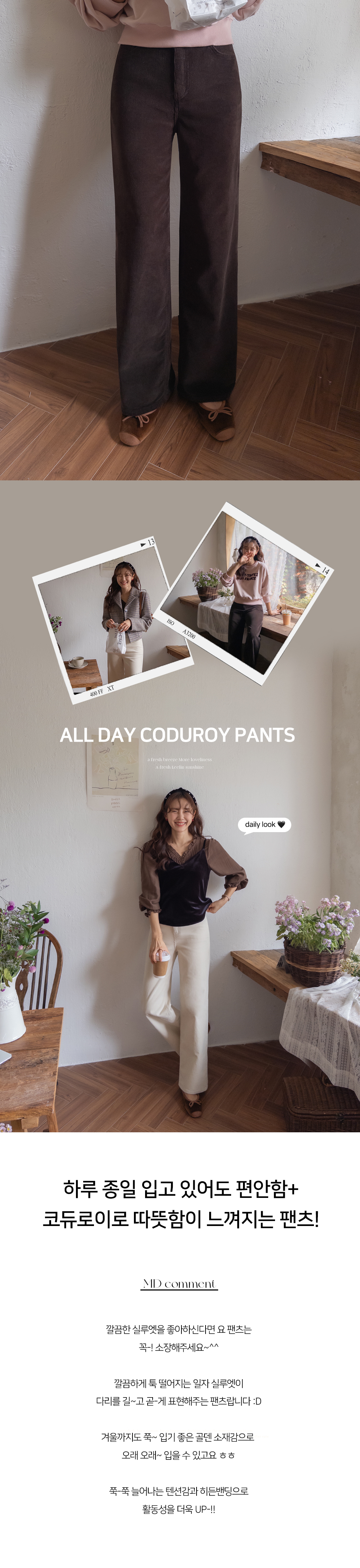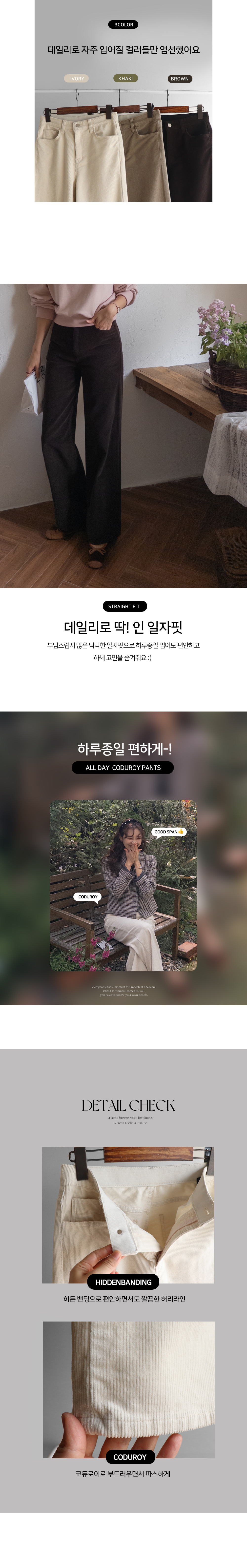 깔끔한 실루엣을 좋아하신다면 요 팬츠는 꼭-! 소장해주세요~^^ 깔끔하게 툭 떨어지는 일자 실루엣이 다리를 길~고 곧-게 표현해주는 팬츠랍니다 :D 겨울까지도 쭉~ 입기 좋은 골덴 소재감으로 오래 오래~ 입을 수 있고요 ㅎㅎ 쭉-쭉 늘어나는 텐션감과 히든밴딩으로 활동성을 더욱 UP-!! 하루종일 편안한 팬츠, 굿초이스 해주세요 ~♥