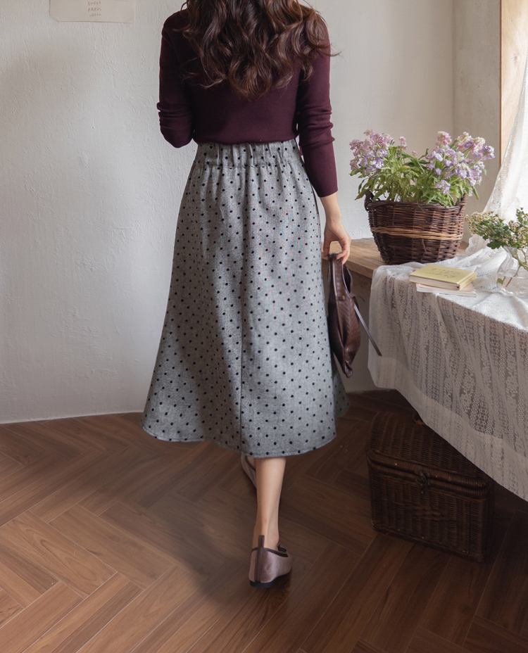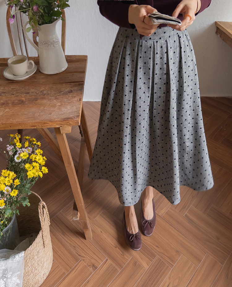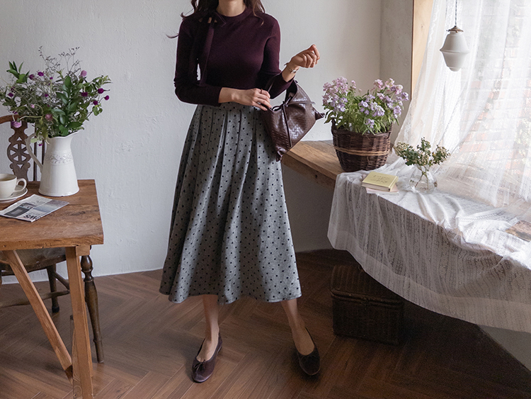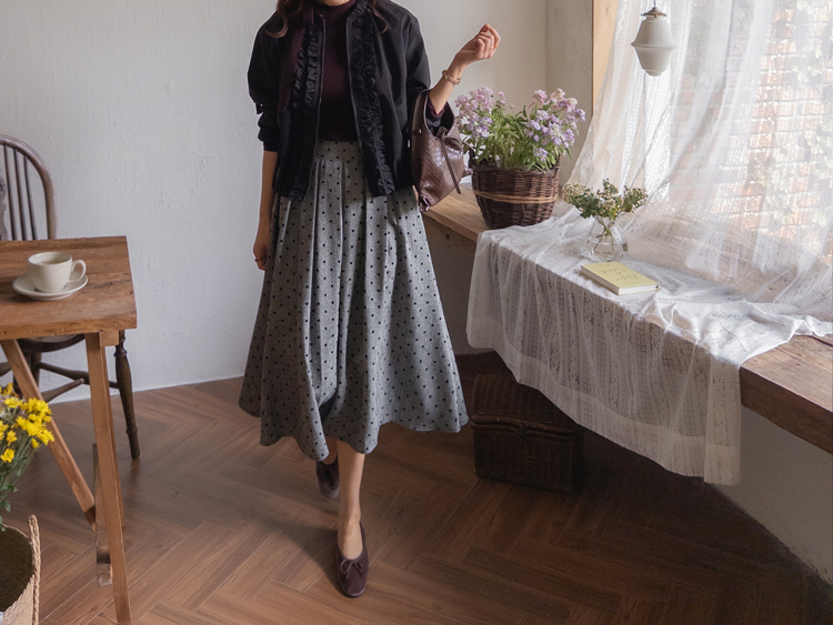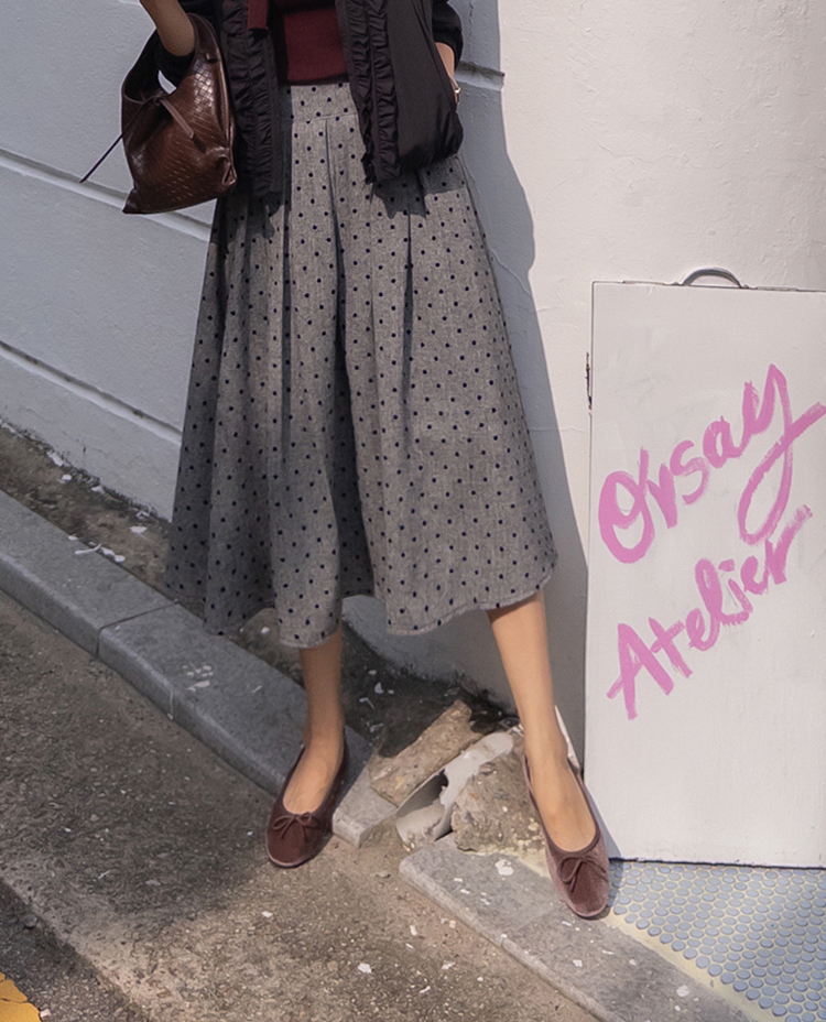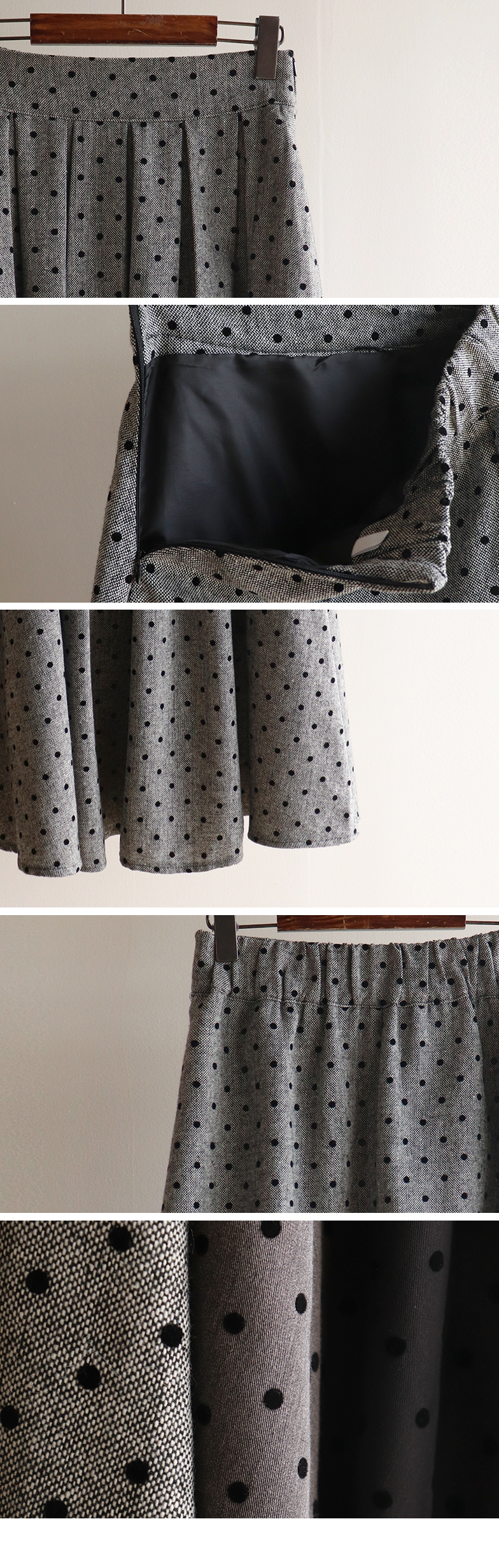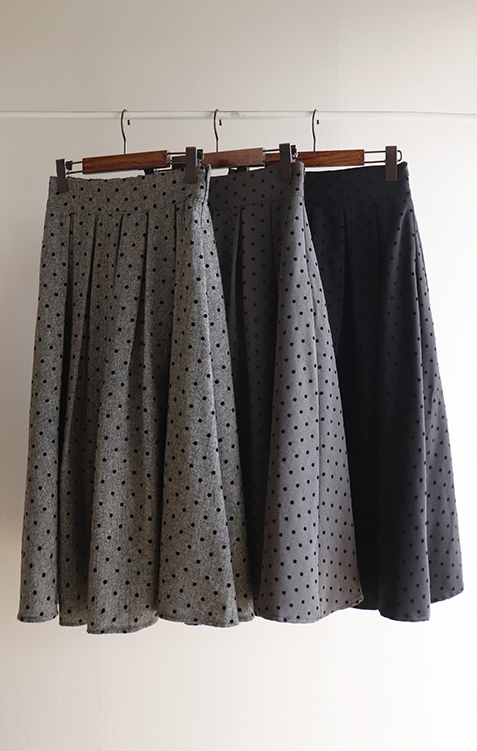 사랑스러운 도트 패턴으로 여기~저기~ 코디 활용도 높은 SK 소개드려요 ~^^ 사랑스런 도트와 플레어라인의 여성스러움이 더해져 하객룩&출근룩&데이트룩 다~ 잘 어울리는 센스있는 코디를 완성시켜줄 만능템 -!! 롱한 기장감과 플레어라인으로 완벽한 하체커버는 물론이구요~ 뒷밴딩으로 하루종일 편안하게 ㅎㅎ 차분한 컬러감에 텐셀 원단의 고급스러움이 느껴지는 두 컬러와~ 후로킹 원단으로 벨벳처럼 부드럽고 보송한 터치감이 매력적인 홈스방 차콜로 준비했어요^^ 굿초이스해주세요 ♥
