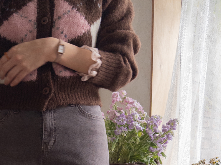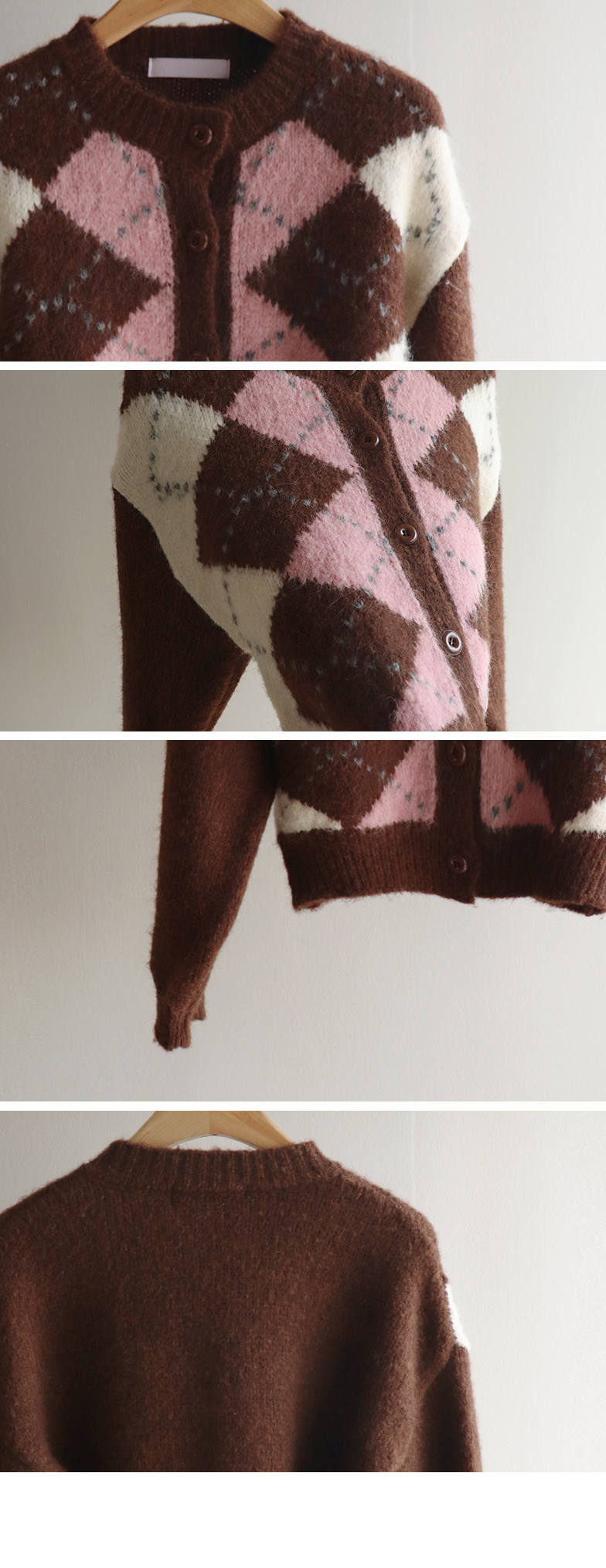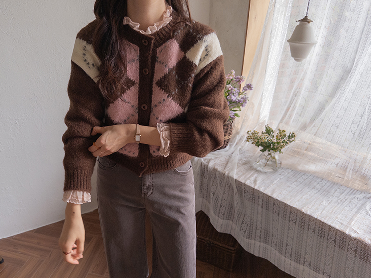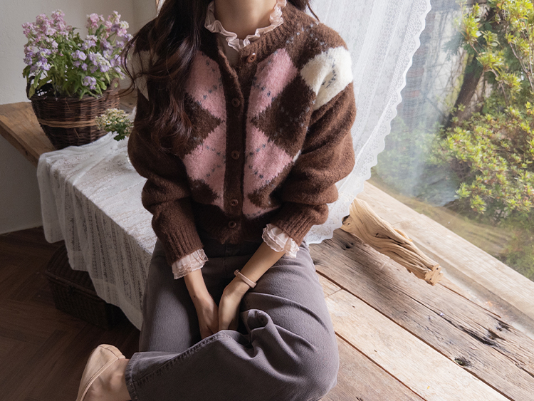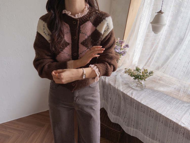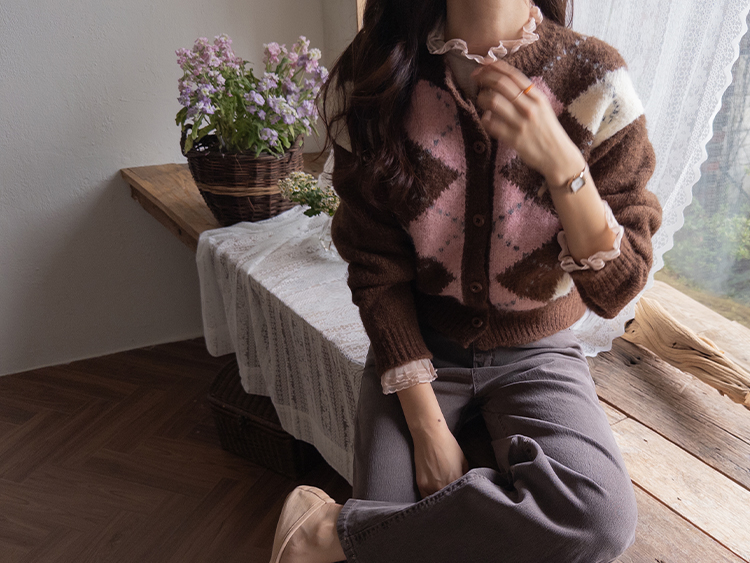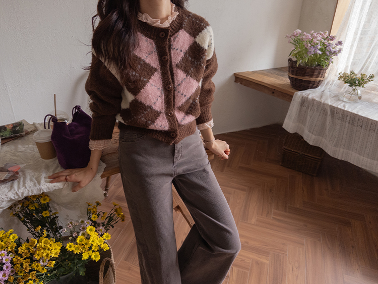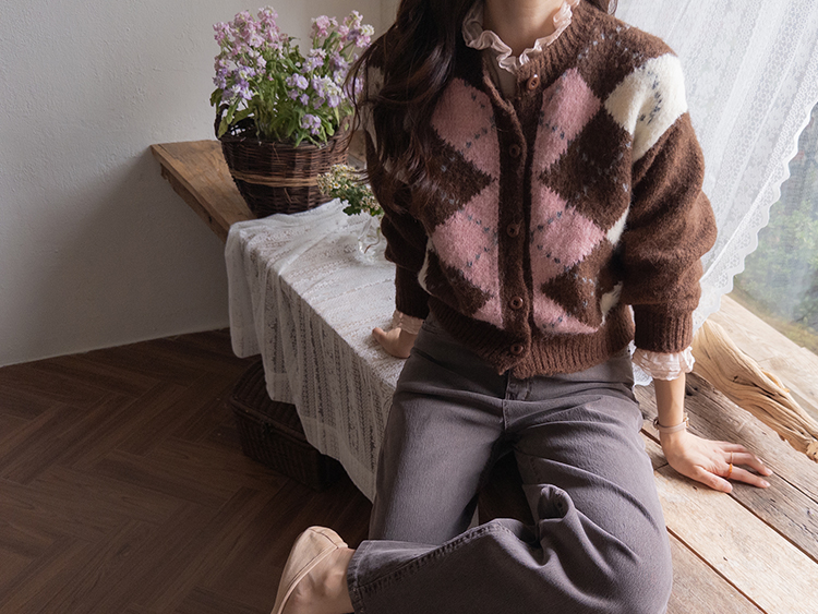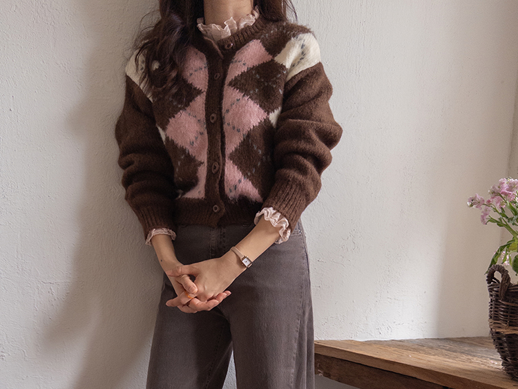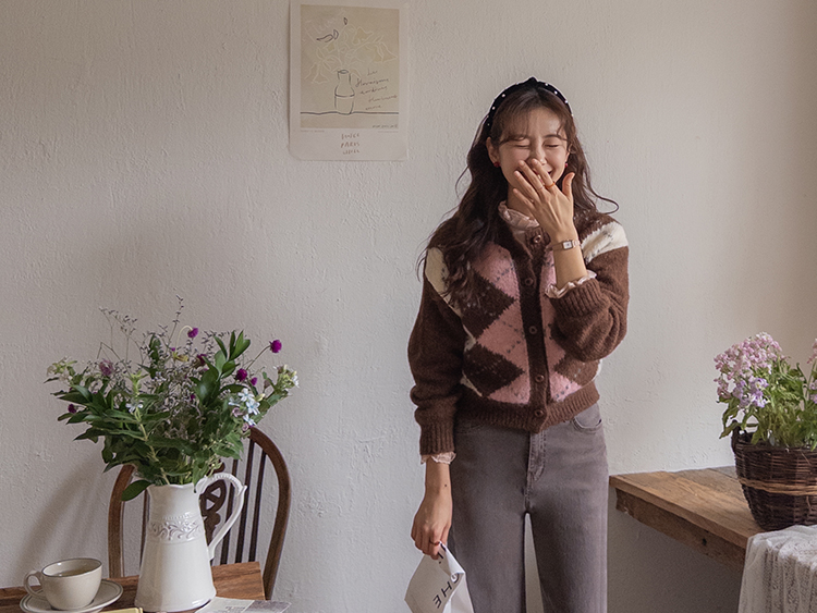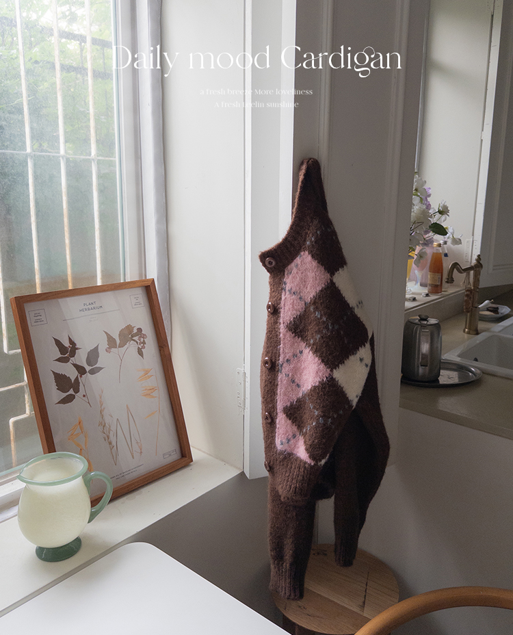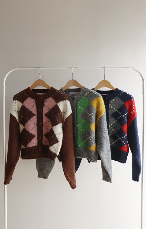 폭닥폭닥 귀여운 무드 가득~ 아가일 가디건 보여드려요♥ 클래식한 무드 가득 담은 아가일 패턴이 포인트가 되는데요ㅎㅎ 울 함유로 탄탄한 내구성GOOD 보들보들 부드런 텍스처로 까슬거림이 없어 편안하게 착용하기 좋구요! 베이직한 실루엣에 약간 크롭한 기장으로 어떤 하의와 매치해도 멋스럽게 잘 어울려요ㅎㅎ 단독으로 OK, 이너와 함께 매치해도 OK 가디건 하나로 포인트 주기 좋아 강추드려요^^