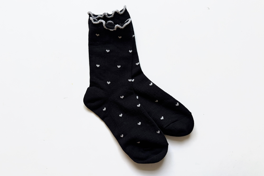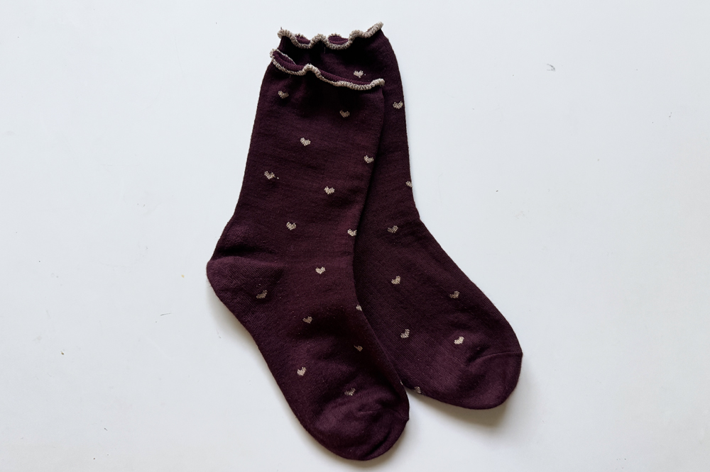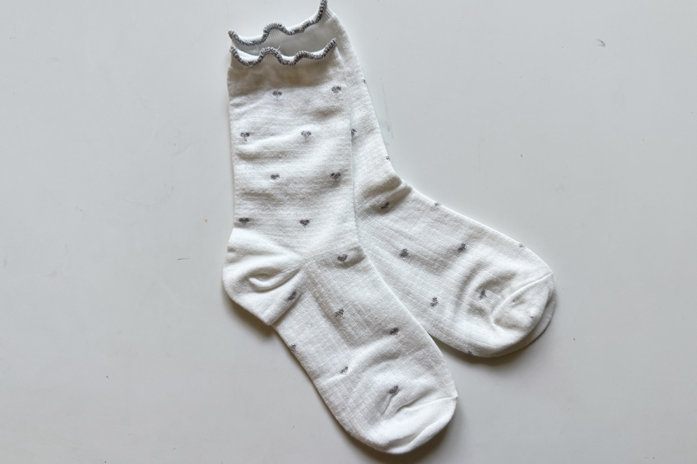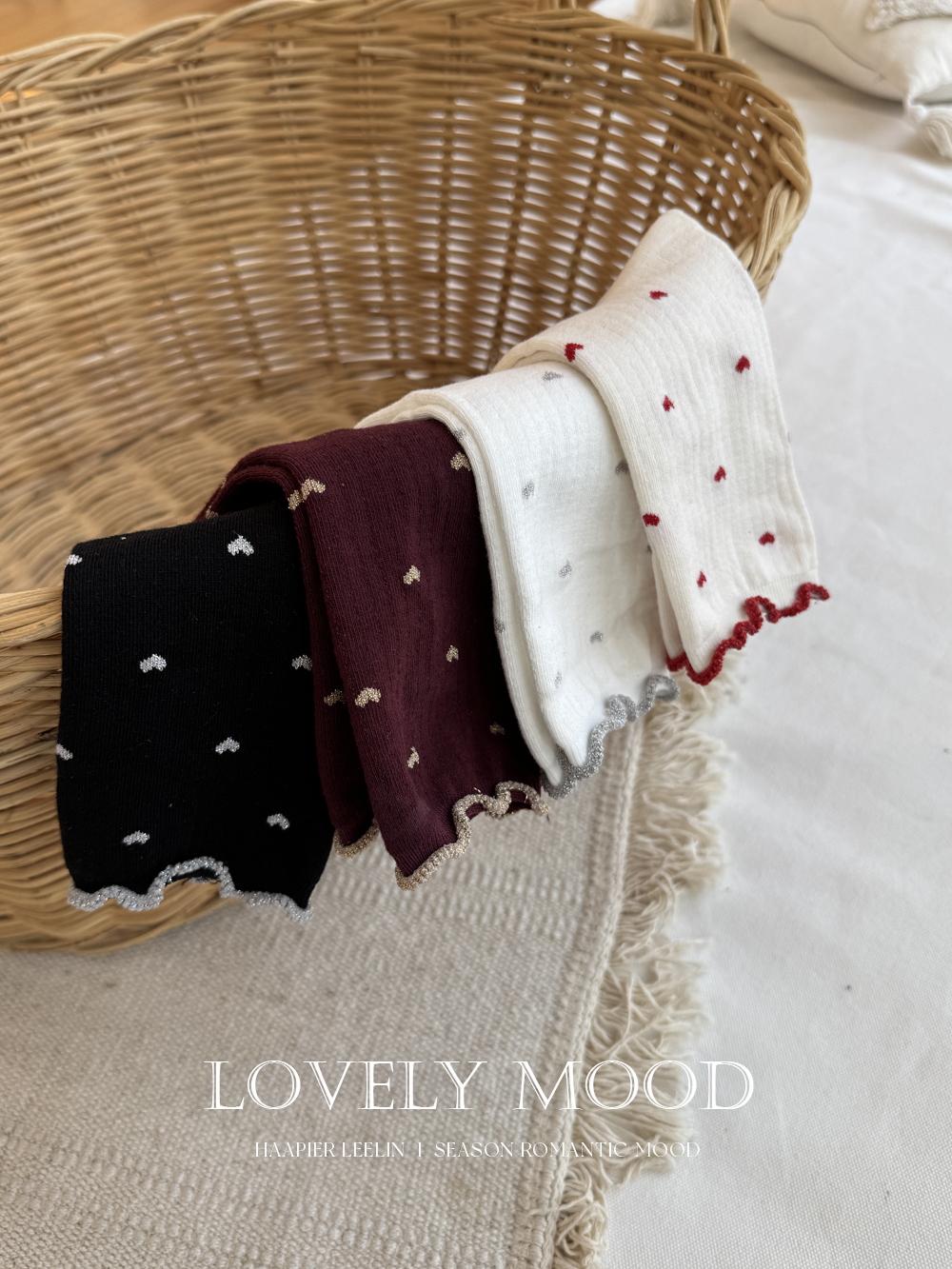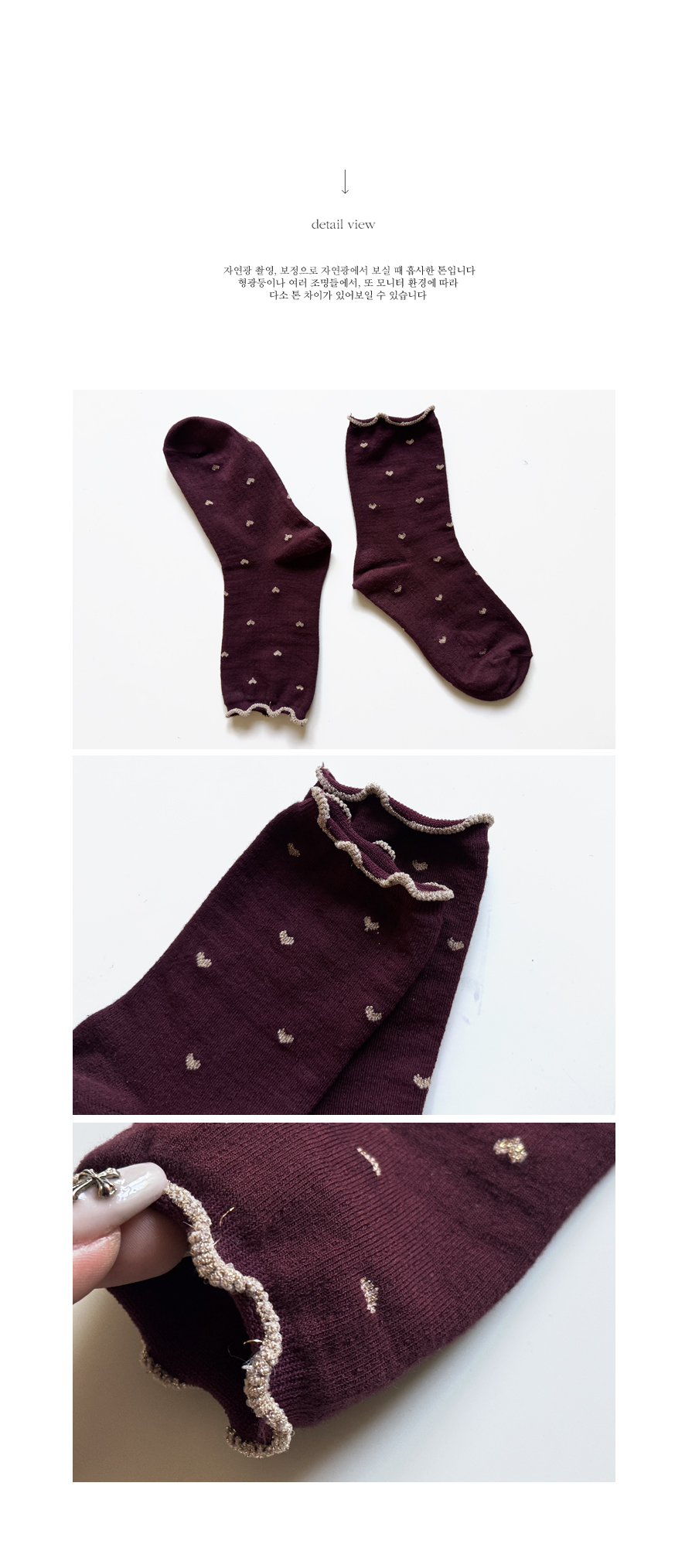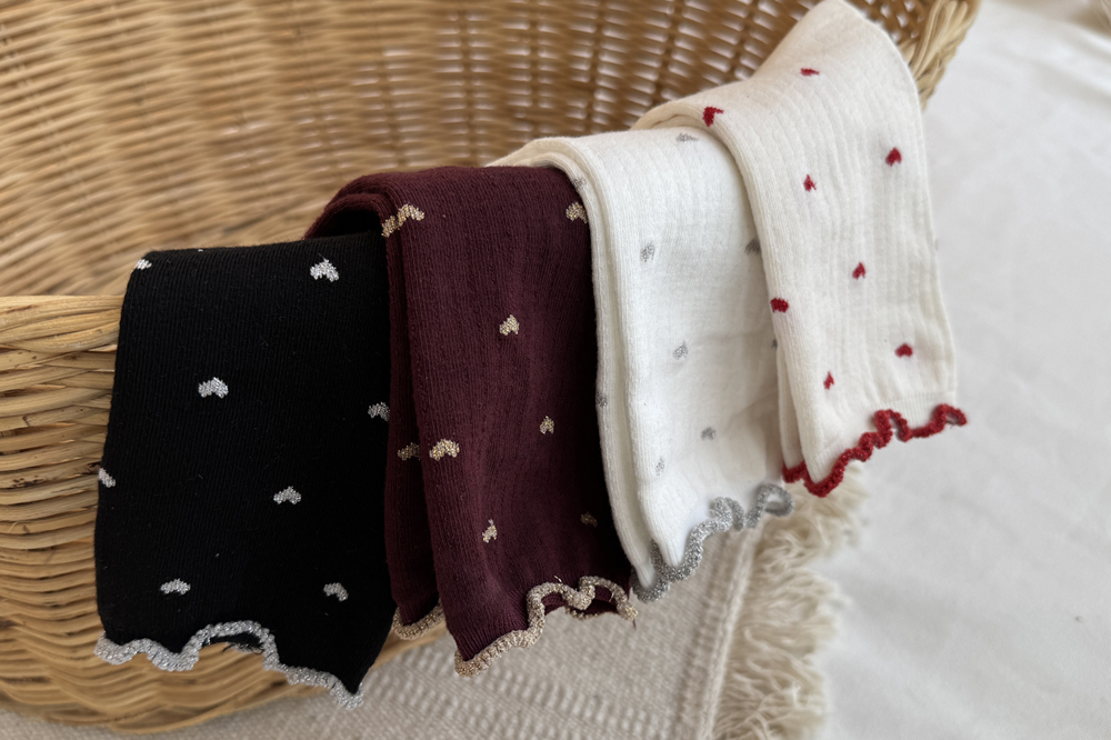하트 패턴이 뿅~뿅~! 포인트가 되어주며~ 색마다 다 다른 프릴 배색 디테일로 러블리함 가~득 담아낸 양말이에요^.^ 양말 하나로 룩에 한층 더 특별한 포인트를 줄 수 있는 아이템~ 은은하게 반짝임도 느껴진답니다>.< 다양한 룩에 매치하여 사랑스러움을 한층 UP ↑ 시켜보세요*♥*