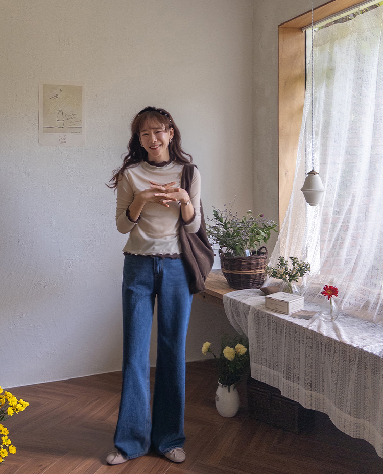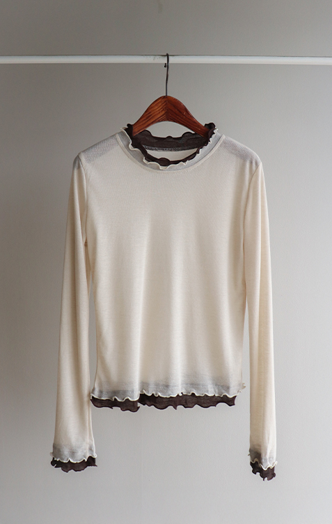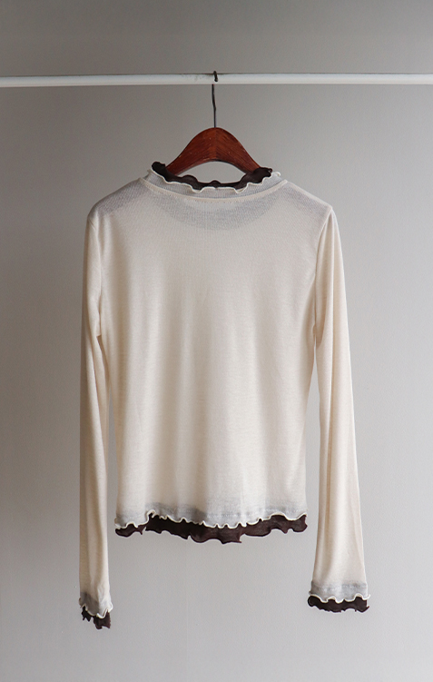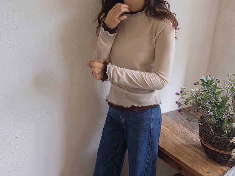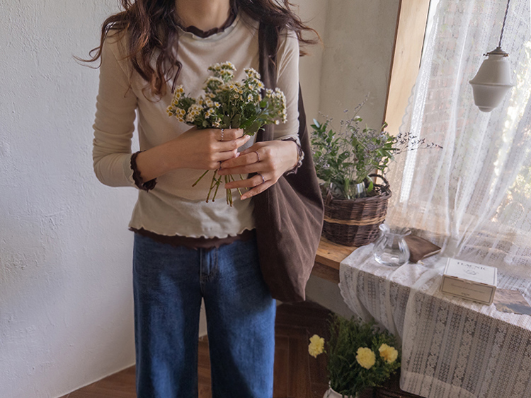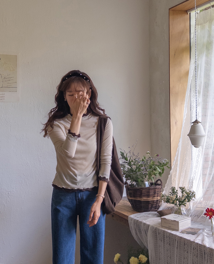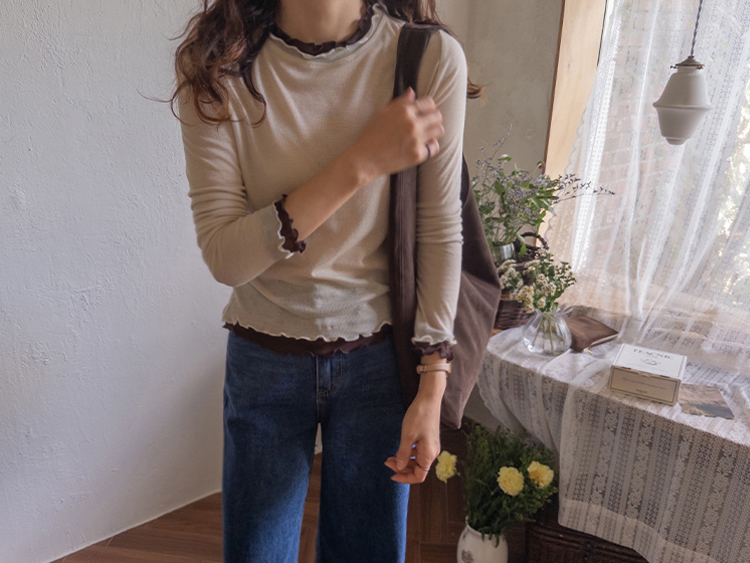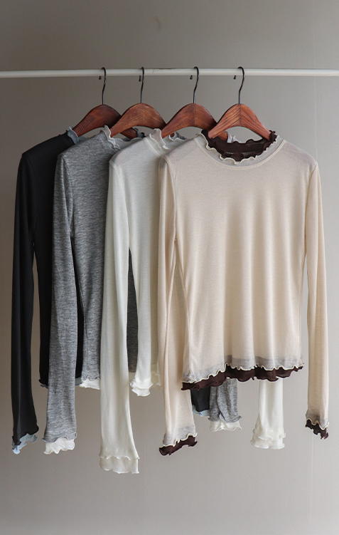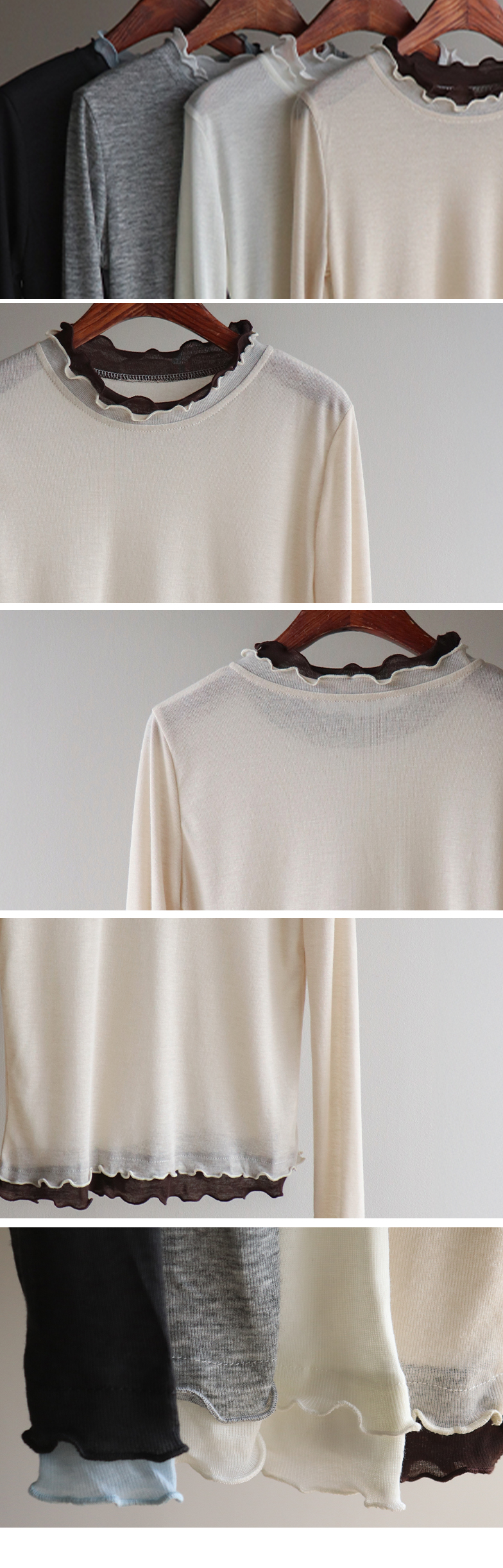 이너티 하나도 남들과는 다르게! 이중 프릴 디테일로 은근한 멋이 살아나는 티♥ 로맨틱한 프릴 끝단으로 페미닌한 매력을 더해주는 데일리 티셔츠~ 바디를 부드럽게 감싸는 슬림한 핏으로 다양한 아우터 속 이너로 입기에 아주 찰떡이랍니다~:) 쫀~득한 신축성으로 더욱 편안하게 입어지구요 컬러 배색으로 은근한 포인트가 살아나 더욱 매력있는 아웃핏이 완성된답니다!