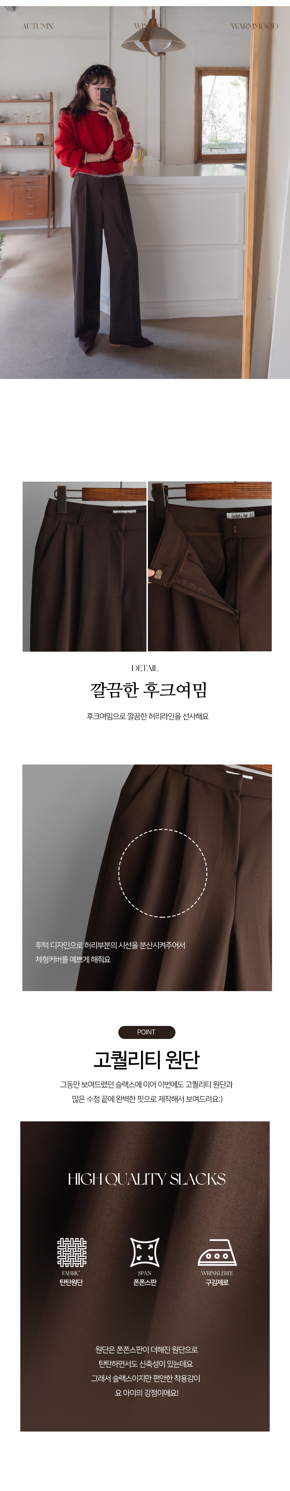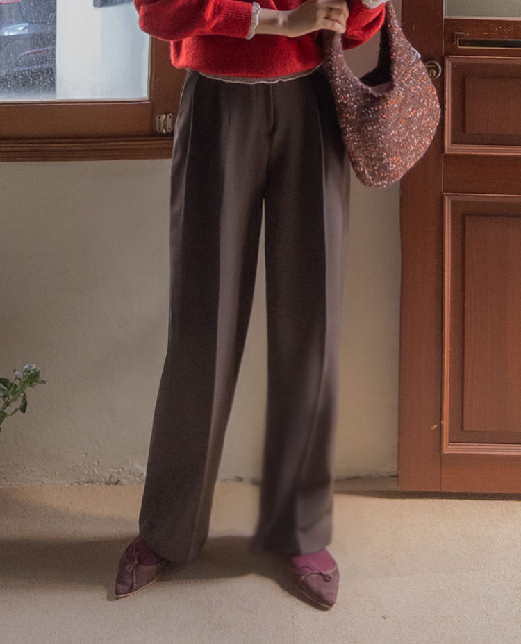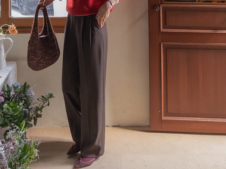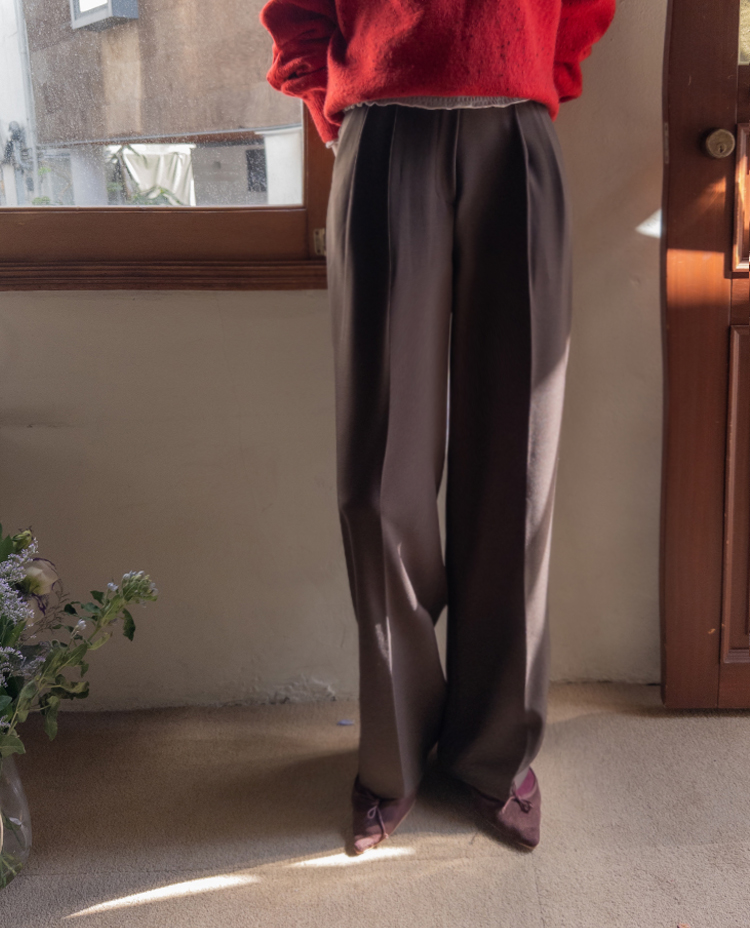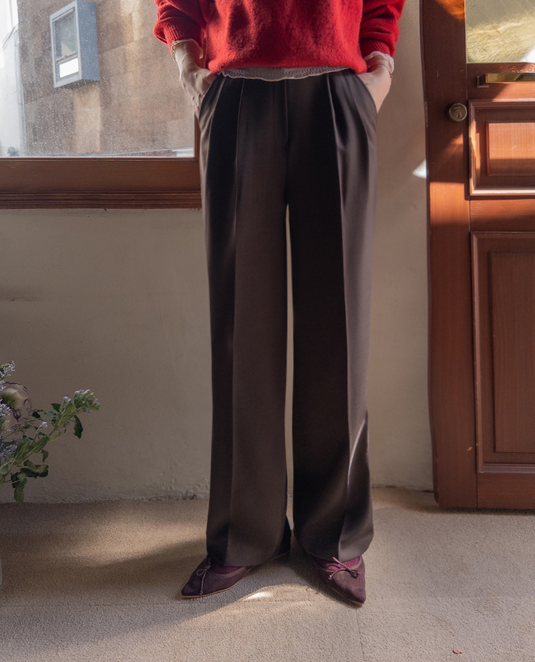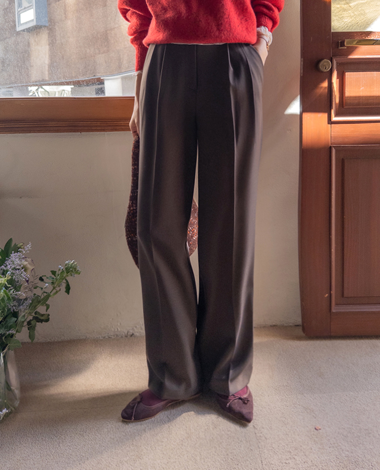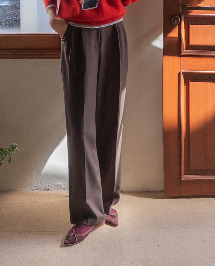 딥한 초코라떼같은 컬러감이 넘 매력적인,,♡ LIN.MADE 투턱 슬랙스 보여드릴게요~! 리린의 슬랙스는 정말 많은 분들이 좋아하시는데요ㅎㅎ 그동안 보여드렸던 슬랙스에 이어 이번에도 고퀄리티 원단과 많은 수정 끝에 완벽한 핏으로 제작해서 보여드려요:) 우선 원단은 쫀쫀 스판이 더해진 원단으로 탄탄하면서도 신축성이 있는데요 그래서 슬랙스이지만 편안한 착용감이 요 아이의 강점이에요! 게다가 후들후들~ 찰랑하게 떨어지고 링클프리 가공이 된 원단으로 구김도 없어서 하루종일 입어도 처음과 같은 최상의 퀄리티를 느껴보실 수 있으실 거에요~ 투턱 디자인으로 허리부분의 시선을 분산시켜주어서 체형커버도 가능하구요~ 세미와이드 실루엣으로 다리라인의 전체적인 커버도 가능해서 핏 또한 완벽하답니다ㅎㅎ 허리는 잘 잡아주면서 전체적으로 다리라인은 커버하고 다리가 길어보이게 만들어주는 실루엣을 위해 몇번을 수정해서 보여드리는 만큼 실제로 착용해보시면 더욱 만족스러우실 그런..♡ 안쪽 부분은 모두 가름솔 처리를 해주어서 착용시 울퉁불퉁 우는 부분 없이 깔끔한 실루엣으로 떨어진다는 점도 요 팬츠의 장점이에요*.* 블랙은 이미 많은 분들이 소장하고 계신만큼 어떤 컬러가 데일리로 부담없으면서도 고급스러울까 고민하다 딥한 브라운 컬러로 보여드려요~ 초코라떼같이 딥하고 무드감이 물씬 느껴지는 컬러까지 더해져 무엇하나 빠지지 않고 완벽한 팬츠이니 꼬옥 소장해주세요~♥