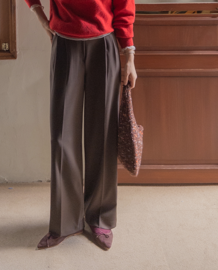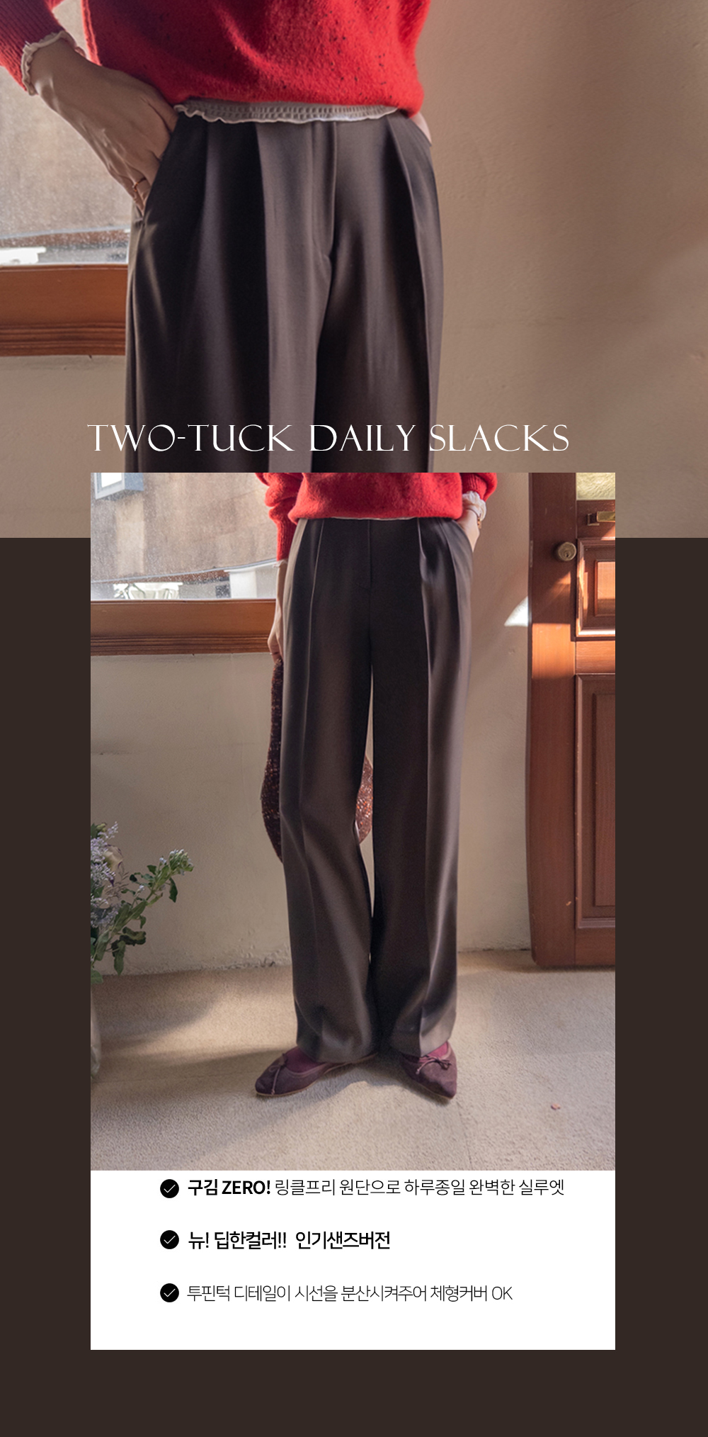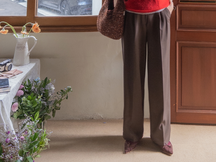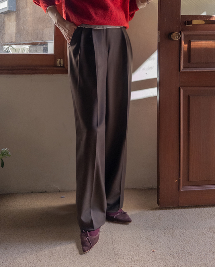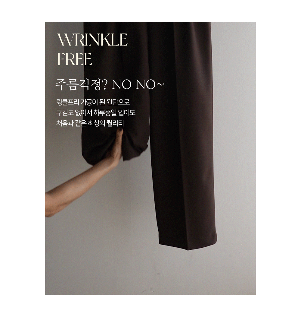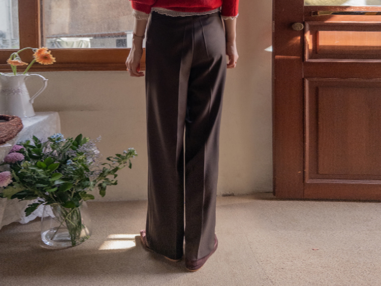 딥한 초코라떼같은 컬러감이 넘 매력적인,,♡ LIN.MADE 투턱 슬랙스 보여드릴게요~! 리린의 슬랙스는 정말 많은 분들이 좋아하시는데요ㅎㅎ 그동안 보여드렸던 슬랙스에 이어 이번에도 고퀄리티 원단과 많은 수정 끝에 완벽한 핏으로 제작해서 보여드려요:) 우선 원단은 쫀쫀 스판이 더해진 원단으로 탄탄하면서도 신축성이 있는데요 그래서 슬랙스이지만 편안한 착용감이 요 아이의 강점이에요! 게다가 후들후들~ 찰랑하게 떨어지고 링클프리 가공이 된 원단으로 구김도 없어서 하루종일 입어도 처음과 같은 최상의 퀄리티를 느껴보실 수 있으실 거에요~ 투턱 디자인으로 허리부분의 시선을 분산시켜주어서 체형커버도 가능하구요~ 세미와이드 실루엣으로 다리라인의 전체적인 커버도 가능해서 핏 또한 완벽하답니다ㅎㅎ 허리는 잘 잡아주면서 전체적으로 다리라인은 커버하고 다리가 길어보이게 만들어주는 실루엣을 위해 몇번을 수정해서 보여드리는 만큼 실제로 착용해보시면 더욱 만족스러우실 그런..♡ 안쪽 부분은 모두 가름솔 처리를 해주어서 착용시 울퉁불퉁 우는 부분 없이 깔끔한 실루엣으로 떨어진다는 점도 요 팬츠의 장점이에요*.* 블랙은 이미 많은 분들이 소장하고 계신만큼 어떤 컬러가 데일리로 부담없으면서도 고급스러울까 고민하다 딥한 브라운 컬러로 보여드려요~ 초코라떼같이 딥하고 무드감이 물씬 느껴지는 컬러까지 더해져 무엇하나 빠지지 않고 완벽한 팬츠이니 꼬옥 소장해주세요~♥