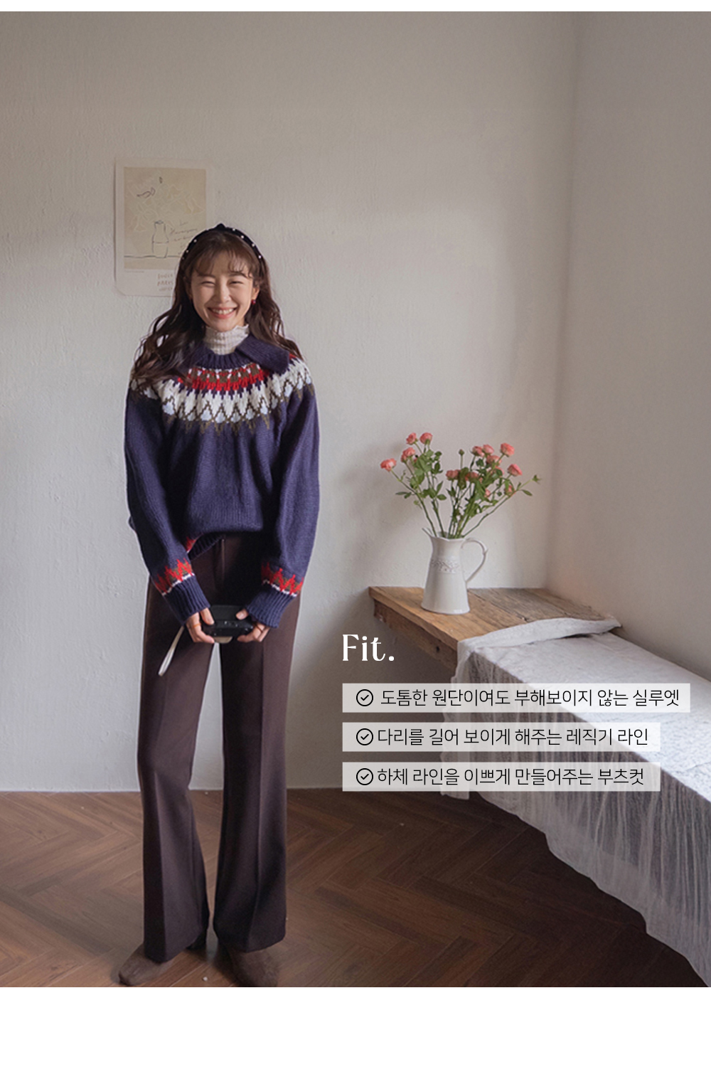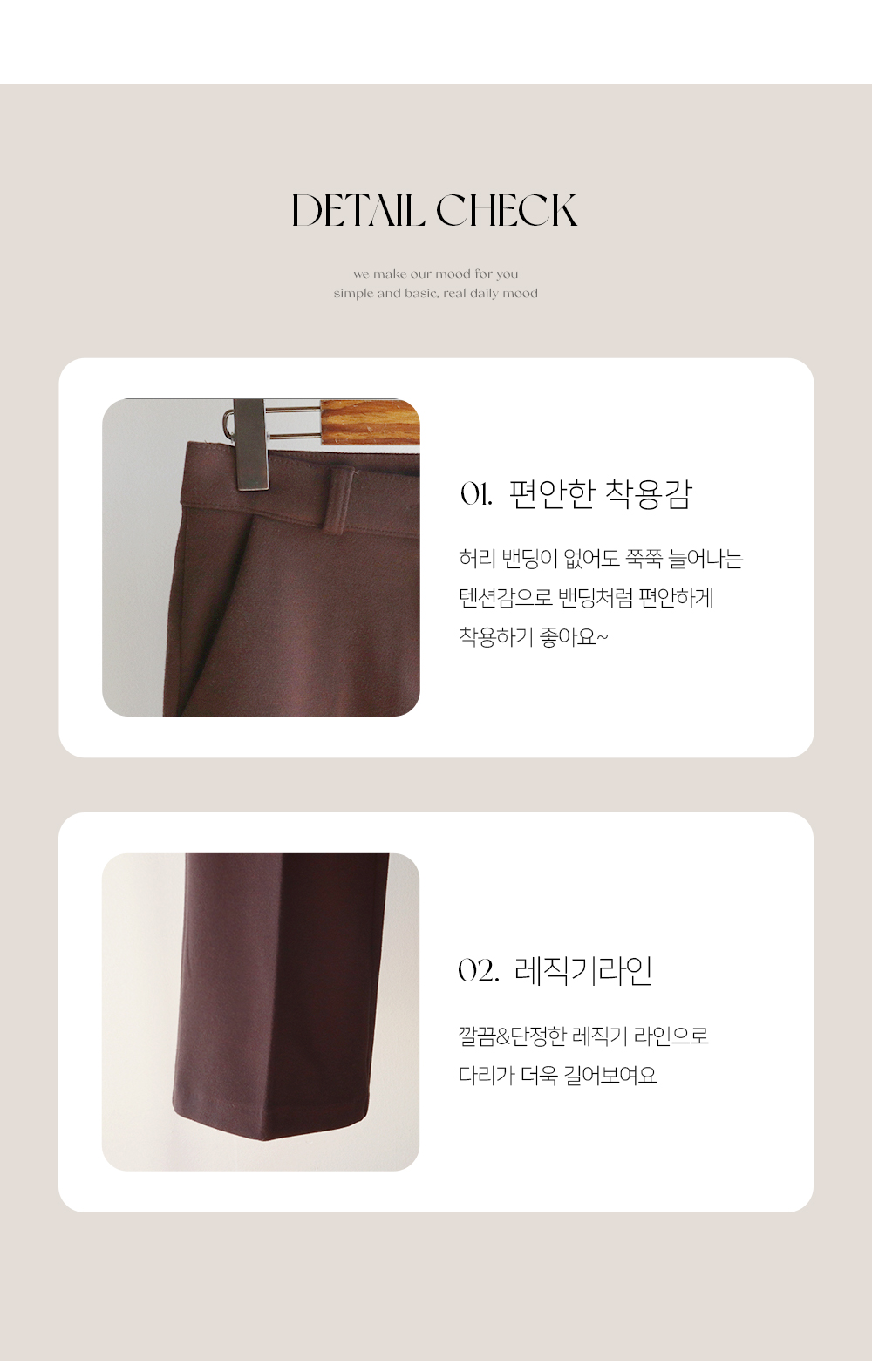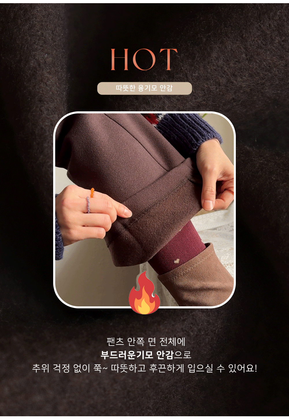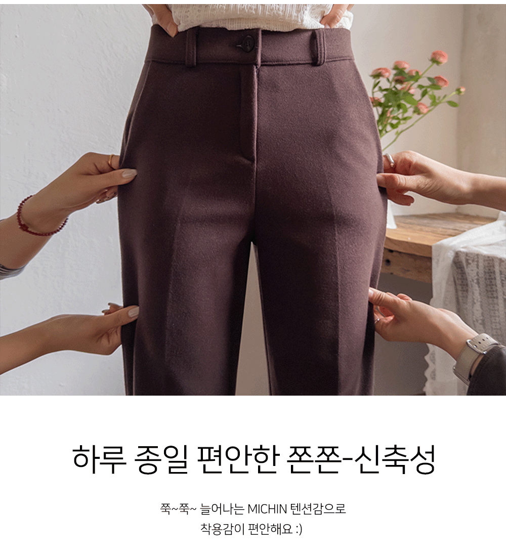하객룩/출근룩에 코디 할 데일리 슬랙스 찾으신다면~ 요 팬츠 추천드려요 ^^ 깔끔&단정한 레직기 라인과 부츠컷 조합으로 다리를 길고~ 곧게 만들어주는 마법 !! 보송~따뜻한 안감 기모로 한겨울에도 추위 걱정없이 쭉~ 오래 입을 수 있어요 ㅎㅎ 사진과 영상으로 보여지는 텐션감 느껴지실까여~? 정말 쭉!쭉! 늘어나는 MICHIN 텐션감의 원단으로 허리밴딩이 없음에도 쭉~ 쭉~ 늘어나는,,,*.* 겨울 데일리 코디템은 요 팬츠로 준비해주세요 ~♥