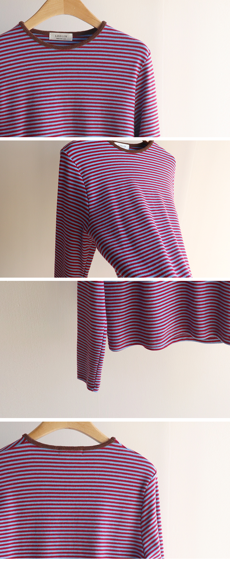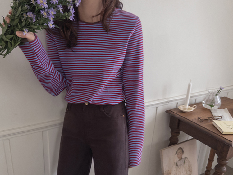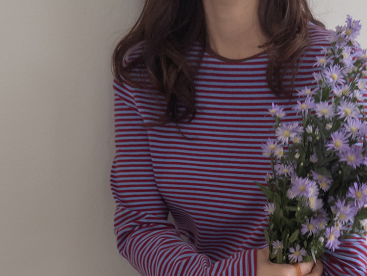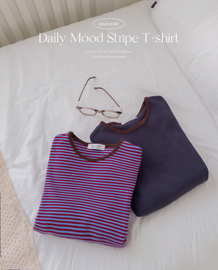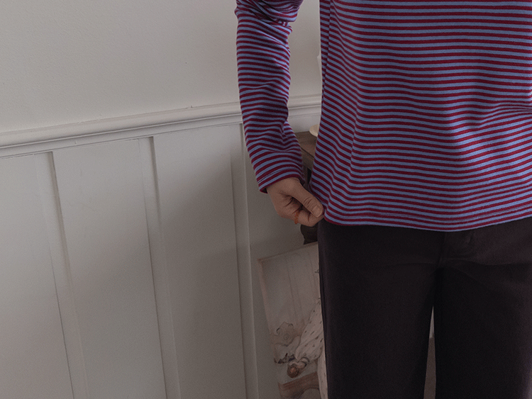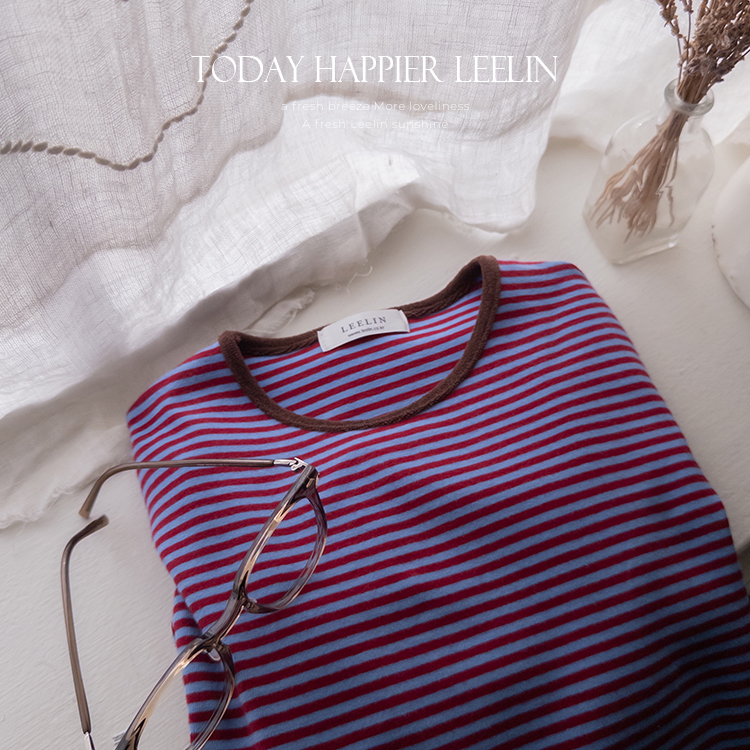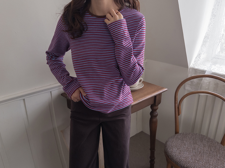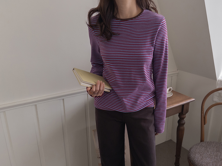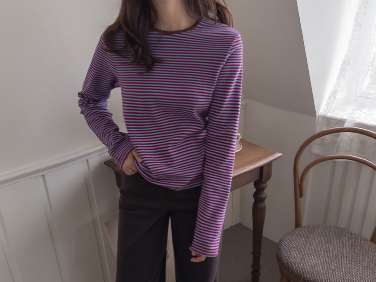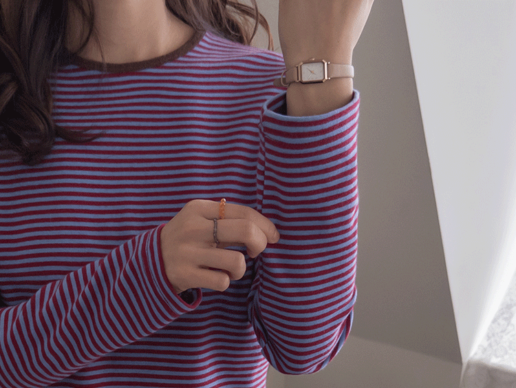 치즈처럼 쭈~욱 늘어나는 스판력 200% 원단에 넘 부드럽고 도톰한 원단으로 FW시즌내내 예쁘면서도 편하게 착용될 티셔츠 보여드려요~! 요 티셔츠, 우선 배색도 너무 예쁜데 원단까지 좋아서 실제로 입어보시면 누구나 푹 빠져버릴 그런 티셔츠에요ㅎㅎ 우선 원단이 너무 보드랍고 살짝 두께감이 있어서 추운 겨울시즌까지 휘뚤마뚤 입기 좋은 그런 원단이구요 신축성은 또 얼마나 좋은지, 쭈우우욱! 잘 늘어나는 소재라서 착용하시면 바디에 부드럽고 편하게 감기는 착용감으로 입어보시면 반해버릴 수밖에 없는 그런 아이에요:) 스탠다드한 실루엣으로 체형에 큰 구애없이 누구나 편하게 착용되는건 물론이구요 요 티셔츠의 포인트! 바로 넥부분 배색이랍니다ㅎㅎ 테리 소재의 원단으로 넥부분 마감을 해주었는데요 소재도 다르고 배색처리가 되어서 티셔츠이지만 한끗 디테일을 더해주었어요~ 원단 자체의 컬러도 리린 제작이니만큼 오직 리린에서만 볼 수 있는, 통통 튀는 매력이 있는 배색 스트라이프로 셀렉해주어서 단독 또는 가디건이나 니트 안에 레이어드로 입어주시기 넘 좋답니다>< 탄탄 봉제 퀄리티까지 더해져 하나쯤 소장하시면 후회없이 매 시즌마다 유행타지 않고 입기 좋으니 취향에 따라 소장해주세요~!♡