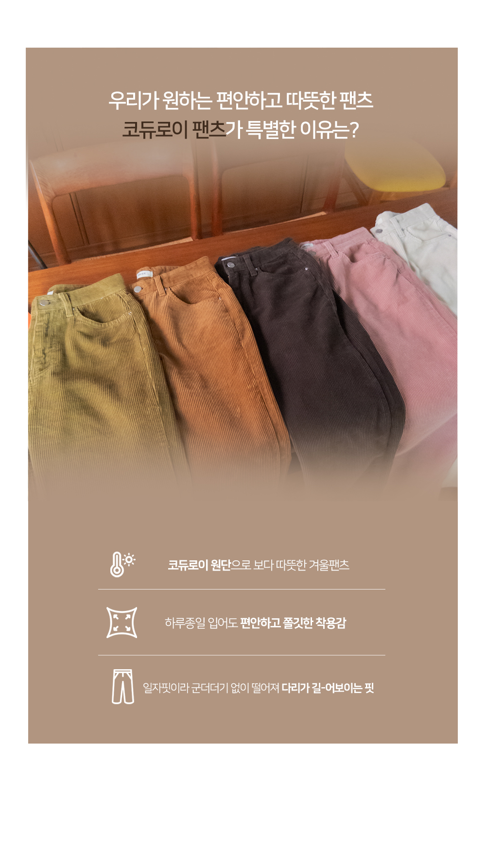 겨울시즌이 찾아오니 코듀로이 팬츠, 꼭 필요하죠~ 겨울 내내 포근하게 즐기기 좋은 팬츠 소개드려요🤍 늘씬~ 입자마자 모델&엠디 모두 감탄했던!! 과하지않은 와이드핏이라 오히려 더 늘씬~ 길쭉~ 대게다리처럼 쭉~ 뻗은 핏이 정말 이뻤어요~ 일자핏이라 군더더기 없이 떨어져 어떤 상의와도 쉽게 매치 가능! 텐션감도 좋고~ 허리 안쪽 밴딩까지 더해져 활동성 GOOD! 겨울시즌에 찰떡인 분위기있는 컬러감으로 다양한 컬러웨이로 구성되어 여러컬러 소장도 추천 ^^ 겨울 데일리룩의 정석, 데일리 골덴 일자팬츠로 올겨울 따뜻하고 예쁘게 보내세요❄️
