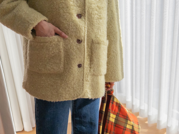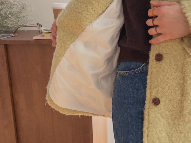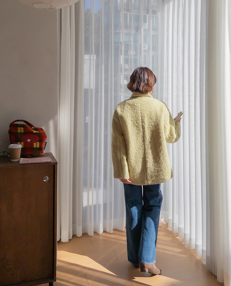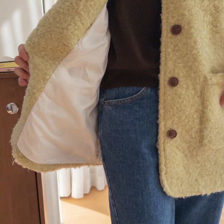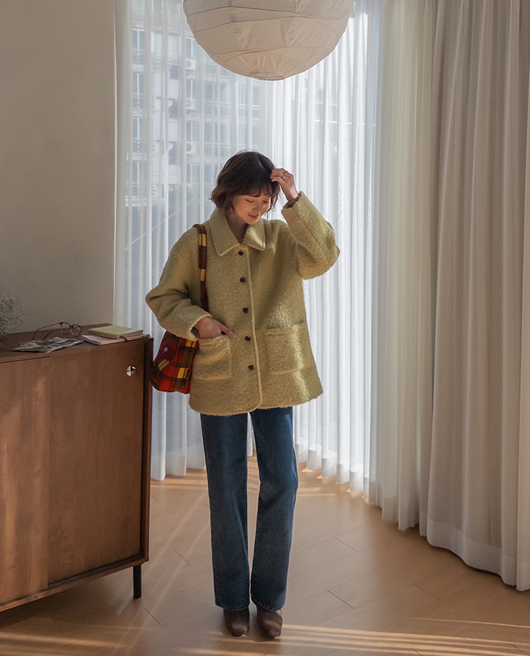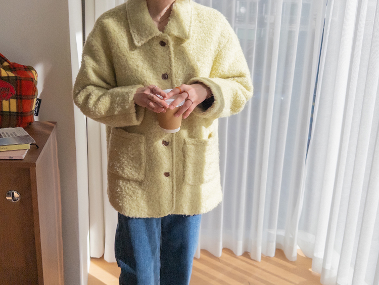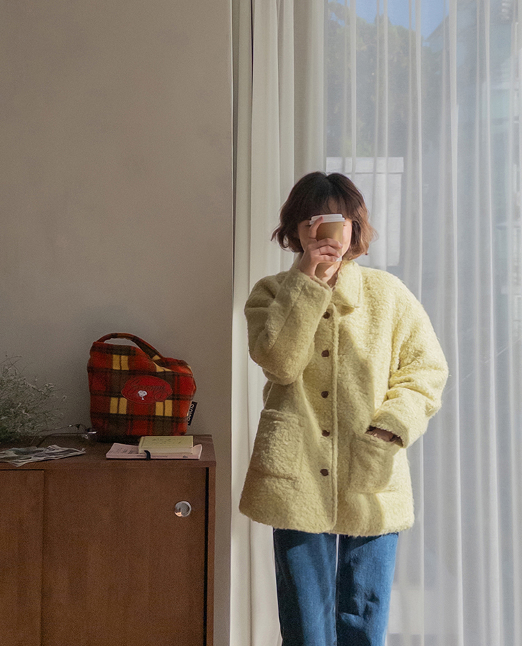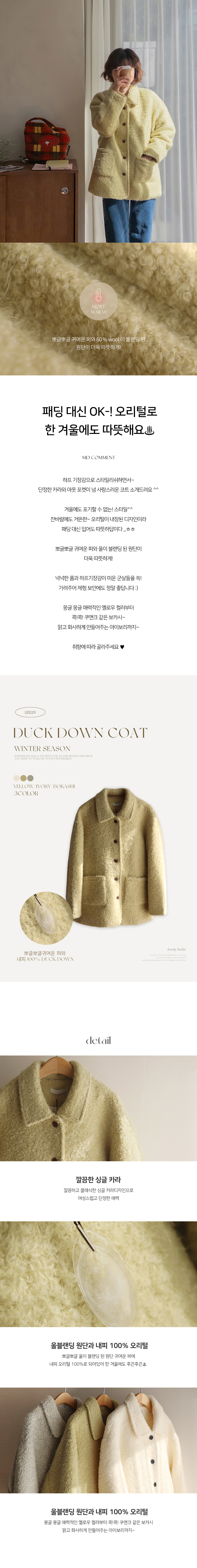 하프 기장감으로 스타일리쉬하면서~ 단정한 카라와 아웃 포켓이 넘 사랑스러운 코트 소개드려요 ^^ 겨울에도 포기할 수 없는! 스타일^^ 찬바람에도 거뜬한~ 오리털이 내장된 디자인이라 패딩 대신 입어도 따뜻하답이다 ,,ㅎㅎ 뽀글뽀글 귀여운 퍼와 울이 블랜딩 된 원단이 더욱 따뜻하게! 넉넉한 품과 하프기장감이 미운 군살들을 쏙! 가려주어 체형 보안에도 정말 좋답니다 :) 몽글 몽글 매력적인 옐로우 컬러부터 콕!콕! 쿠앤크 같은 보카시~ 맑고 화사하게 만들어주는 아이보리까지~ 취향에 따라 골라주세요 ♥