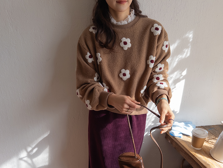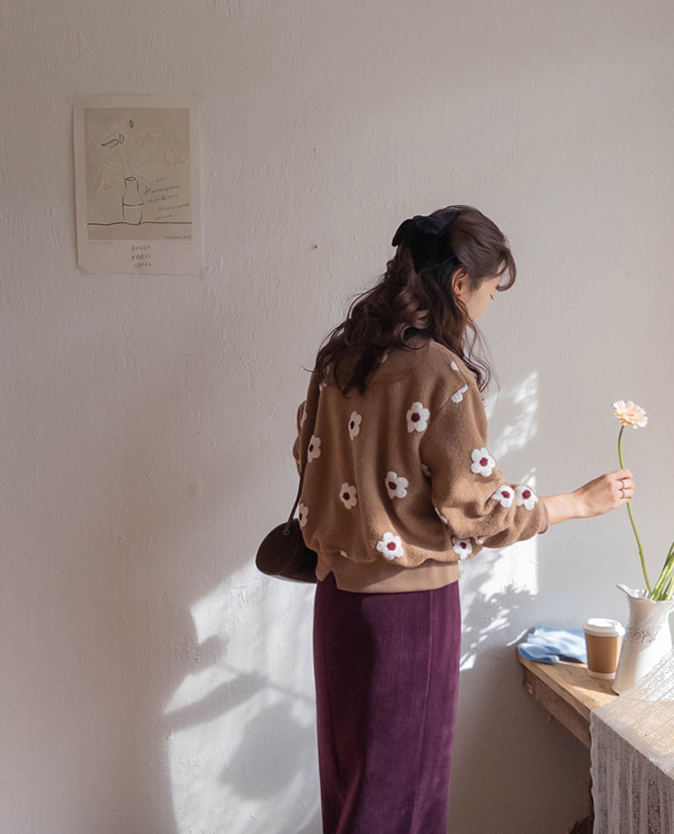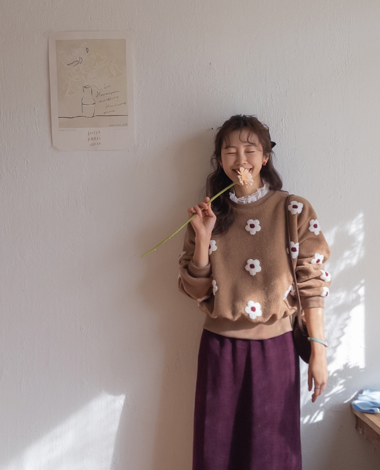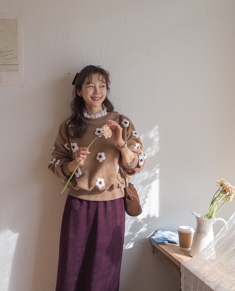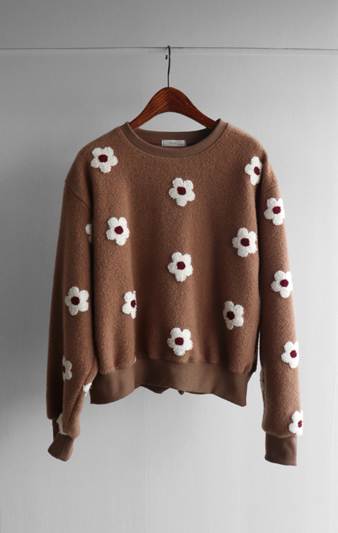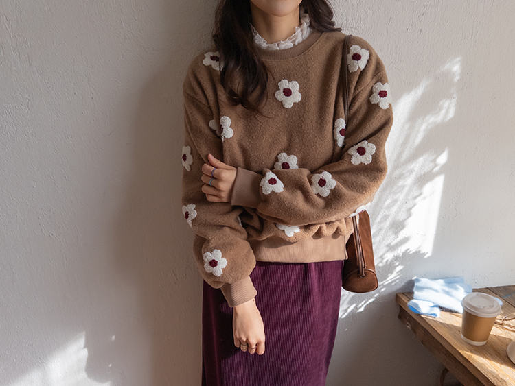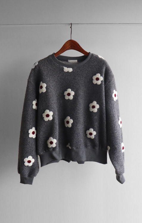 입체감이 느껴지는 플라워 자수 패턴이 뿅뿅 박혀있어 러블리함이 극대화된 맨투맨 티셔츠에요 :) 요 아이템 하나만 있어도 룩에 톡톡한 포인트가 되면서도 과한 느낌 없이 데일리룩으로 활용도가 정말 높아요~! 부들~부들~ 기분좋은 터치감으로 하루종일 입어도 포근함이 가득해요~♥.♥ 코튼소재가 아닌 니트소재의 맨투맨이라 청바지, 치마, 슬랙스 등 어떤 아이템과 매치해도 데일리룩의 톡톡한 포인트가 되구요~ 차분하고 따뜻한 감성이 느껴지는 브라운, 그레이 두가지 색상으로 준비되어 있어요💕 살짝 넉넉한 품으로 이너와 레이어드해서 입으면 여성스럽고 귀여운 무드가 UP!!되는 아이템이랍니다~^^