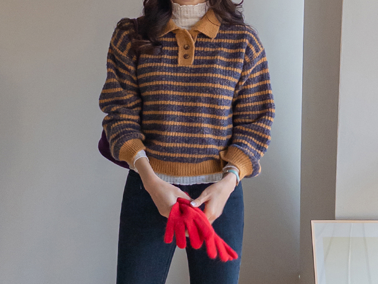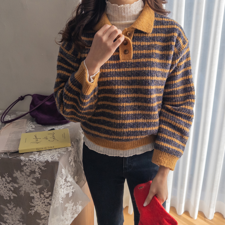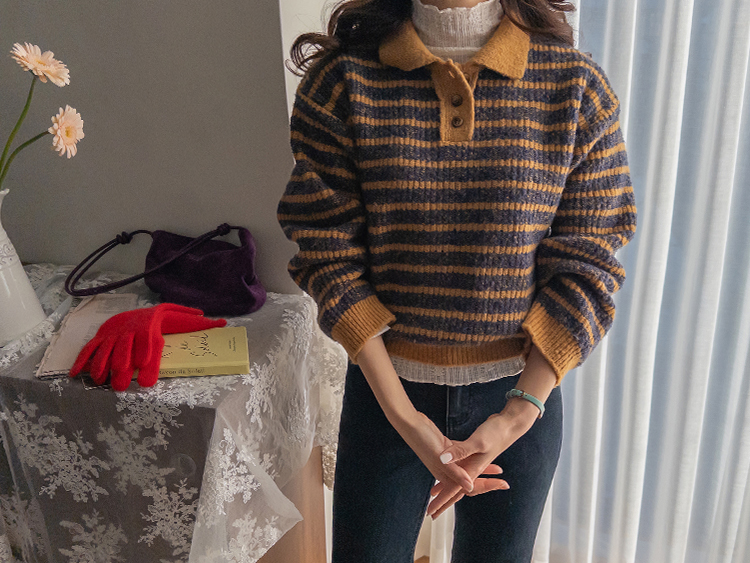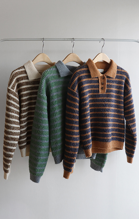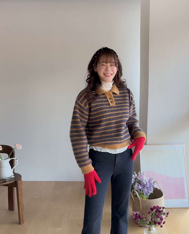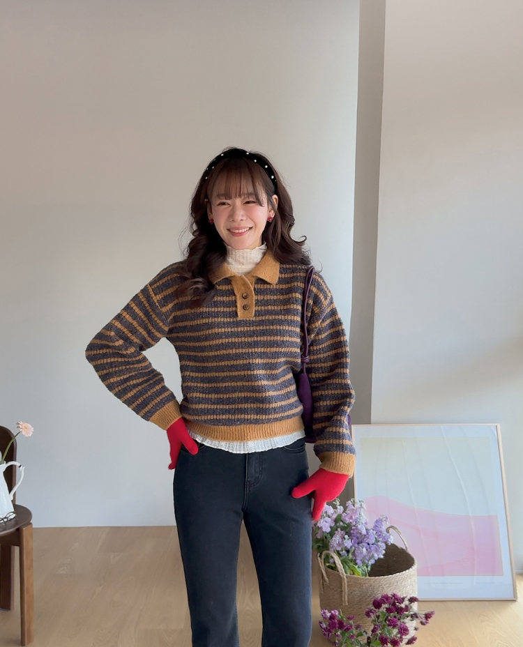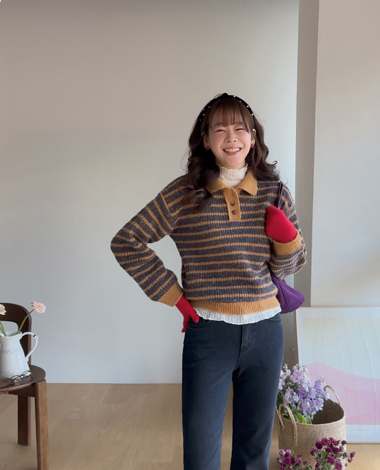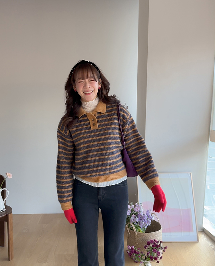 따뜻하고 포근한 무드가 느껴지는 색감의 스트라이프 패턴이 입는 순간 빈티지하면서도 귀여운 분위기를 만들어주는 니트예요:) 카라넥 디자인에 버튼이 더해져 단정하고 러블리한 포인트가 살아나고, 도톰한 짜임으로 겨울에도 포근하게 착용 가능해요☃️ 너무 오버핏도 크롭핏도 아닌 적당히 알맞은 세미 크롭 기장감으로 부담스럽지 않답니다^.^ 베이지, 아이보리, 그레이 3컬러로 준비되어 있구요~ 모두 활용도가 높은 컬러라 데일리룩으로 손이 많이 가실 거에요~ 굿 초이스 해주세요~💕