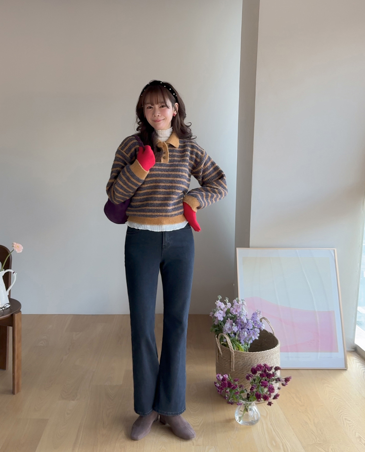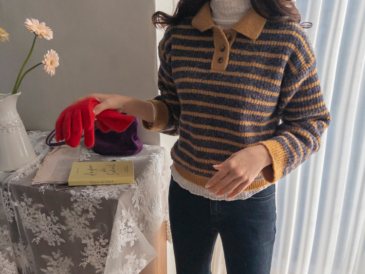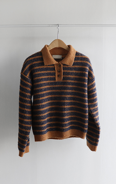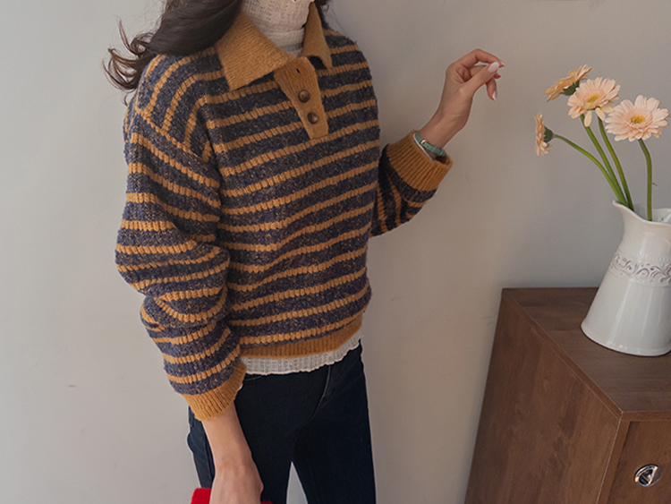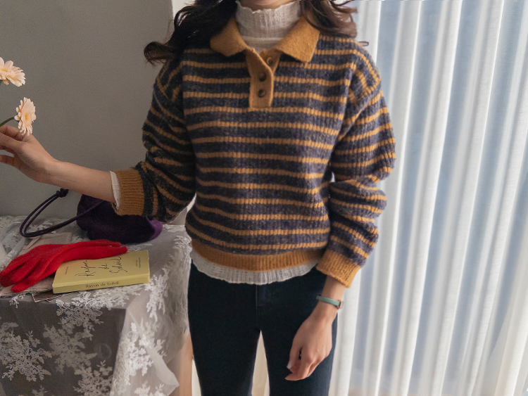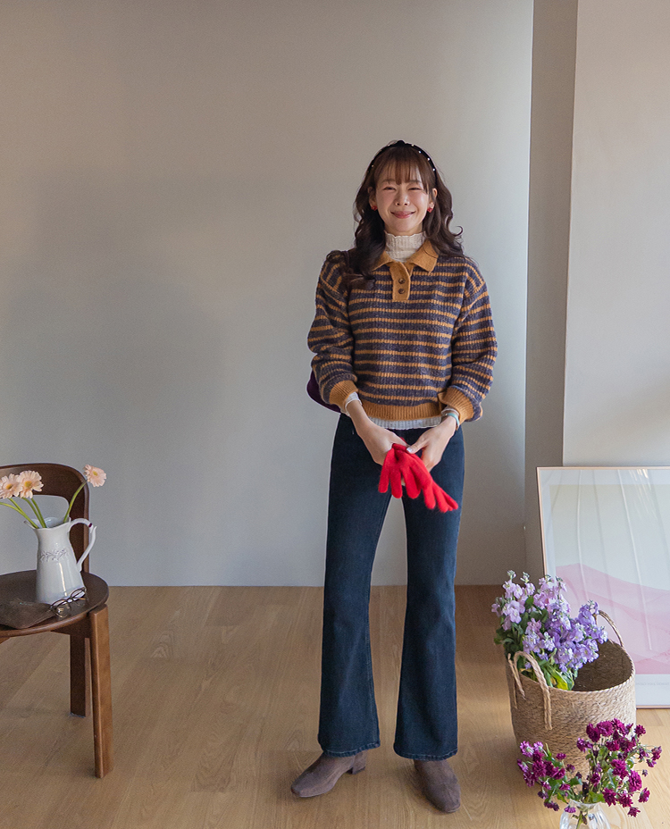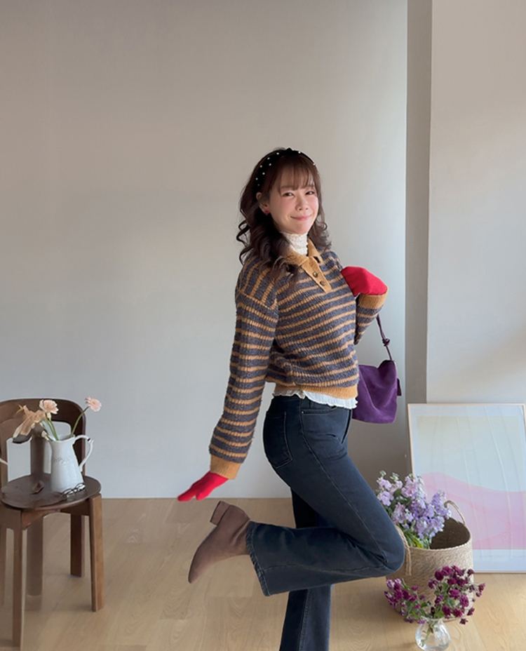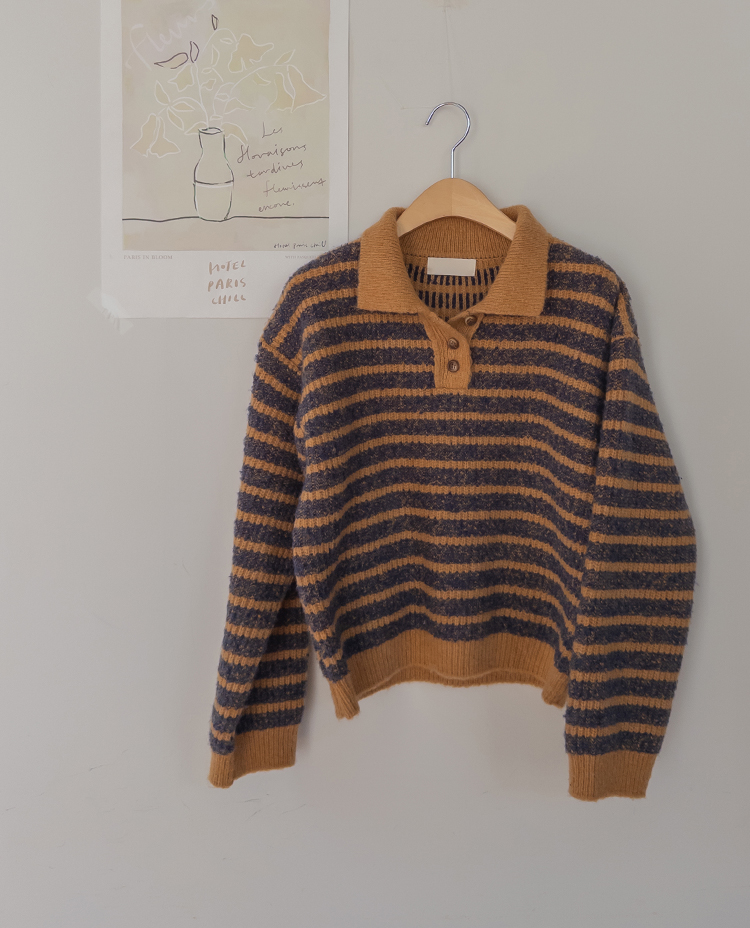 따뜻하고 포근한 무드가 느껴지는 색감의 스트라이프 패턴이 입는 순간 빈티지하면서도 귀여운 분위기를 만들어주는 니트예요:) 카라넥 디자인에 버튼이 더해져 단정하고 러블리한 포인트가 살아나고, 도톰한 짜임으로 겨울에도 포근하게 착용 가능해요☃️ 너무 오버핏도 크롭핏도 아닌 적당히 알맞은 세미 크롭 기장감으로 부담스럽지 않답니다^.^ 베이지, 아이보리, 그레이 3컬러로 준비되어 있구요~ 모두 활용도가 높은 컬러라 데일리룩으로 손이 많이 가실 거에요~ 굿 초이스 해주세요~💕