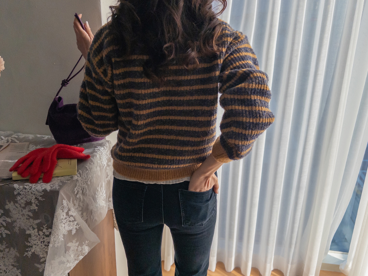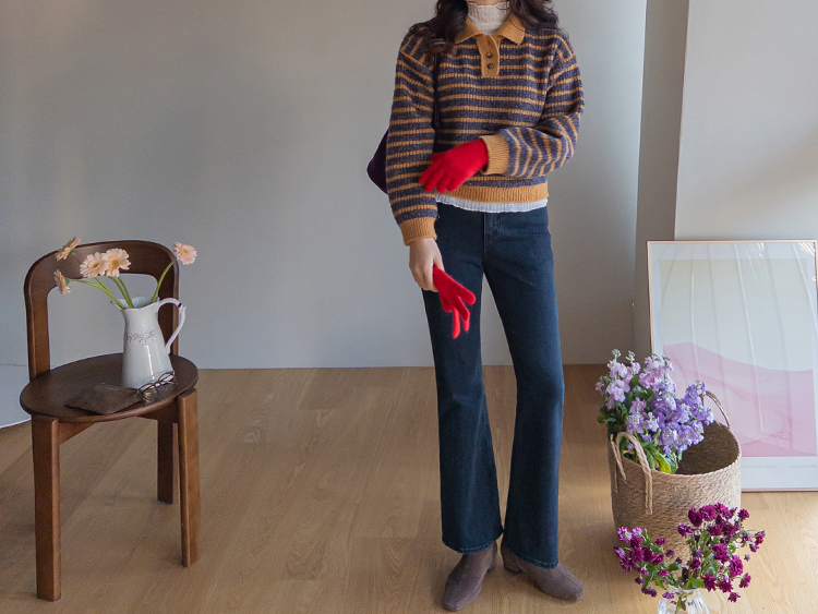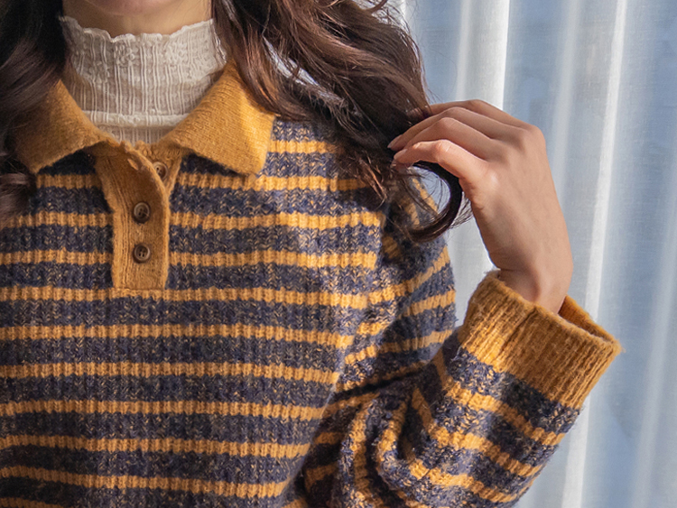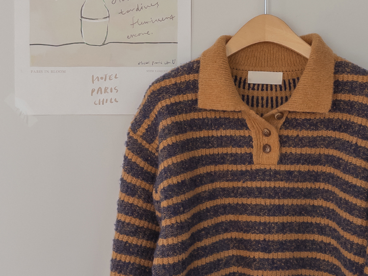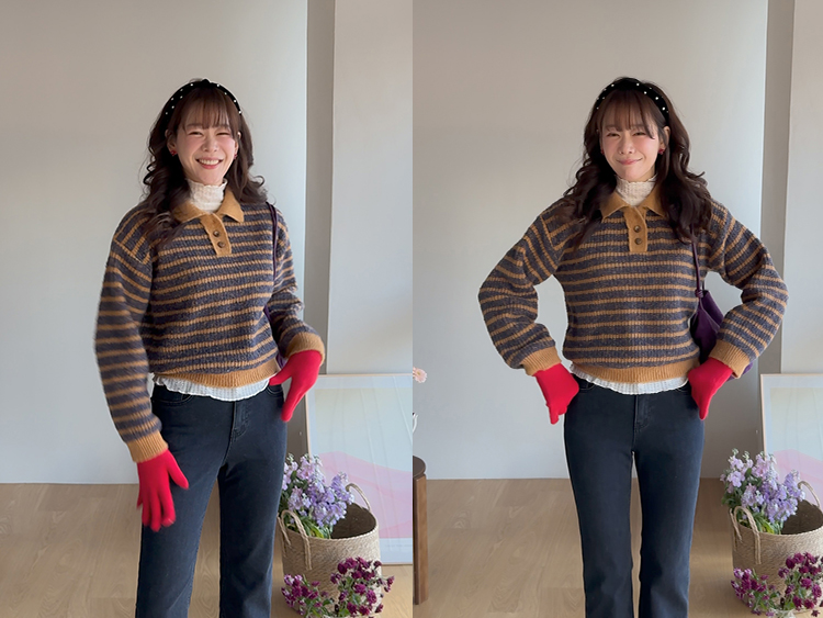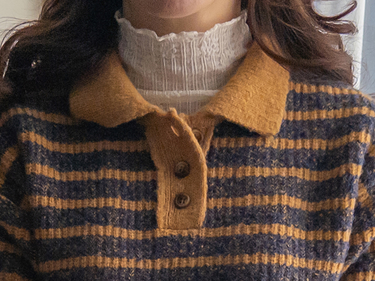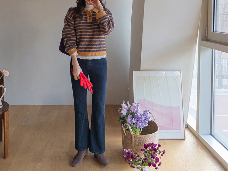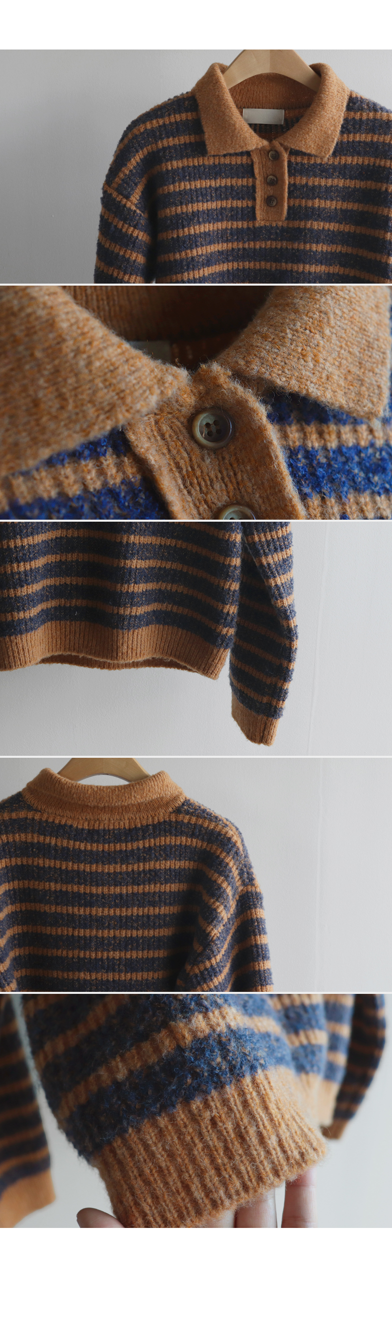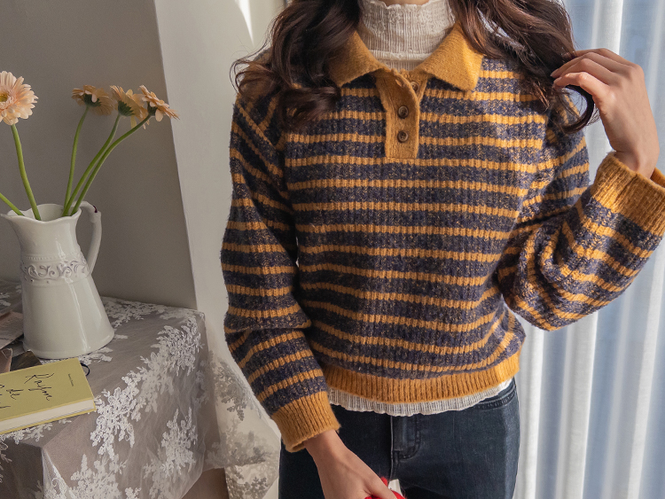 따뜻하고 포근한 무드가 느껴지는 색감의 스트라이프 패턴이 입는 순간 빈티지하면서도 귀여운 분위기를 만들어주는 니트예요:) 카라넥 디자인에 버튼이 더해져 단정하고 러블리한 포인트가 살아나고, 도톰한 짜임으로 겨울에도 포근하게 착용 가능해요☃️ 너무 오버핏도 크롭핏도 아닌 적당히 알맞은 세미 크롭 기장감으로 부담스럽지 않답니다^.^ 베이지, 아이보리, 그레이 3컬러로 준비되어 있구요~ 모두 활용도가 높은 컬러라 데일리룩으로 손이 많이 가실 거에요~ 굿 초이스 해주세요~💕