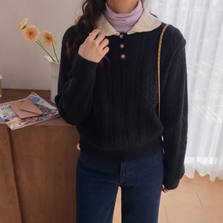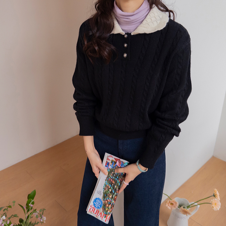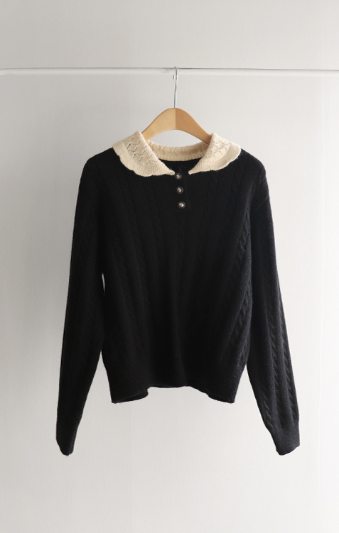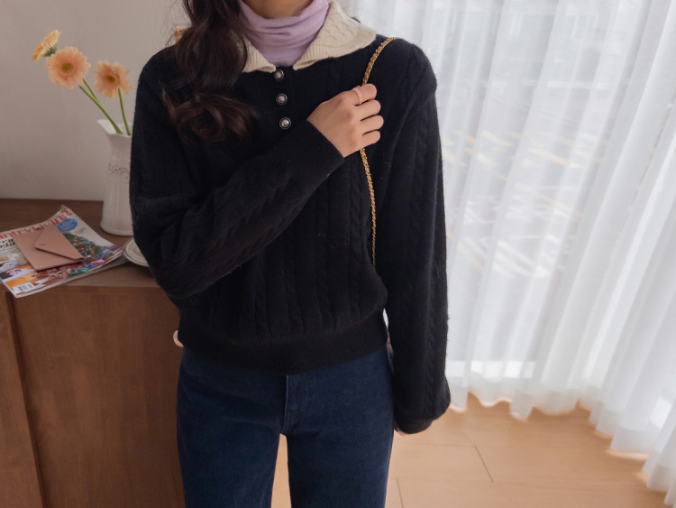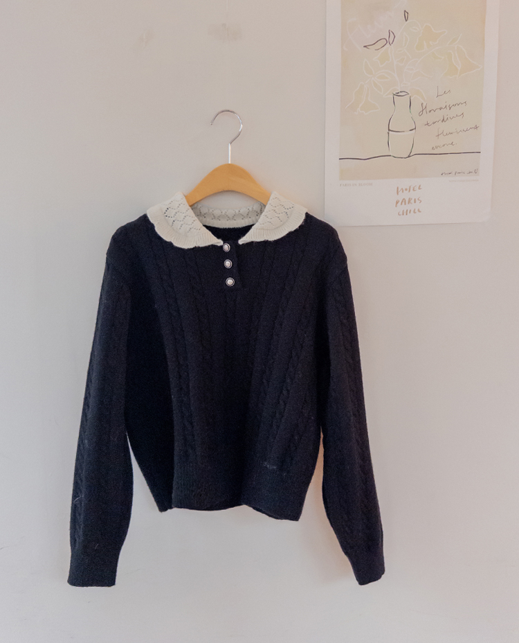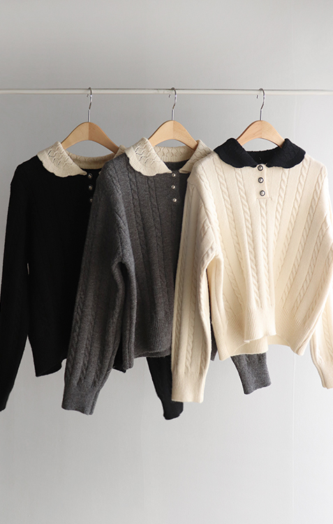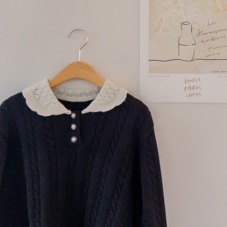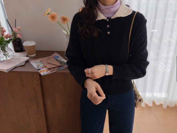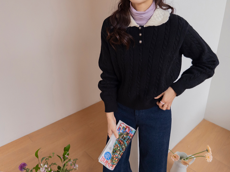 카라에 더해진 레이스 배색이 얼굴을 화사하게 밝혀주면서 러블리하고 여성스러운 분위기를 UP시켜주는 니트에요^.^ 고급스러움이 느껴지는 버튼 디테일과 탄탄함이 느껴지는 고퀄리티 원단으로 한 계절만 입고 버리는 게 아닌 오래~오래 입을 고퀄리티 니트랍니다✨ 꽈배기 짜임 디자인으로 겨울 특유의 포근한 감성이 느껴지고 단독으로 입어도 충분히 포인트 되는 아이템이에요~ 데님, 스커트, 슬랙스 어디에나 잘 어울려 데일리룩부터 데이트룩까지 자주 손이 갈 니트로 추천드려요~♡
