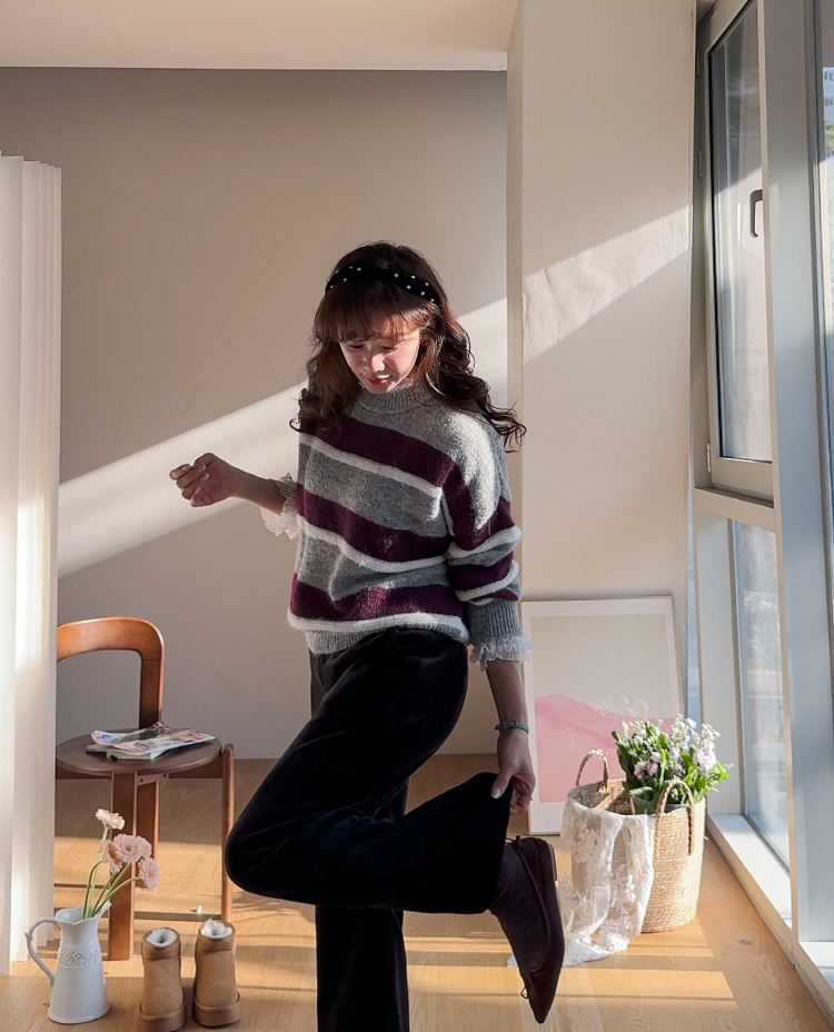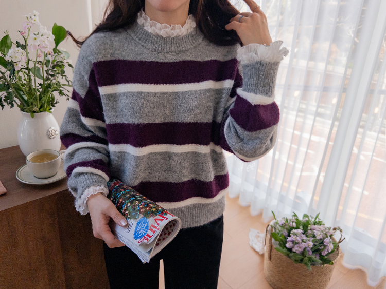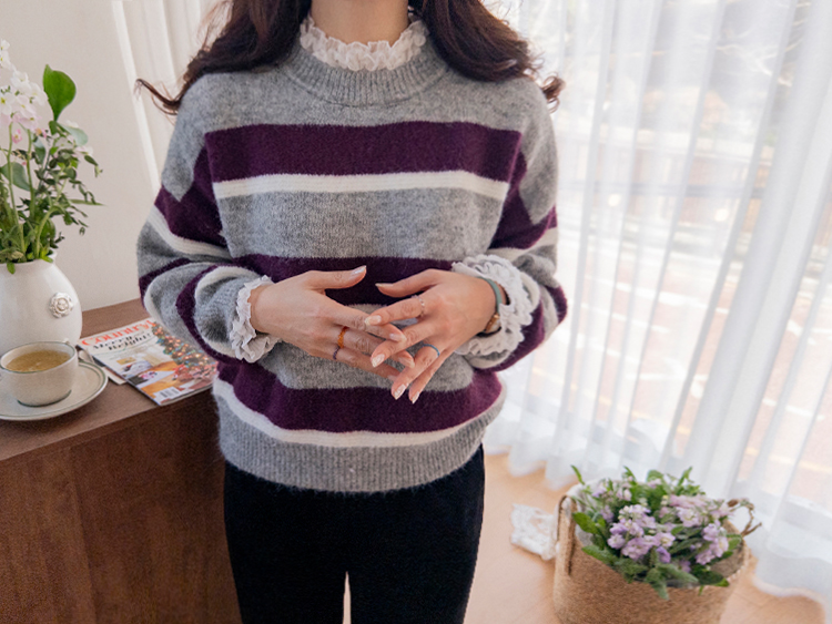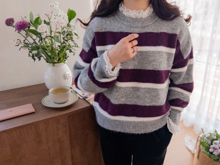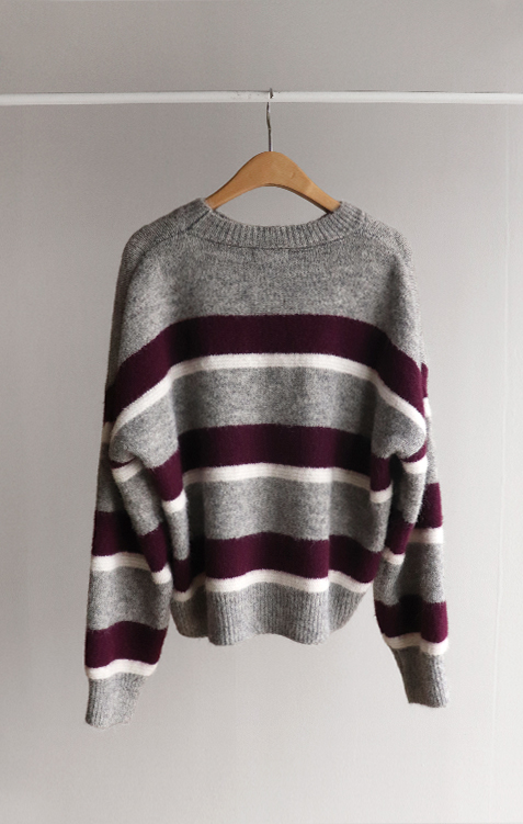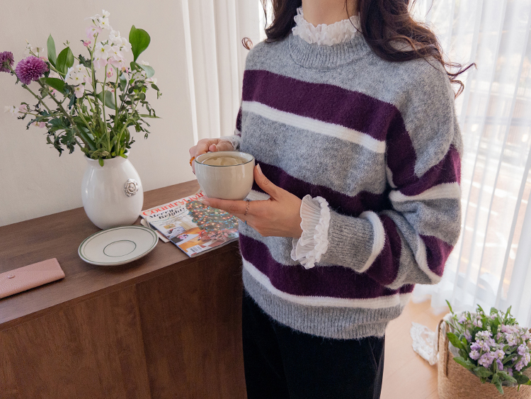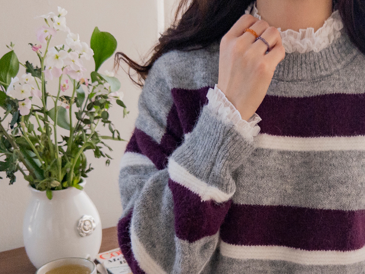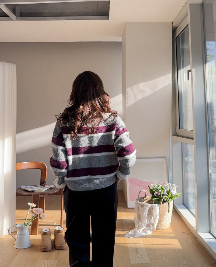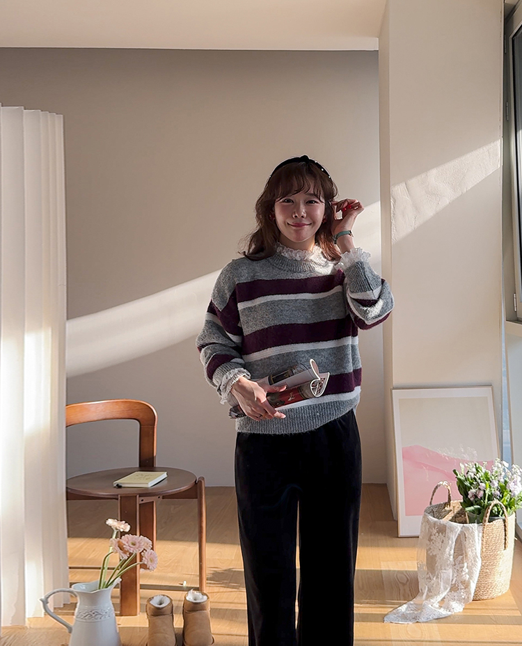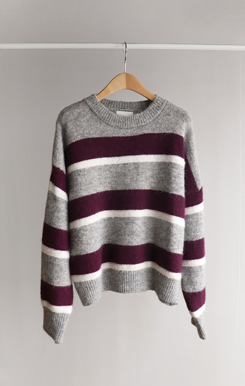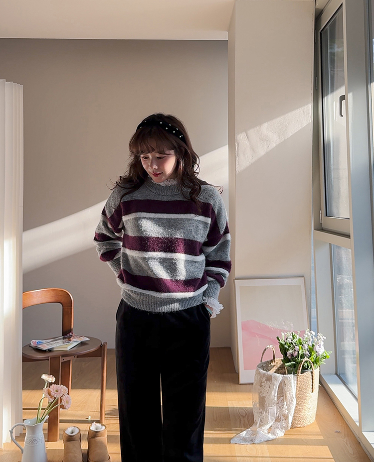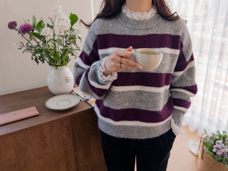 겨울 시즌 데일리로 입기 좋은 니트♥ 스트라이프 패턴으로 포인트가 되구요~ 부들부들한 니트 원단으로 까슬거림 없이 편안함 GOOD!! 적당한 두께감이라 단독 착용은 물론 아우터 이너로도 좋아요~ 컬러 배색이 예뻐서 코디 고민 없이 툭 입기 좋은 니트! 데일리템으로 적극 추천드려요♥