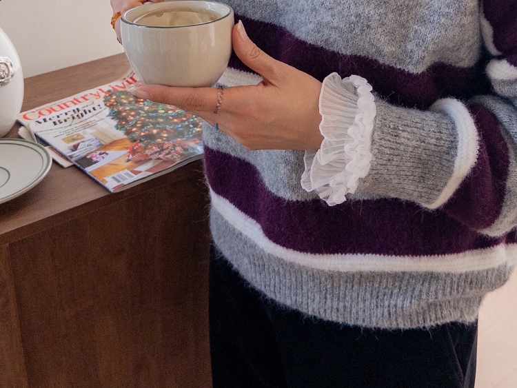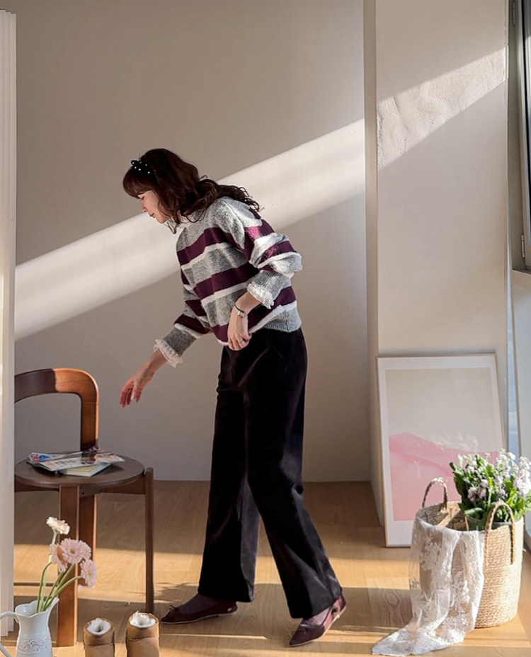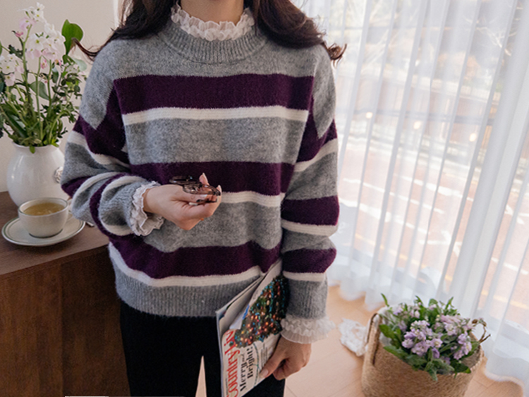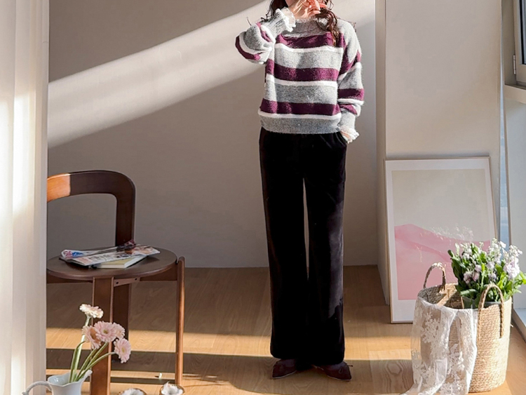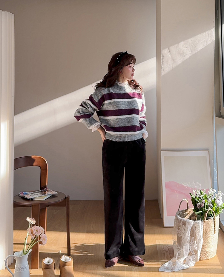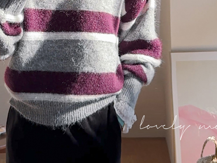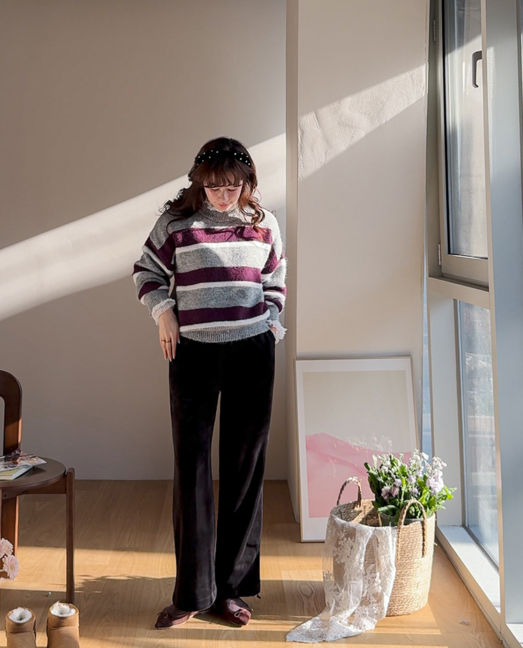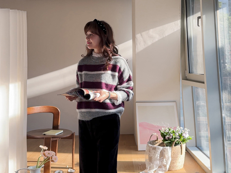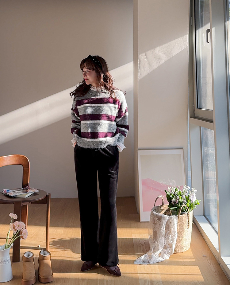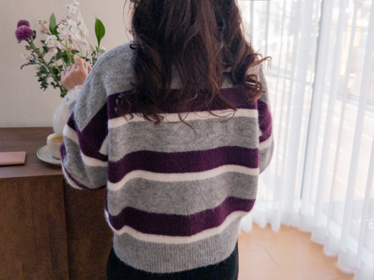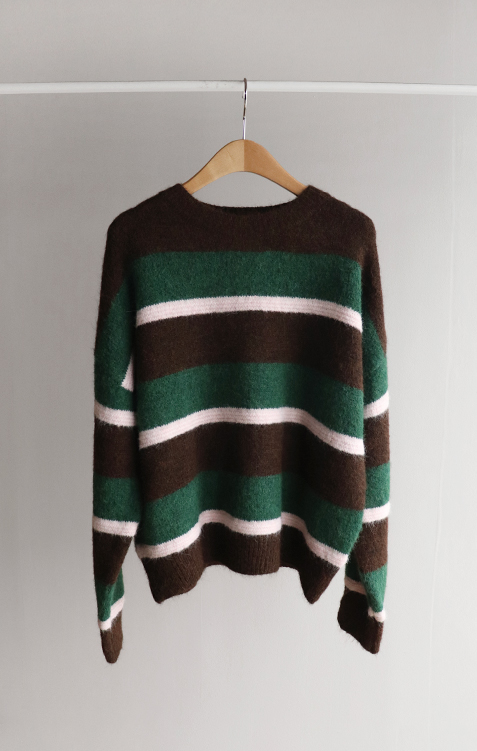 겨울 시즌 데일리로 입기 좋은 니트♥ 스트라이프 패턴으로 포인트가 되구요~ 부들부들한 니트 원단으로 까슬거림 없이 편안함 GOOD!! 적당한 두께감이라 단독 착용은 물론 아우터 이너로도 좋아요~ 컬러 배색이 예뻐서 코디 고민 없이 툭 입기 좋은 니트! 데일리템으로 적극 추천드려요♥