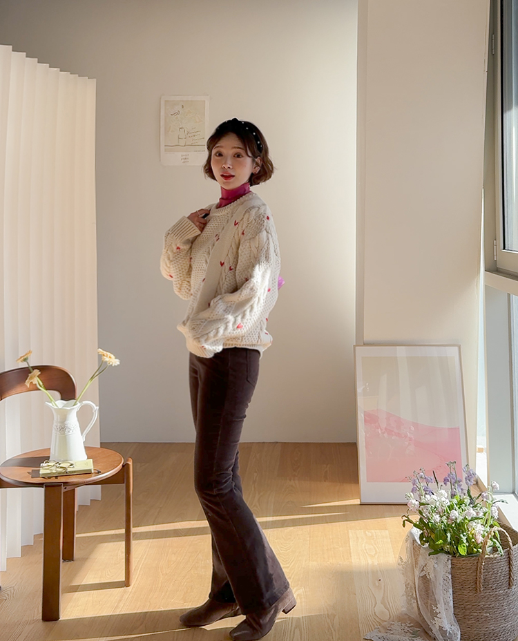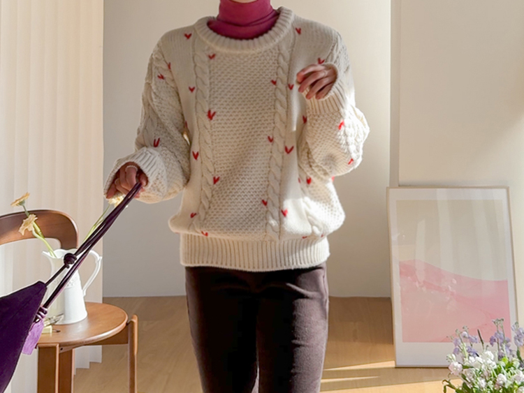 하트 패턴으로 러블리함이 가~득 느껴지며 룩에 포인트가 되어 줄 니트 보여드려요! 귀여운 하트 디테일뿐만 아니라 케이블 짜임으로 밋밋해 보이지 않고 너무 예뻤어요^~^ 울 60% 블렌딩 소재로 도톰하고 따듯한데 여리~여리한 실루엣을 만들어 주는 니트랍니다ㅎㅎ! 살짝의 여유가 있는 핏으로 편하게 즐기기 좋은 사랑스러운 요 니트 정말 강추! 드려요 ♡
