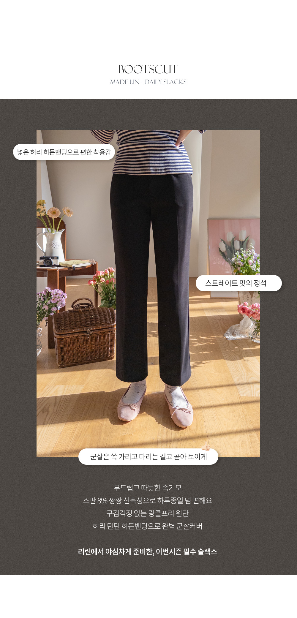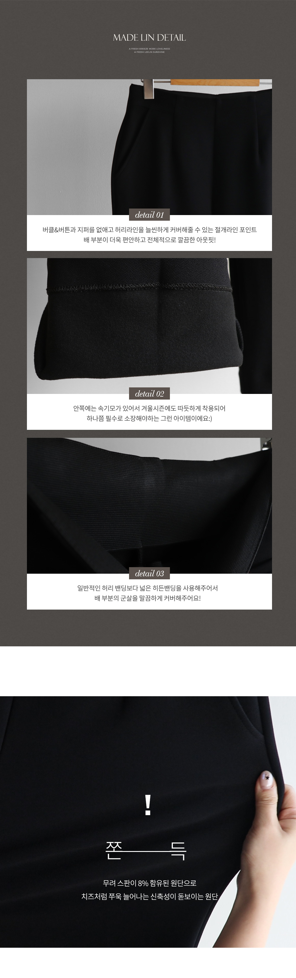 따스한 속기모가 더해진 원단으로 넘 추운 요즘날씨에도 포근하게 착용될 팬츠 보여드릴게요~! 다리 쉐입에 맞춰 깔끔하게 떨어지는 일자핏으로 전체적으로 날씬해보이는 실루엣을 만들어주는데요! 신축성 좋은 원단으로 쫀쫀~한 치즈 스판을 느껴보실 수 있고 프론트 레직기가 잡혀있어서 더욱 다리라인이 길어보인답니다ㅎㅎ 허리부분 밴딩을 넓은 밴딩으로 되어있어서 아랫배를 탄탄하게 잡아주어 체형보정 효과도 있는..! 블랙 컬러로 언제 어디서나, 다양한 스타일링 하기 좋아서 하나 소장하시면 데일리하게 활용도 높으실 거에요~! 요 팬츠 꼭 소장하셔서 출근룩&데일리룩으로 예쁘게 즐겨주세요-♡