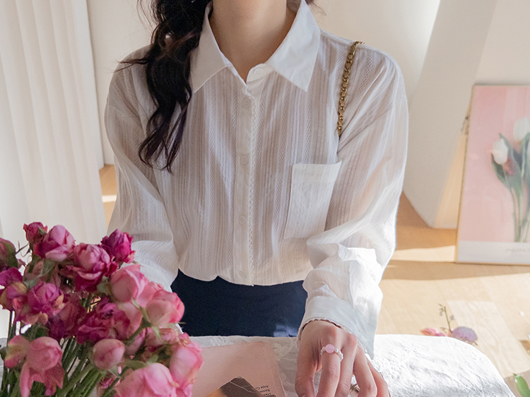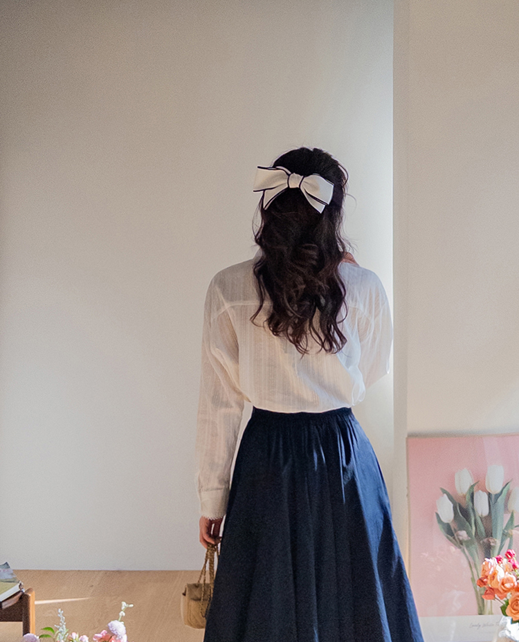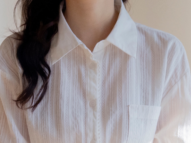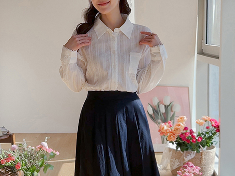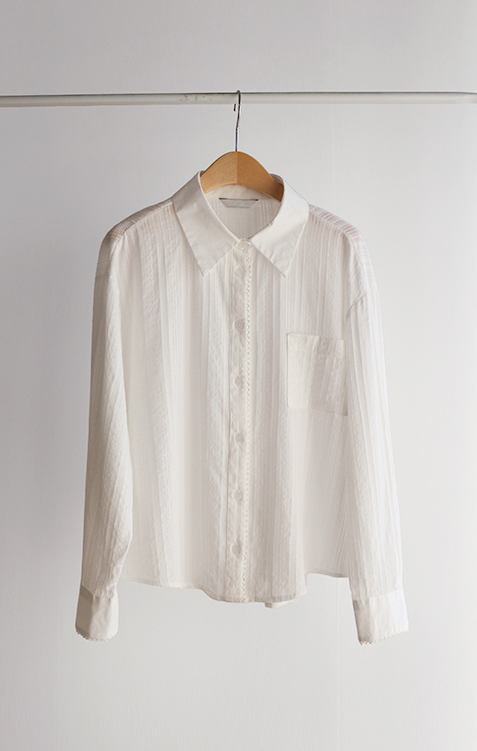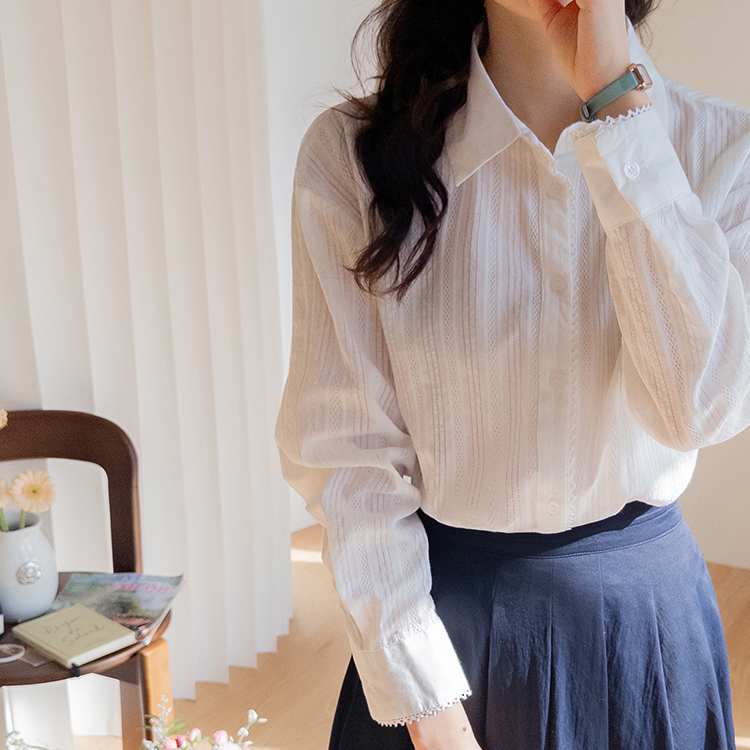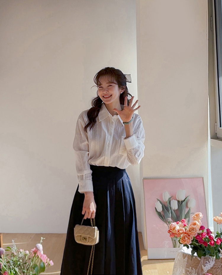 가볍고 여리한 분위기가 느껴지는 레이스 디테일 블라우스 보여드려요~^.^ 전체적으로 은은한 세로결이 들어가 있어 밋밋하지 않고 자연스럽게 포인트가 되어준답니다ㅎㅎ 앞 단추 라인과 소매 끝에 더해진 잔잔한 레이스 디테일이 과하지 않으면서도 여성스러운 무드를 살려줘요♥ 슬랙스, 스커트, 데님 어디에나 잘 어울려요! 단독으로 입어도 예쁘고 니트나 가디건, 자켓 안에 이너로 매치하면 레이스 디테일이 은근히 살아나 활용도도 좋아요*.* 데일리룩부터 출근룩, 격식 있는 자리까지 두루두루 활용하기 좋은 기본 아이템으로 추천드려요♥