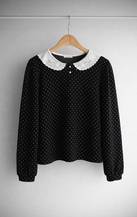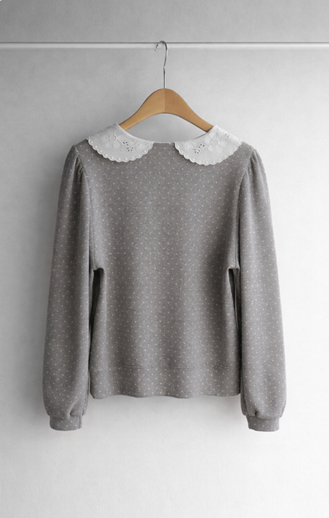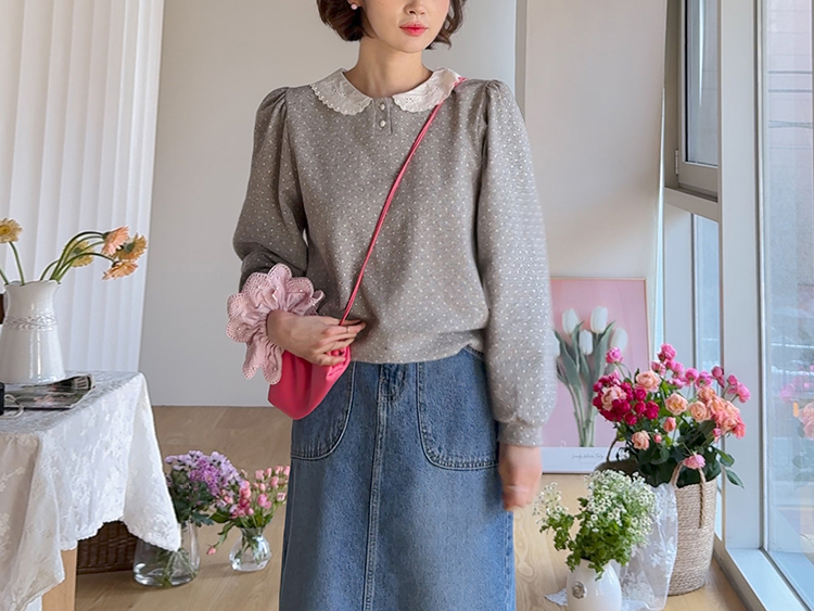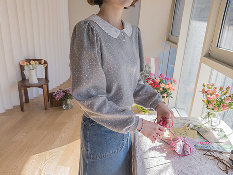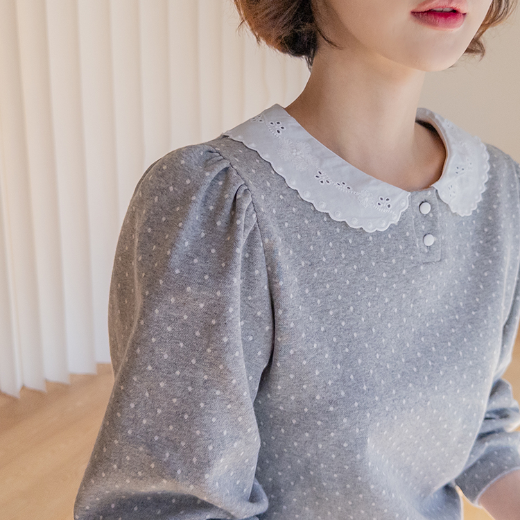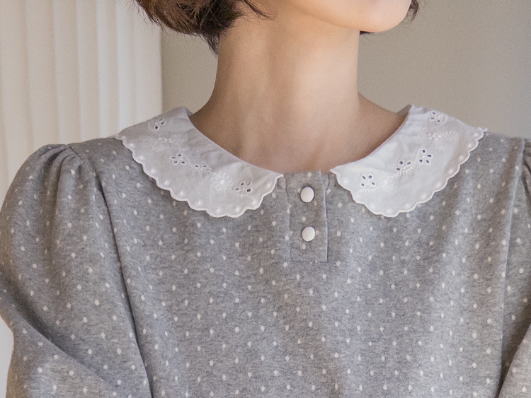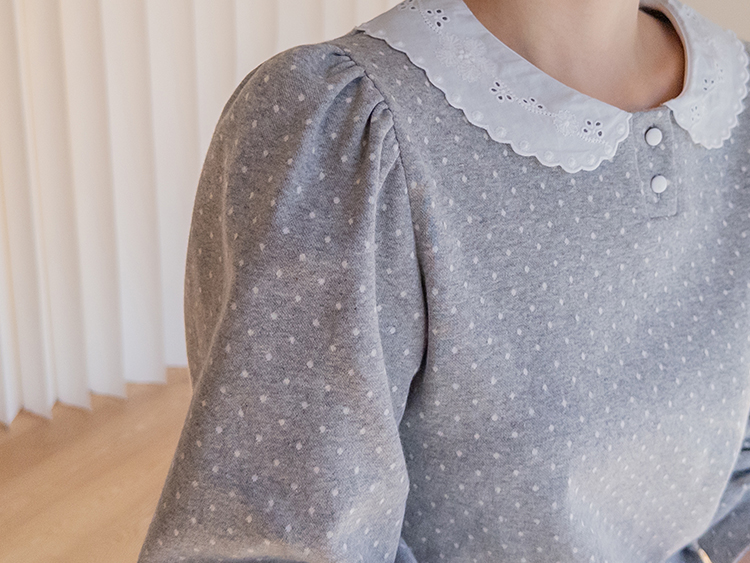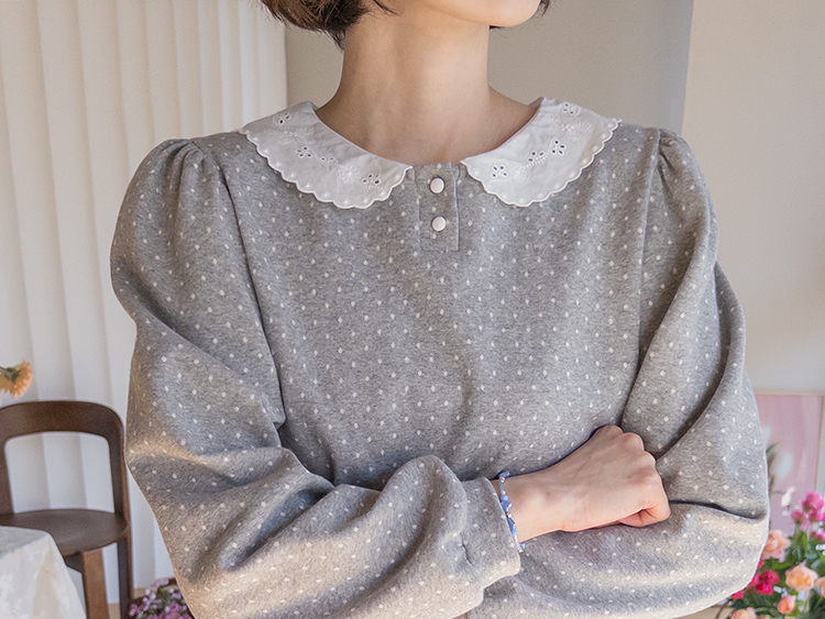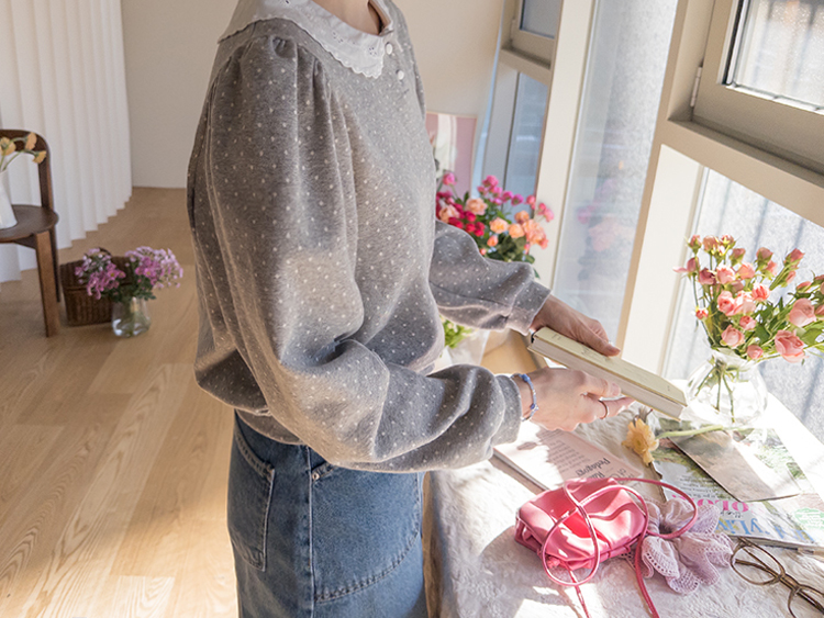 러블리한 무드의 레이스 카라 맨투맨 소개드려요 ^^ 잔잔한 도트 패턴에 레이스 카라 디테일이 포인트♥ 데님, 스커트 어디에 매치해도 꾸민 듯 안 꾸민 듯 너무 예쁘구요 ㅎㅎ 둥근 카라가 얼굴을 더욱 화사하게~ 단독으로 입어도 포인트 확실해서 데일리룩으로 정말 추천드려요 ^^
