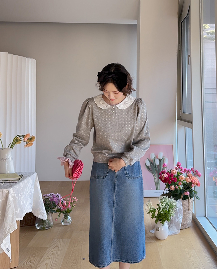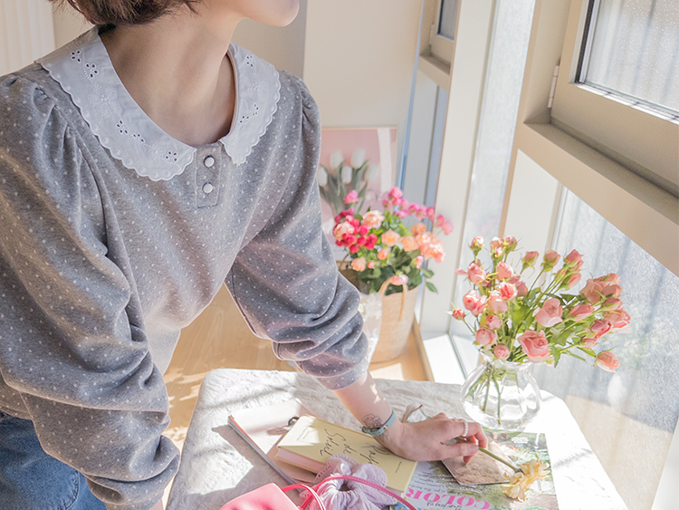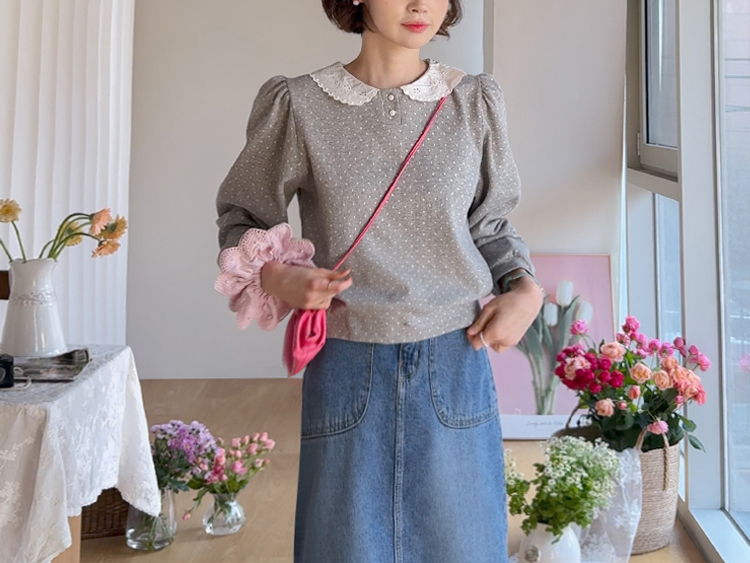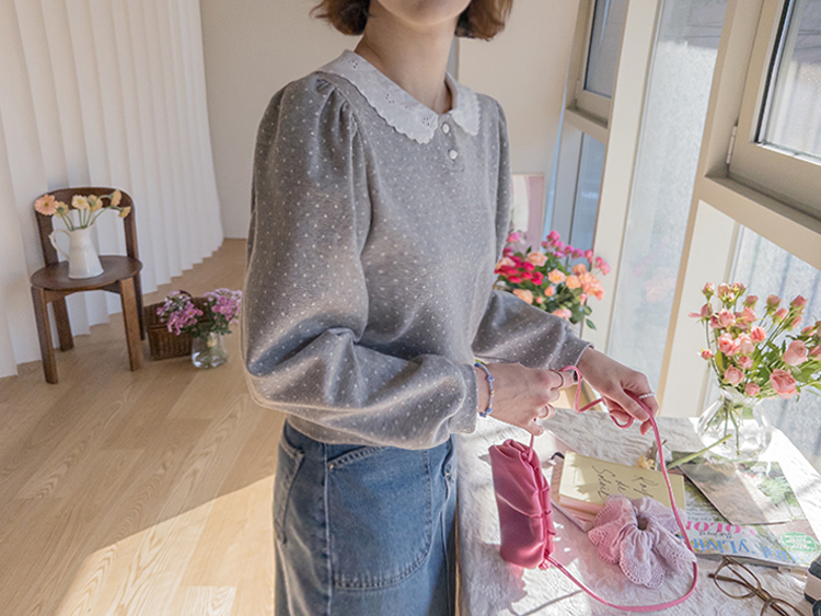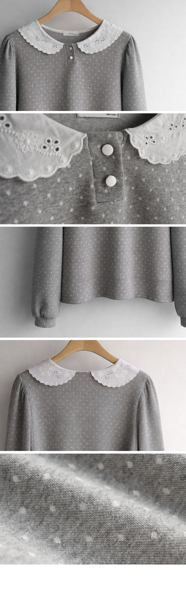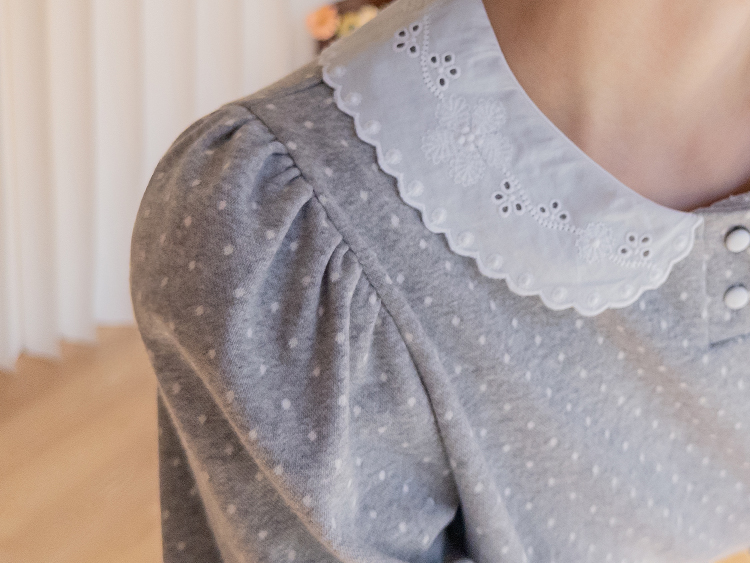 러블리한 무드의 레이스 카라 맨투맨 소개드려요 ^^ 잔잔한 도트 패턴에 레이스 카라 디테일이 포인트♥ 데님, 스커트 어디에 매치해도 꾸민 듯 안 꾸민 듯 너무 예쁘구요 ㅎㅎ 둥근 카라가 얼굴을 더욱 화사하게~ 단독으로 입어도 포인트 확실해서 데일리룩으로 정말 추천드려요 ^^