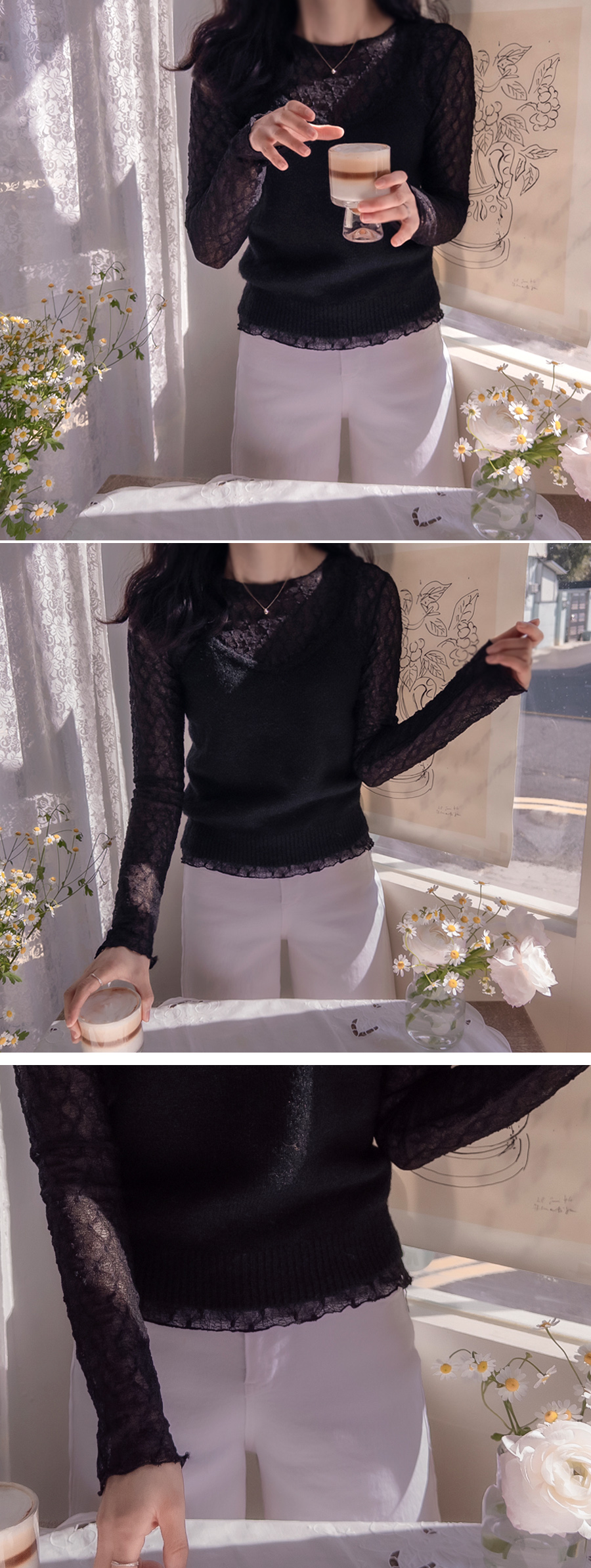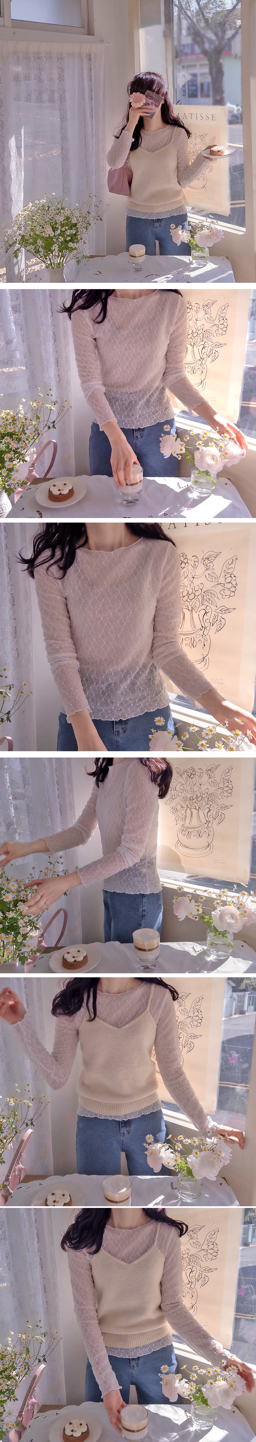 레이어드템으로 이만큼 이쁜 티셧 만나는건 늘 소중해요~ ㅎㅎ 우선 라인 너무 이쁘게 나왔답니다~ 아랫단 소매 웨이브로 과하지 않는 포인트구요~ 쫀득 신축성이라 착용감 또한 편안하답니다~ 봄은 러블리의 계절이니 요 티셧 기본으로 꼭 쟁여 두세요~ 요렇게 비치면서 얇은 티셧은 부해보임도 없구요~ 이너로 입으셔도 겉옷의 매무새를 망치지 않아요~ 비침은 있구요 과하지 않아서 이너 나시탑과 함께 입으시면 좋아요~ 사이즈 프리로 55-66까지 좋으시구요` 진심 사심을 담뿍이 담아 강추 강추 드려요~^^