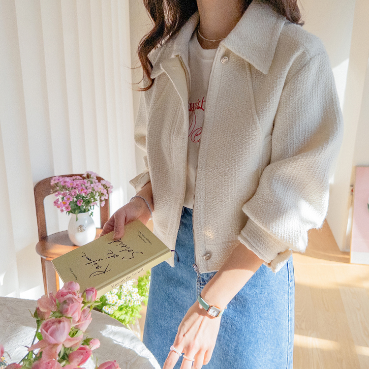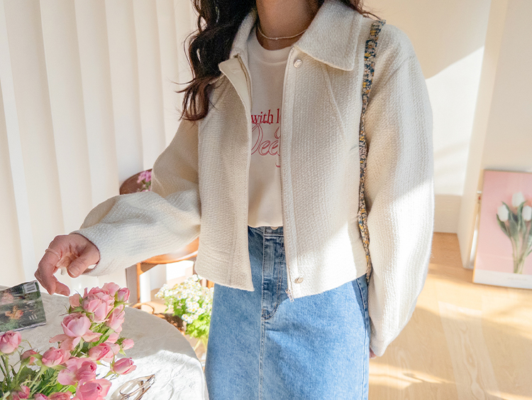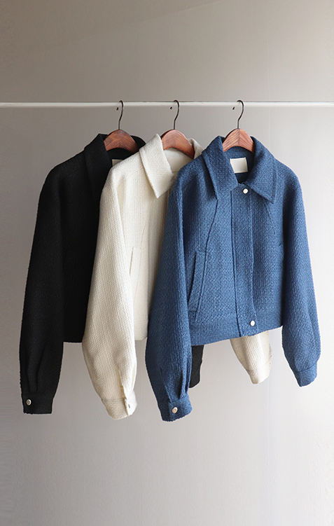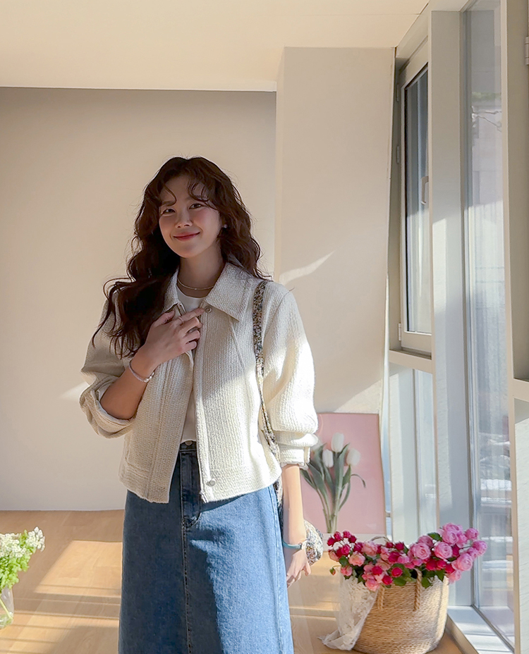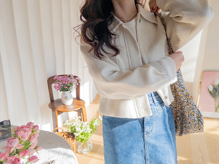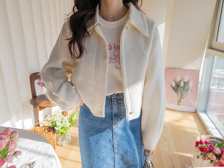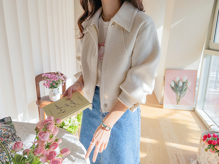 옷만 보면 포멀해 보일 수 있지만, 모델언니처럼 티셔츠나 데님과 매치하면 캐주얼하게 풀어 입기 좋은 데일리 자켓 소개드려요 ㅎㅎ 톡톡한 트위드 원단으로 흐물거림 없이 실루엣을 잡아주고요~ 은은한 결감이 살아있어 고급스러운 분위기를 더해주어요 ^^ 어깨는 각잡히지 않고 부드럽게 떨어져 부해 보이지 않으면서도~ 상체라인은 자연스럽게 정리해주는 깔끔한 아웃핏이랍니다 :) 적당히 크롭한 기장감이 허리선은 올라가 보이면서 전체 비율이 예쁘게 살아나요 ~*.* 활용도 높은 요 자켓 굿초이스 해주세요~♥