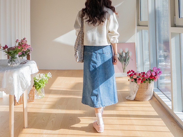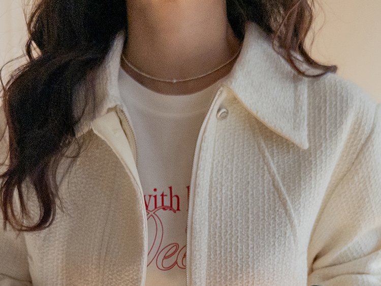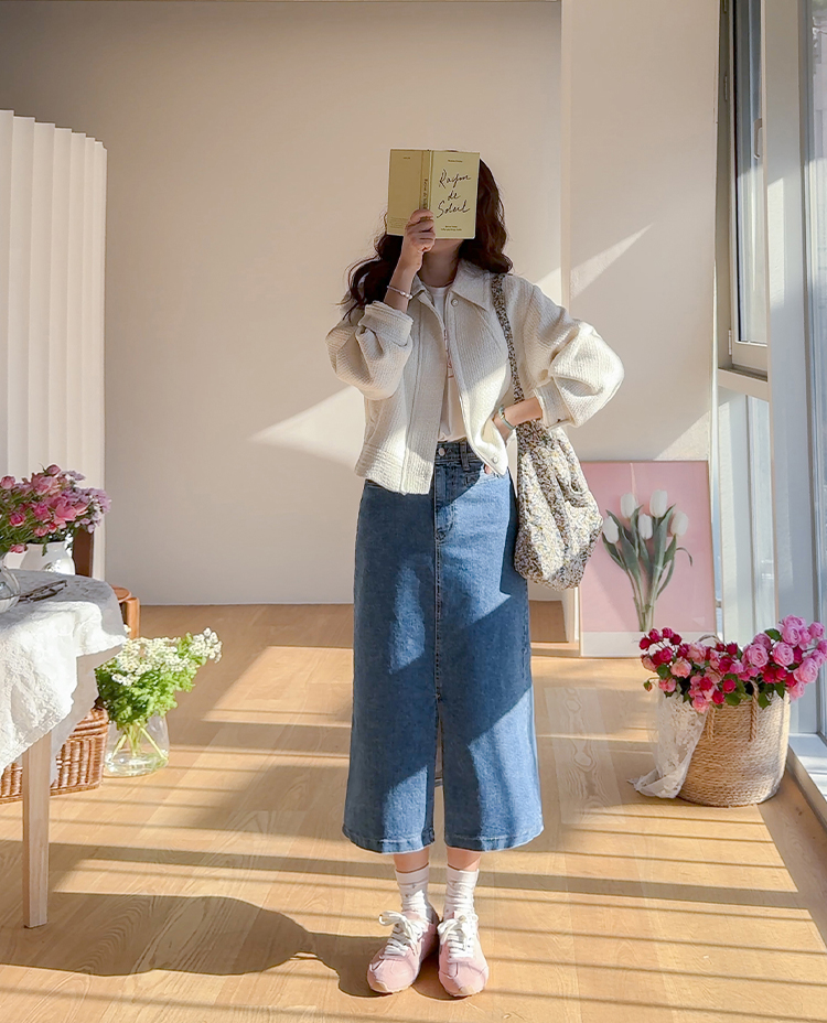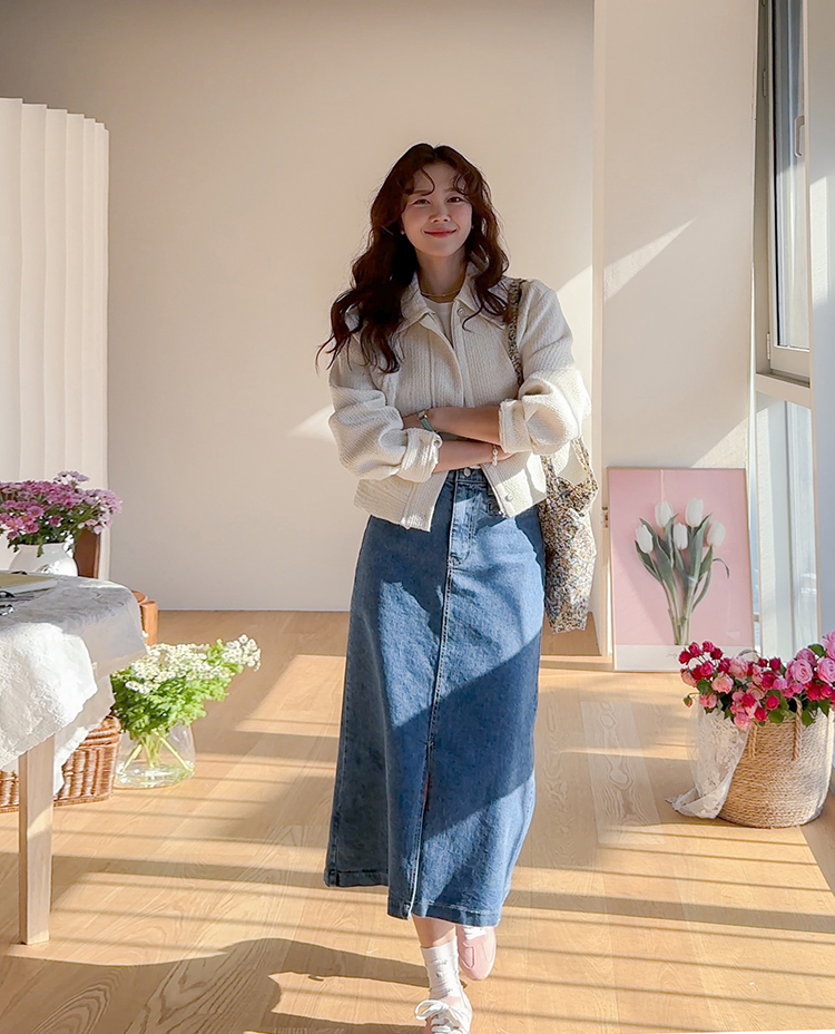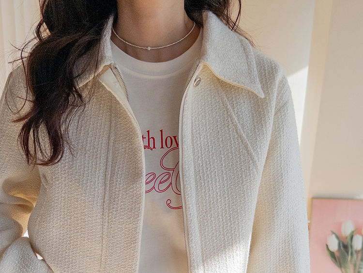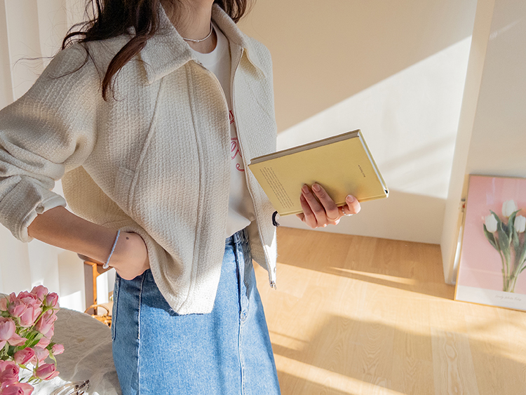 옷만 보면 포멀해 보일 수 있지만, 모델언니처럼 티셔츠나 데님과 매치하면 캐주얼하게 풀어 입기 좋은 데일리 자켓 소개드려요 ㅎㅎ 톡톡한 트위드 원단으로 흐물거림 없이 실루엣을 잡아주고요~ 은은한 결감이 살아있어 고급스러운 분위기를 더해주어요 ^^ 어깨는 각잡히지 않고 부드럽게 떨어져 부해 보이지 않으면서도~ 상체라인은 자연스럽게 정리해주는 깔끔한 아웃핏이랍니다 :) 적당히 크롭한 기장감이 허리선은 올라가 보이면서 전체 비율이 예쁘게 살아나요 ~*.* 활용도 높은 요 자켓 굿초이스 해주세요~♥