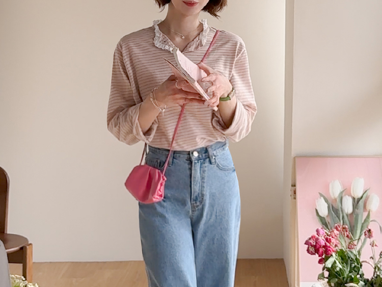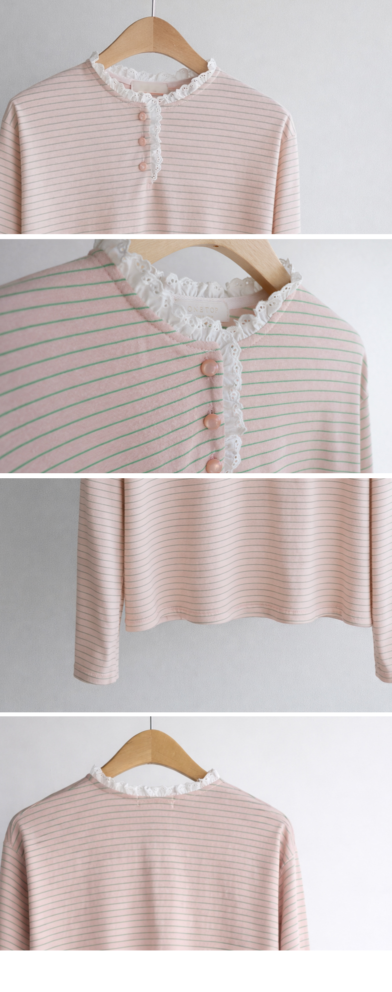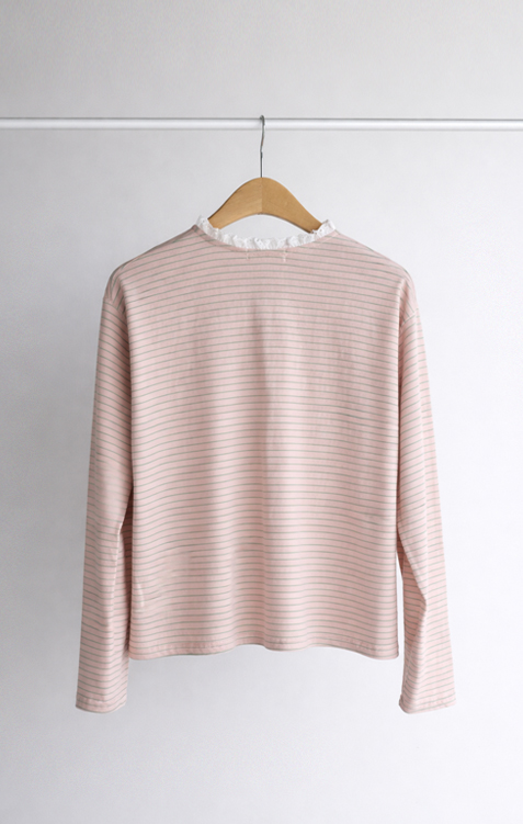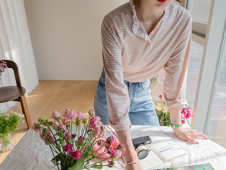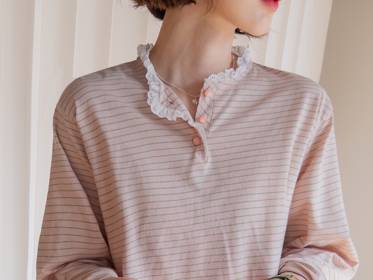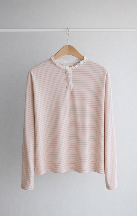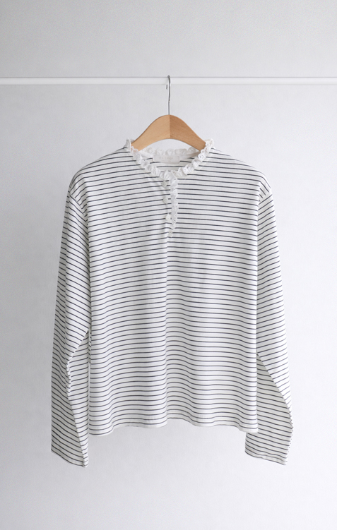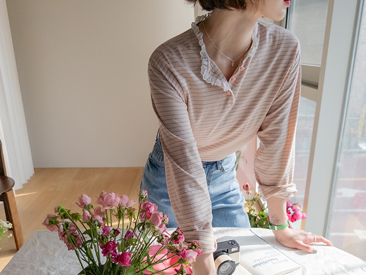 잔잔한 스트라이프 패턴 위에 넥 라인을 따라 더해진 레이스 트리밍이 러블리한 포인트가 되어주는 티셔츠예요 ^^ 프론트 버튼 디테일로 밋밋함 없이 은근한 포인트를 더해주고 클로징/오픈 연출에 따라 분위기 조절도 가능해요 전체적으로 깔끔한 실루엣이라 단독으로 입어도 예쁘고 가디건이나 니트 안에 레이어드해도 딱 좋아요