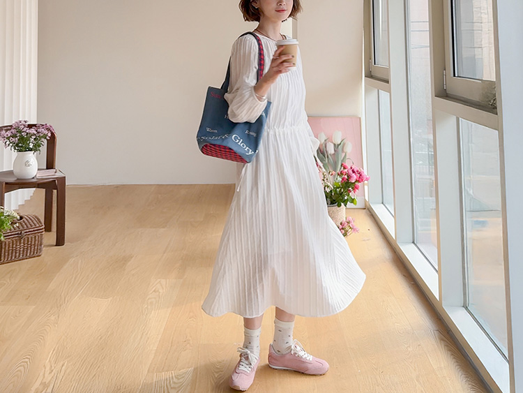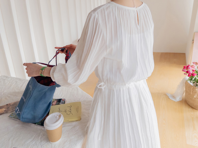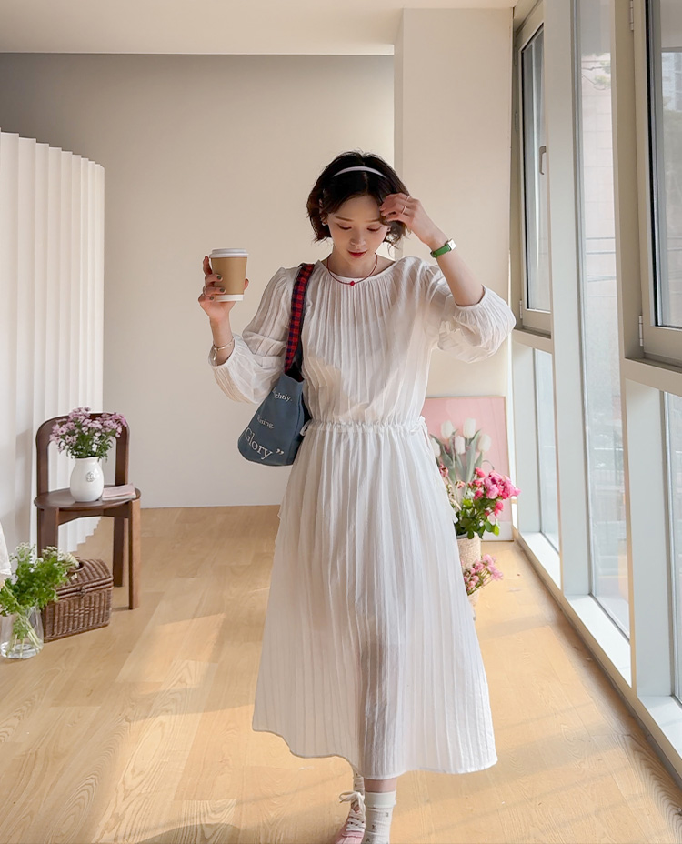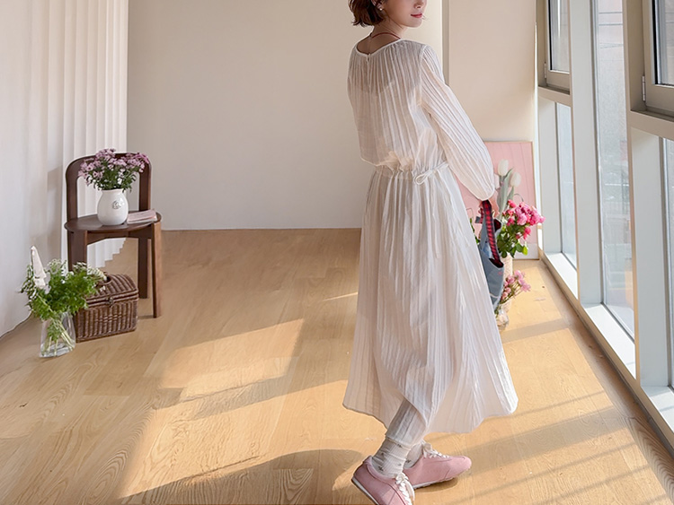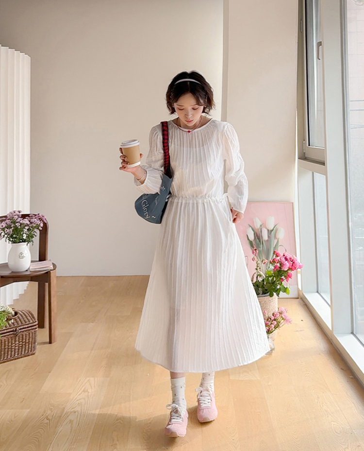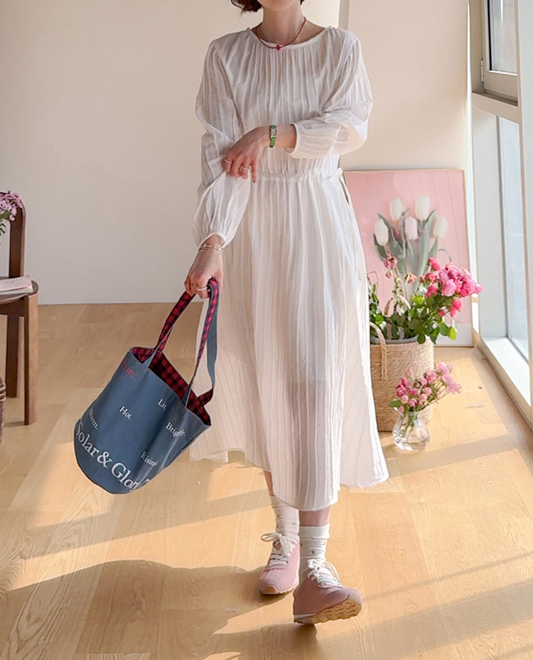 여리여리한 분위기가 자연스럽게 살아나는 플리츠 롱 원피스 소개해드려요~^.^ 전체적으로 세로 플리츠 텍스처가 잡혀 있어 시각적으로 라인이 길어 보이고 체형을 자연스럽게 커버해주면서 부담 없이 슬림한 실루엣을 완성해줘요♥ 허리에는 스트링 디테일이 더해져 내 체형에 맞게 조절이 가능해 핏을 살짝 잡아 입으면 여성스럽게, 루즈하게 풀어주면 내추럴한 무드로 연출할 수 있어요ㅎㅎ 넥 라인은 깔끔한 라운드 디자인으로 단정하면서도 과하지 않아 단독으로 입어도, 이너로 레이어드해도 부담 없이 잘 어울린답니다 . 소매는 은은하게 볼륨감이 느껴지는 디자인으로 손목 라인을 여리하게 잡아주고 전체적인 분위기를 한층 더 부드럽게 만들어줘요ㅎㅎ 단독으로는 물론 가디건, 니트, 자켓과 레이어드하면 계절감에 맞게 다양한 코디가 가능해 활용도가 정말 높은 아이템이에요 . 데일리룩부터 하객룩, 데이트룩까지 차분하고 여성스러운 무드의 원피스로 소장 추천드려요♥
