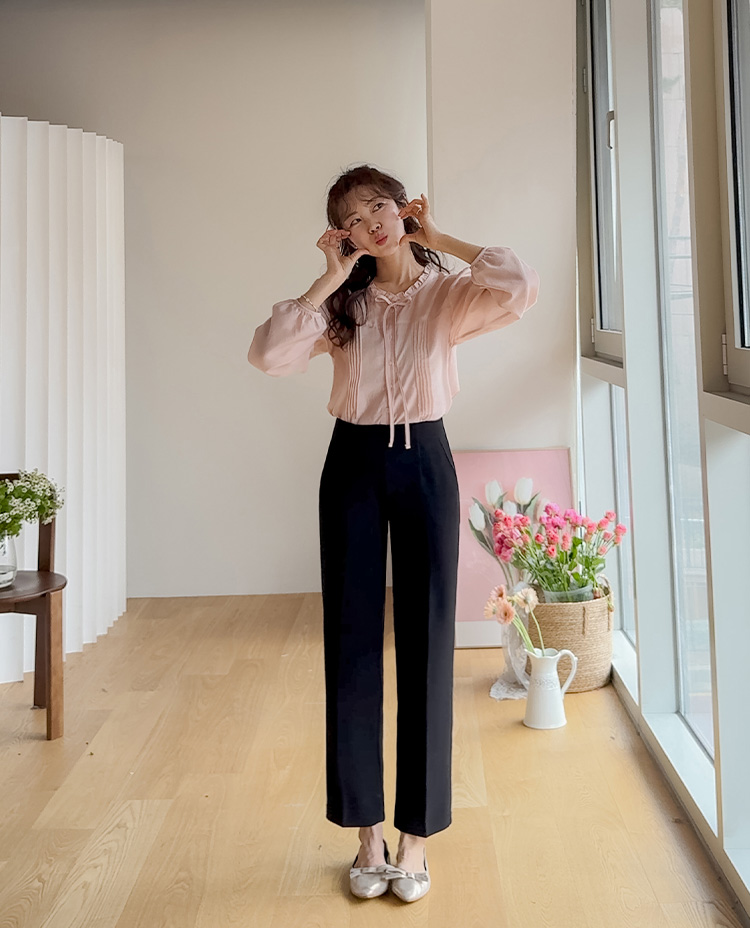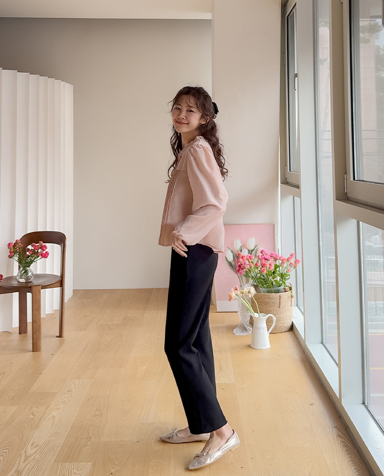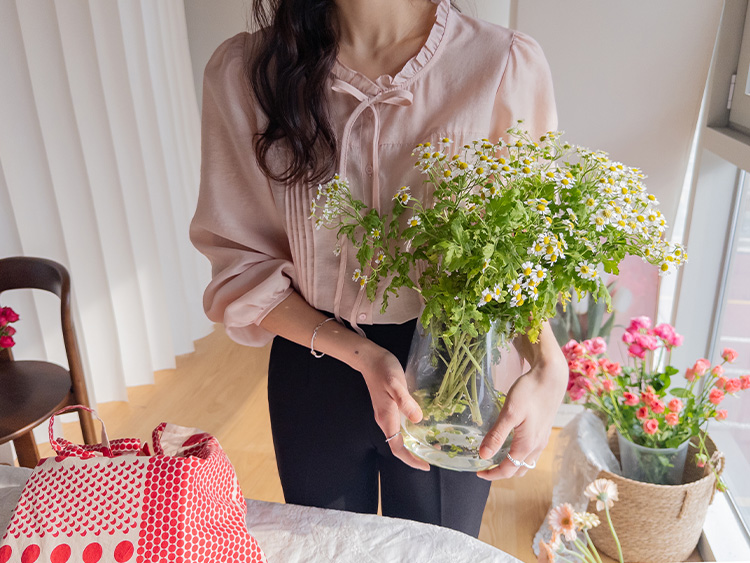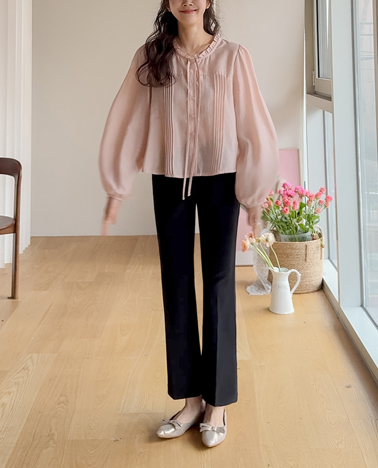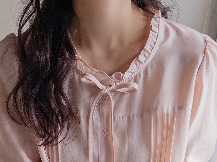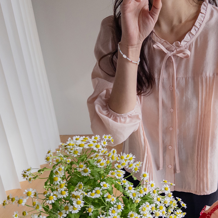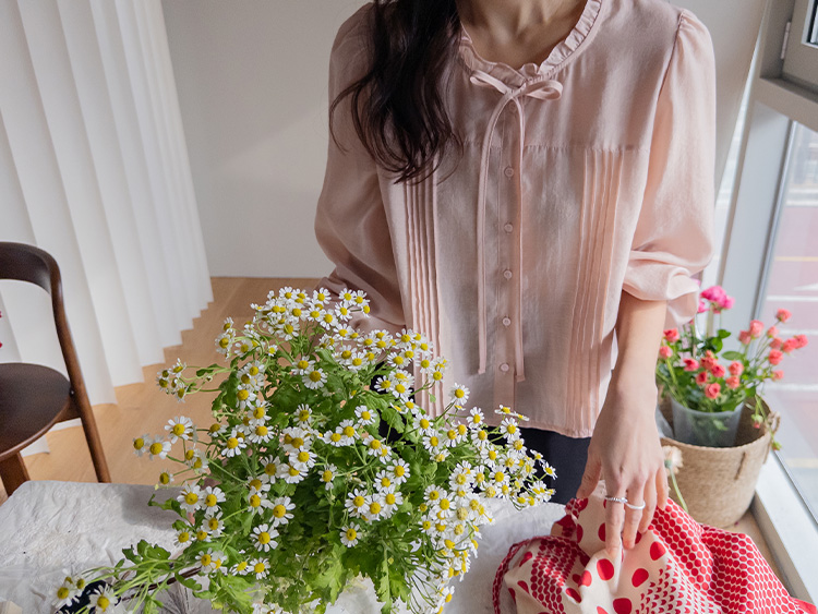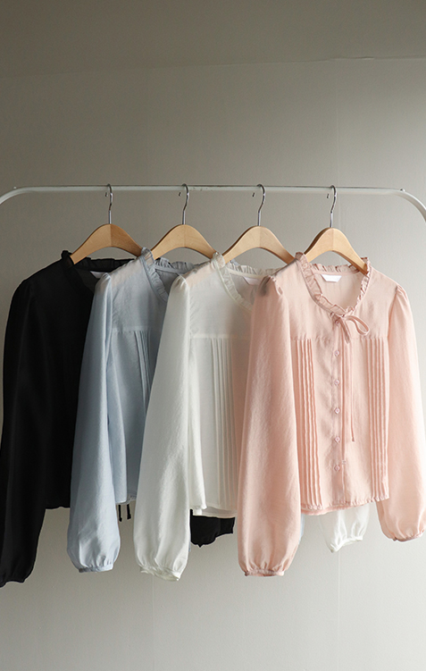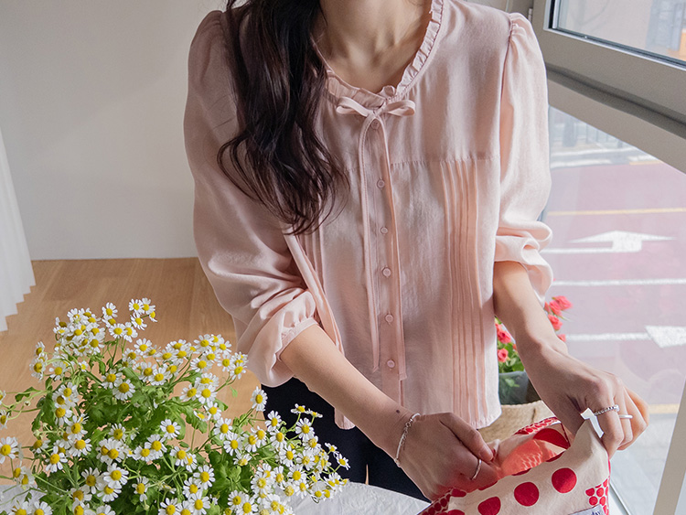디테일이 살아있는 로맨틱 블라우스 소개드려요 ^~^ 넥라인 프릴과 리본 디테일이 더해져 입는 순간 분위기가 확 살아나는 아이템이에요! 전면 세로 핀턱 디테일이 들어가 있어 상체 라인을 슬림하고 길어 보이게 연출해주고, 과하지 않은 셔링으로 볼륨 소매가 여리여리한 실루엣을 완성해줘요~ 은은하고 부드러운 컬러감으로 얼굴빛을 화사하게 밝혀주어 데이트룩, 출근룩, 모임룩까지 모두 잘 어울려요 :) 스커트, 슬랙스, 데님 어디에나 매치하기 좋아 손이 자주 갈 블라우스랍니다 ♥ 굿초이스 해주세요!