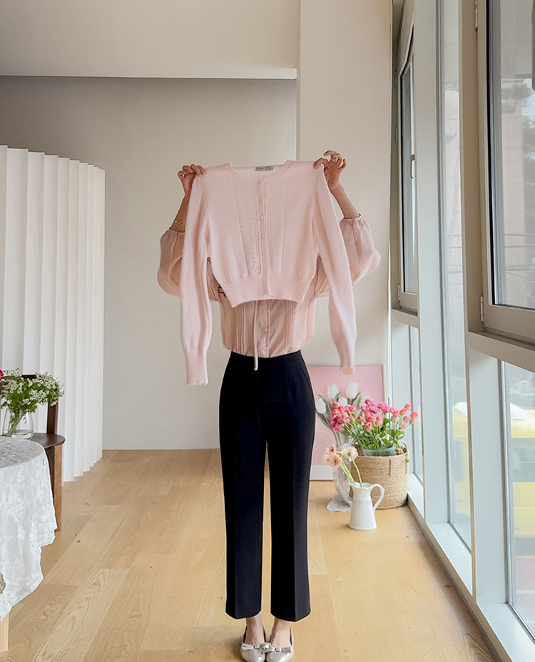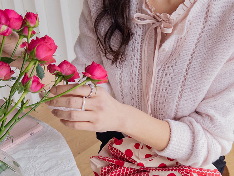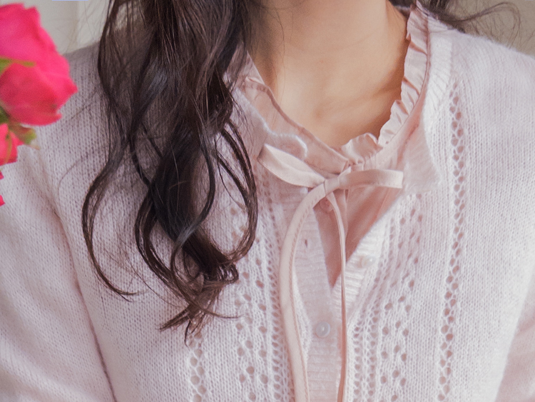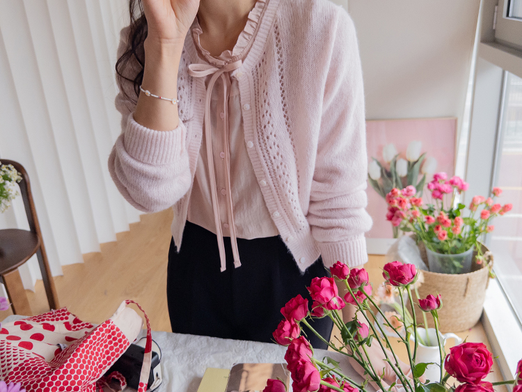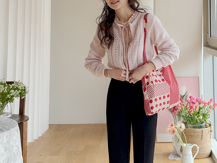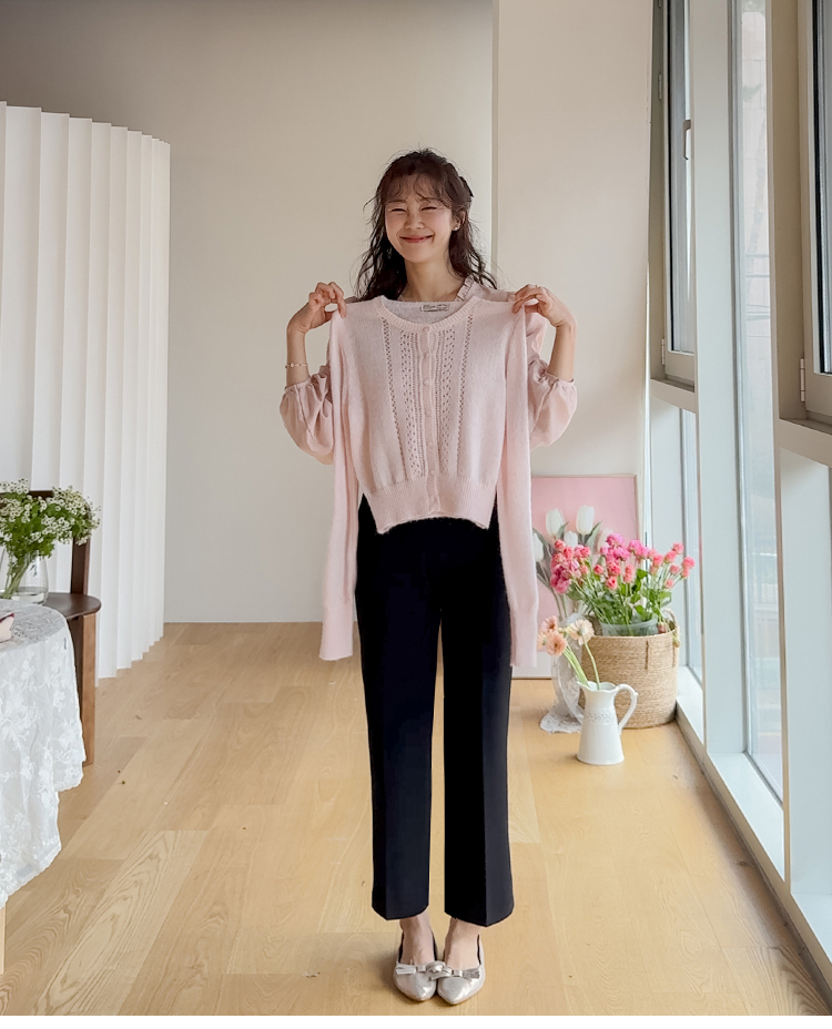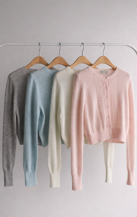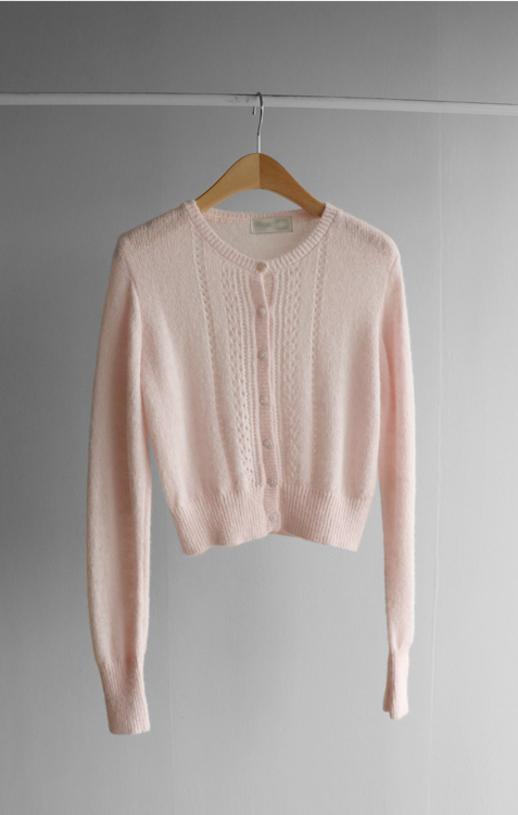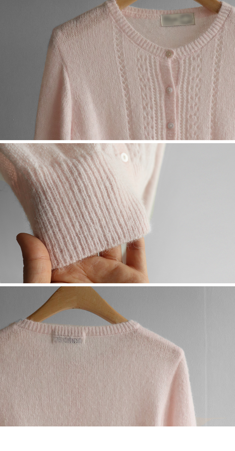 사랑스러운 무드의 니트 가디건 소개드려요 ^^ 세로 펀칭 짜임이 들어가 상체 라인을 슬림하게 보이도록 도와주며 여리여리한 실루엣을 완성해줘요~ 가디건 하나만으로도 포인트 주기 좋고, 은은한 로맨틱 분위기를 연출해줘요~ 버튼 오픈 클로징이 가능해 단독으로 니트처럼 입어도 좋고~ 아우터처럼 가볍게 걸쳐도 활용도 높은 아이템 :) 데일리부터 데이트룩까지 손이 자주 갈 가디건이에요 ♥ 굿초이스 해주세요!
