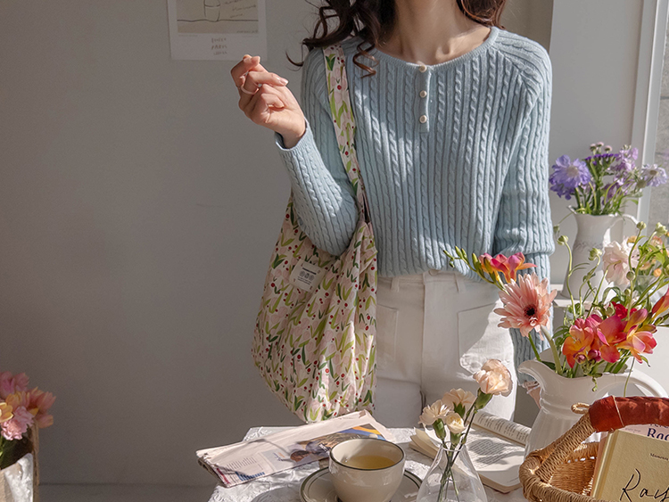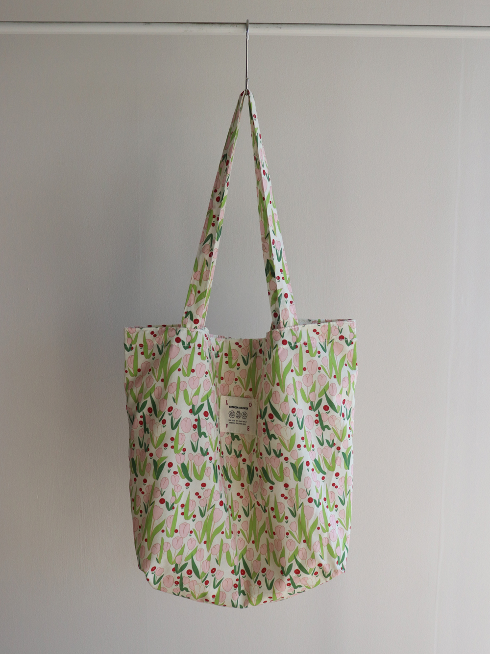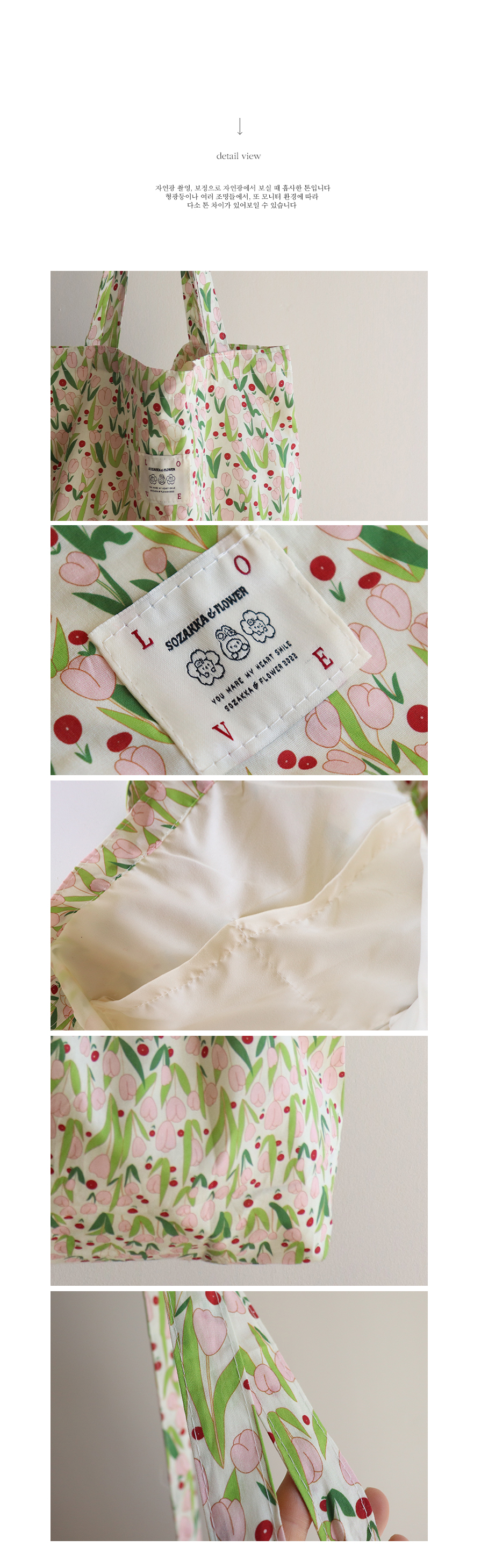 사랑스럽고 화사한~ 튤립 패턴으로 포인트 주기 좋은 에코백 소개 드려요~ 컬러감이 화사하면서 너무 부담스럽지 않은 컬러조합으로 심심한 룩에 화사하게 포인트를 줄 에코백이에요 :)♥ 편하게 자주 들어지는 기본 사이즈로 간단한 소지품은 물론~ 내구성을 높여주는 이너 포켓이 있어서 중요한 소지품도 따로 수납이 가능해요~ 휘뚜루하게~ 편하게 매기 좋은 존재감 확실한 요 아이 추천 드려요♥