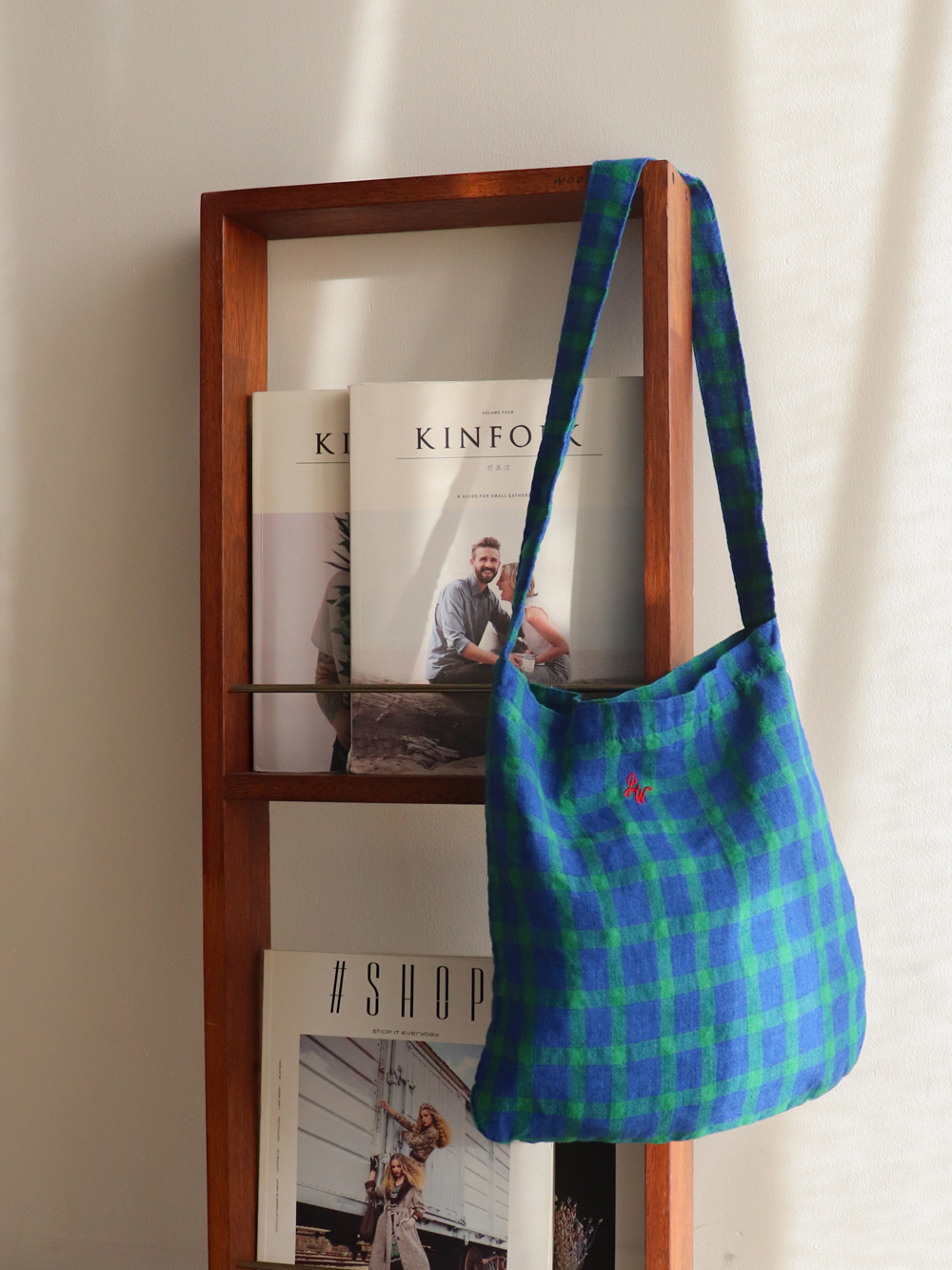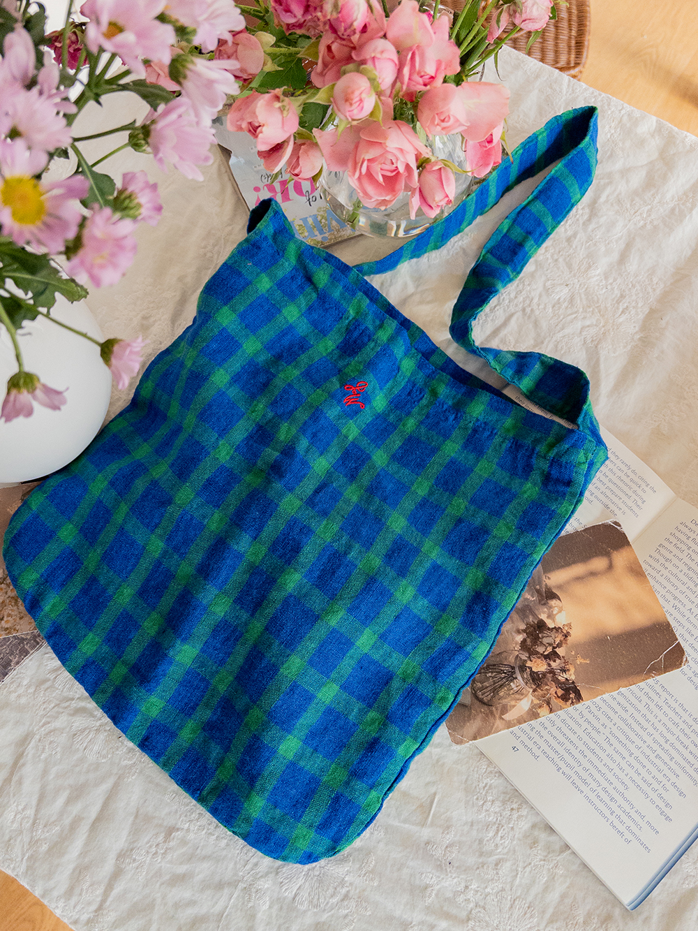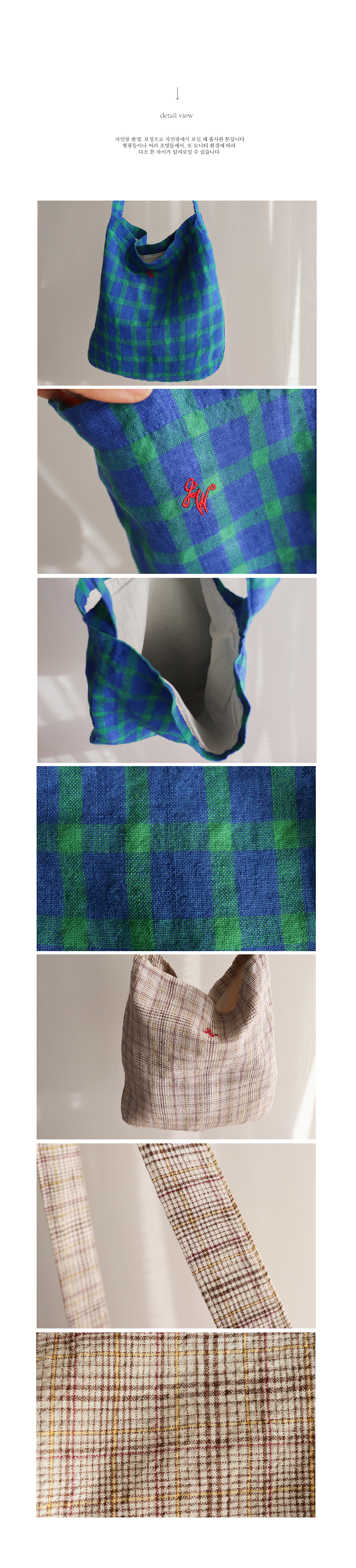 그린&블루 체크 조합이 화사한 에코백이에요 :) 중앙의 작은 자수가 은은한 포인트가 되어주구요~ 가볍게 들기 좋아 데일리룩에 편안하게 매치하기 좋아요♡ 봄, 여름 시즌에 특히 잘 어울리는 아이랍니다♥
