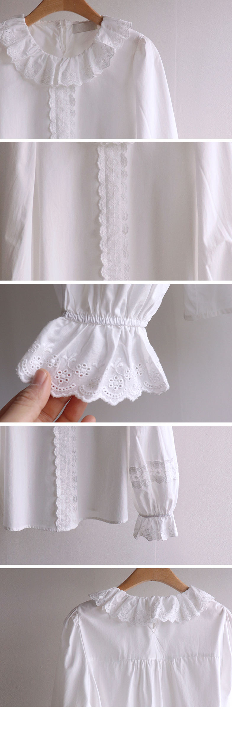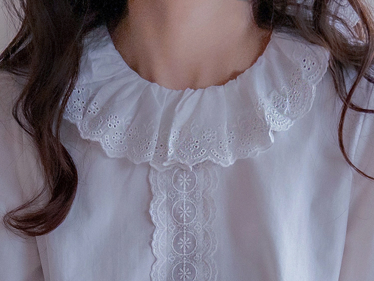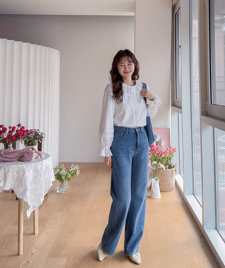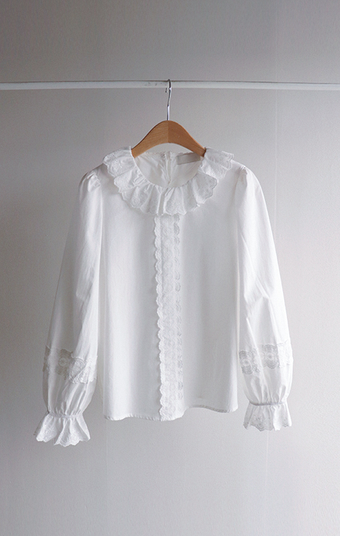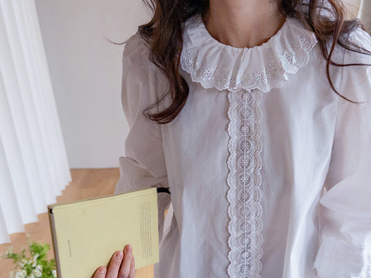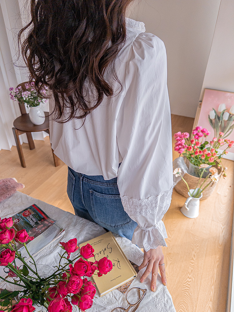 은은하게 퍼지는 라운드 핏에 풍성한 레이스 카라가 얼굴을 화사하게 밝혀주는 아이에요 :) 앞 중심을 따라 더해진 레이스 라인이 시선을 세로로 정리해줘서 상체가 한층 슬림해보이구요. 소매 끝은 밴딩으로 잡아주고 밑단 레이스 프릴로 러블리함을 더해 손짓 하나에도 분위기가 살아나요♡ 스커트, 데님, 원피스 안 이너로까지 여성스럽게 매치하기 좋은 블라우스랍니다.