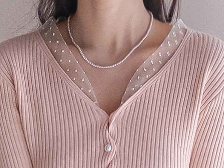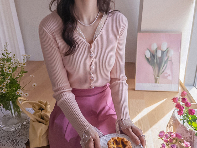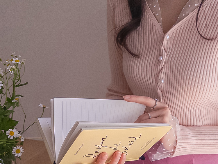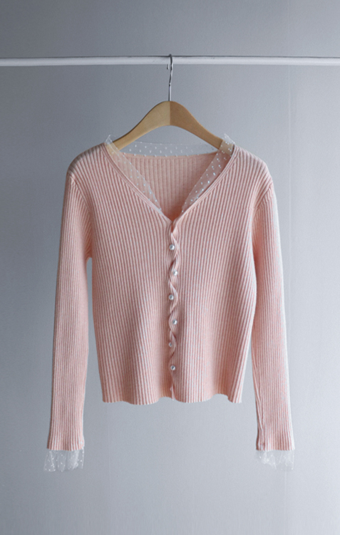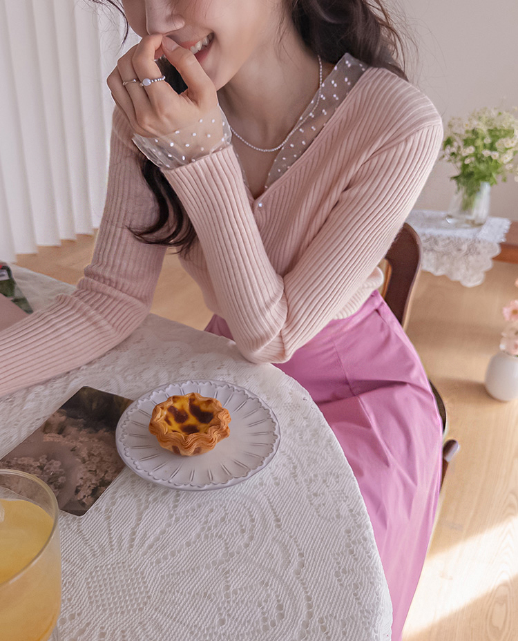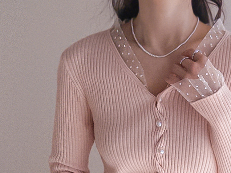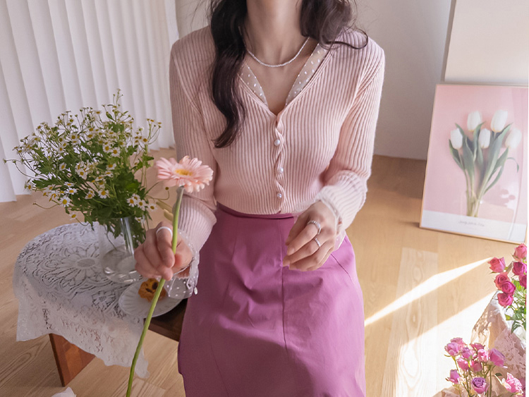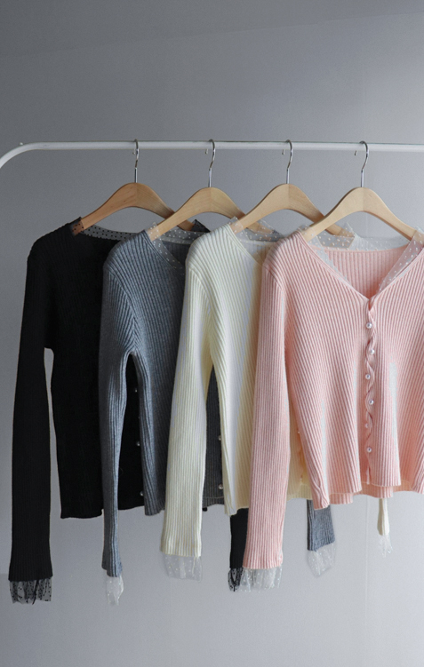 디테일이 돋보이는 골지 니트 가디건 소개드려요 ^^ 앞여밈 라인이 지그재그로 디자인되어 진주 버튼 디테일과 함께 사랑스럽고 세련된 포인트를 더해주고요, 오픈보다는 단독으로 착용했을 때 브이넥 니트처럼 더욱 예쁘게 연출되는 아이템이에요. 쫀쫀한 골지 니트 소재로 바디 라인을 탄탄하게 잡아주어 슬림하고 여성스러운 실루엣을 완성해줘요. 넥라인과 소매 밑단에는 도트 메쉬 원단이 배색되어 살이 은은하게 비치며 여리여리하고 로맨틱한 분위기를 한층 살려준답니다. 스커트, 데님, 슬랙스 어디에나 잘 어울리는 포인트 니트로 추천드릴게요 ♥