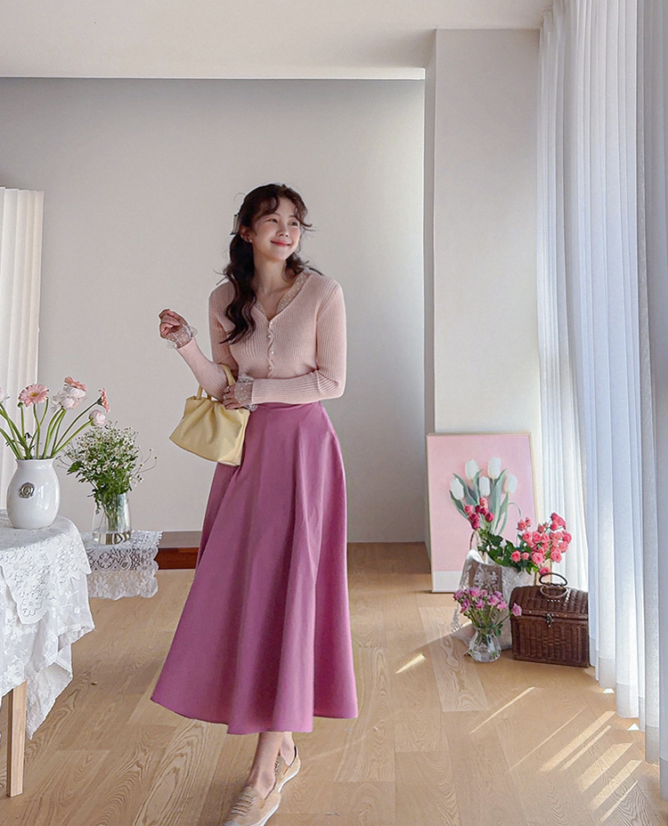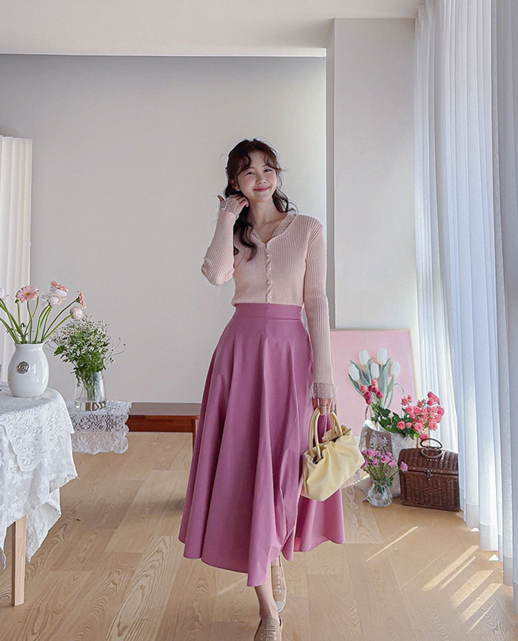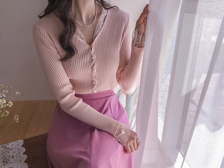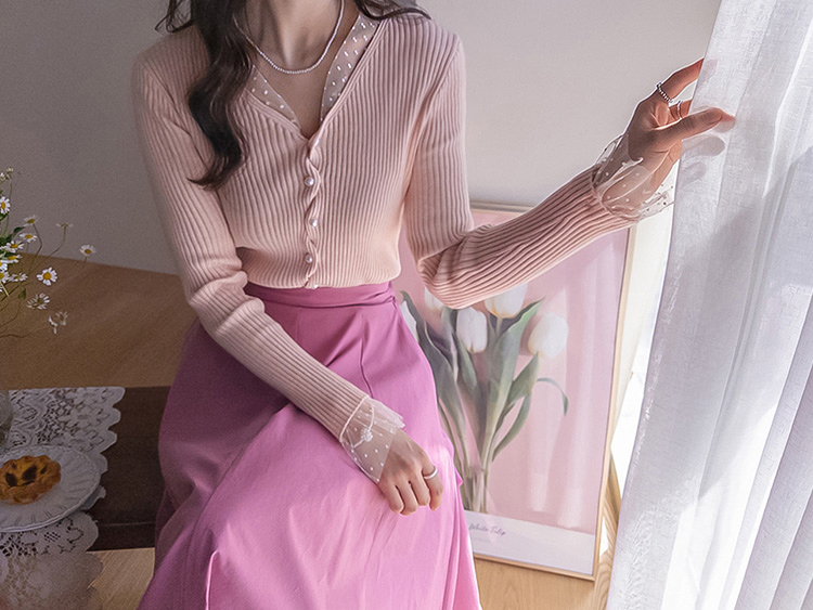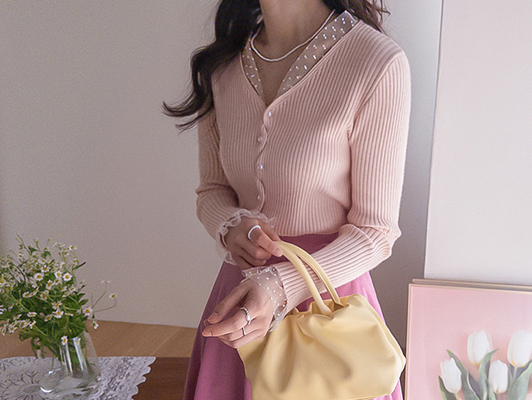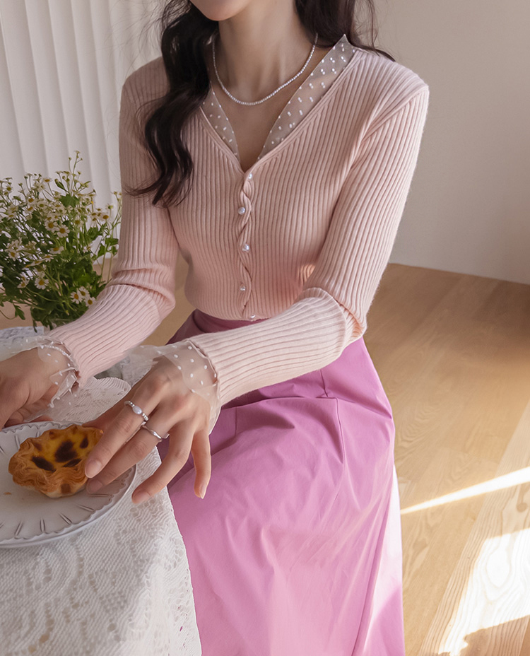 디테일이 돋보이는 골지 니트 가디건 소개드려요 ^^ 앞여밈 라인이 지그재그로 디자인되어 진주 버튼 디테일과 함께 사랑스럽고 세련된 포인트를 더해주고요, 오픈보다는 단독으로 착용했을 때 브이넥 니트처럼 더욱 예쁘게 연출되는 아이템이에요. 쫀쫀한 골지 니트 소재로 바디 라인을 탄탄하게 잡아주어 슬림하고 여성스러운 실루엣을 완성해줘요. 넥라인과 소매 밑단에는 도트 메쉬 원단이 배색되어 살이 은은하게 비치며 여리여리하고 로맨틱한 분위기를 한층 살려준답니다. 스커트, 데님, 슬랙스 어디에나 잘 어울리는 포인트 니트로 추천드릴게요 ♥
