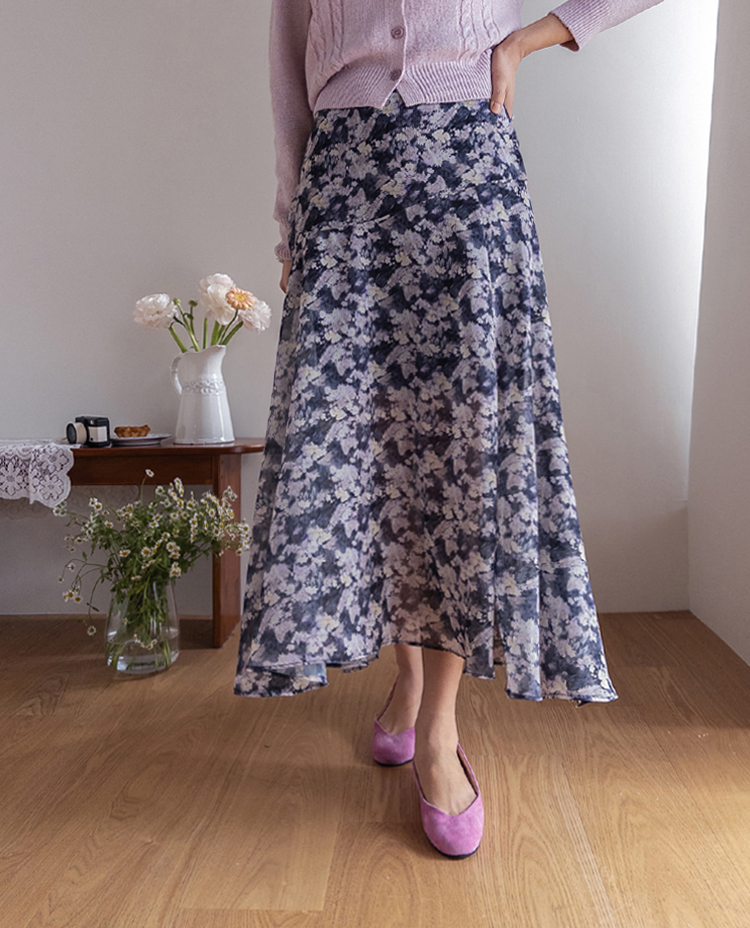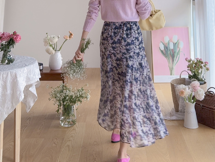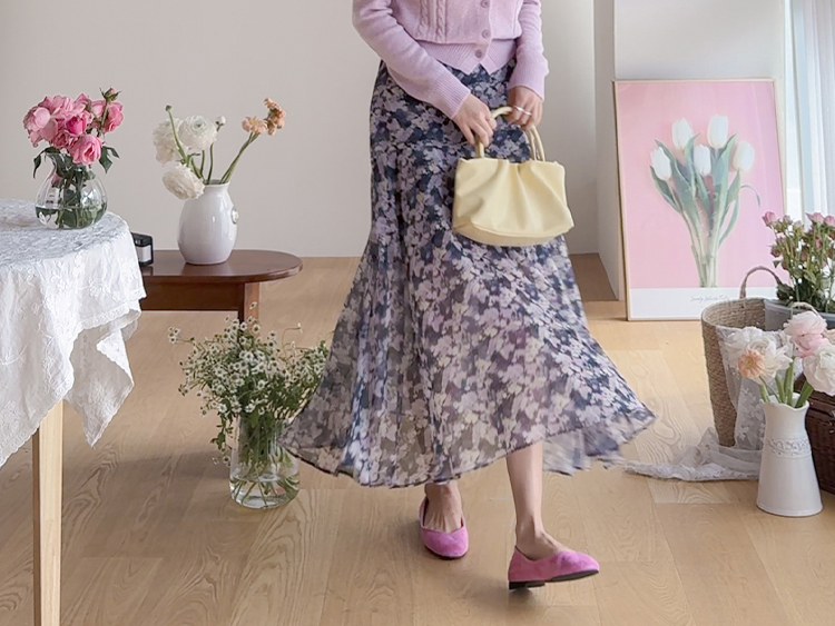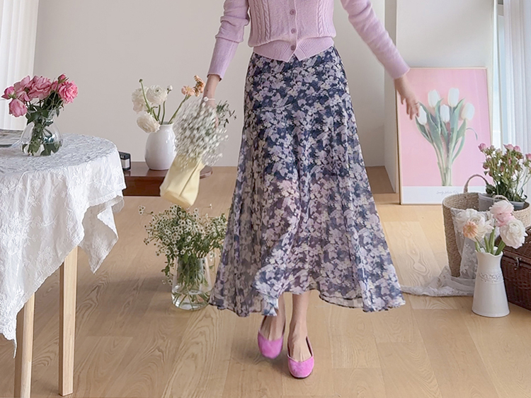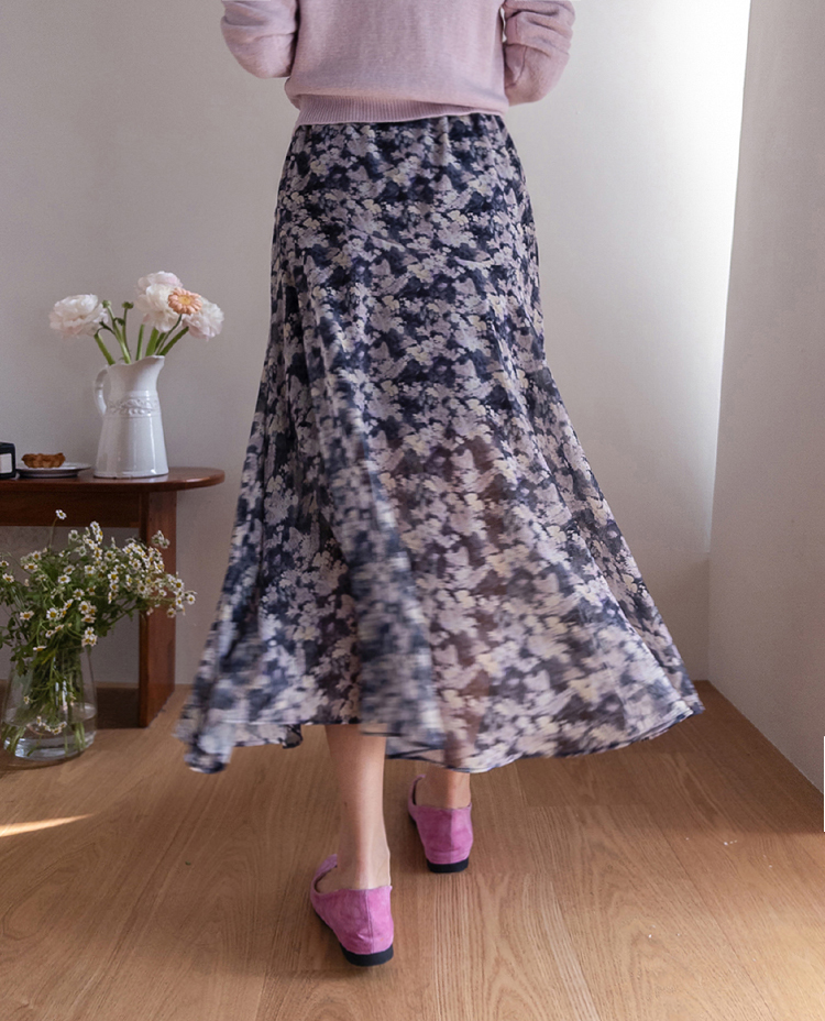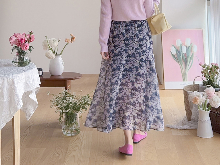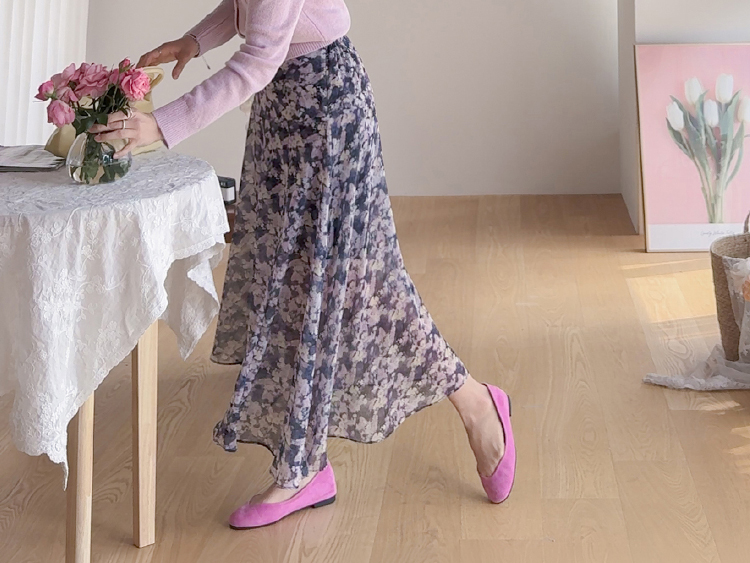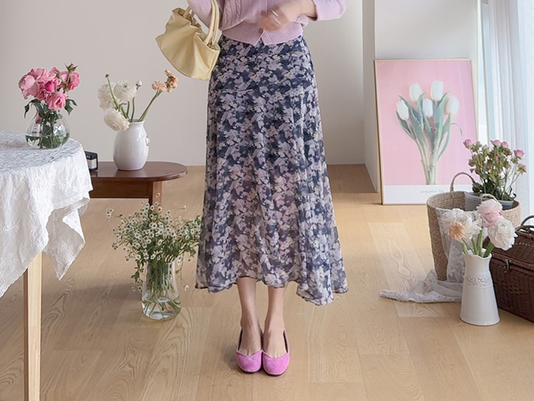 은은한 플라워 나염이 매력적인 여성스러운 쉬폰 스커트 소개드려요 ^^ 가볍고 하늘하늘한 쉬폰 소재로 걸을 때마다 자연스럽게 퍼지는 실루엣이 여리여리한 분위기를 만들어주는 아이템이에요. 골반 부분에는 사선 절개라인을 넣어 부해 보이지 않으면서 자연스럽게 라인을 잡아주고 그 아래로 바이어스 훌이 A라인으로 퍼져 움직일 때 더욱 우아한 실루엣이 연출됩니다. 밑단은 일자가 아닌 언발란스 사선 라인으로 자연스럽게 흐르듯 떨어져 한층 더 가볍고 세련된 느낌을 더해줍니다. 니트나 가디건과 함께 코디하면 봄 시즌 데일리룩부터 여성스러운 모임룩까지 활용하기 좋은 스커트예요 ♡