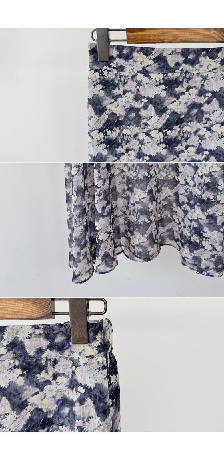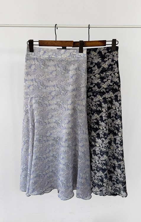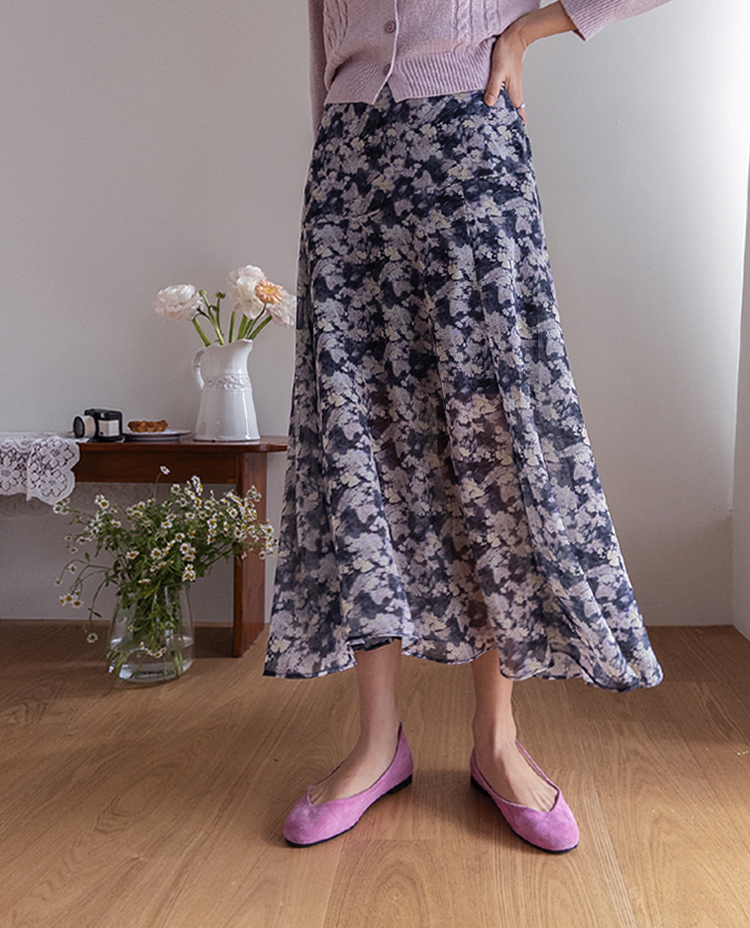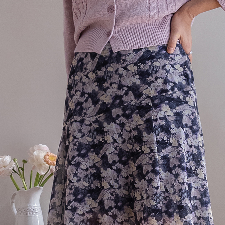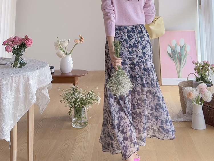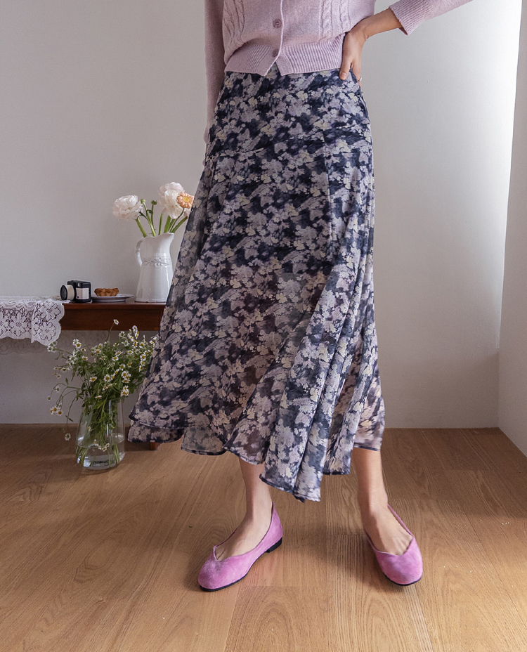 은은한 플라워 나염이 매력적인 여성스러운 쉬폰 스커트 소개드려요 ^^ 가볍고 하늘하늘한 쉬폰 소재로 걸을 때마다 자연스럽게 퍼지는 실루엣이 여리여리한 분위기를 만들어주는 아이템이에요. 골반 부분에는 사선 절개라인을 넣어 부해 보이지 않으면서 자연스럽게 라인을 잡아주고 그 아래로 바이어스 훌이 A라인으로 퍼져 움직일 때 더욱 우아한 실루엣이 연출됩니다. 밑단은 일자가 아닌 언발란스 사선 라인으로 자연스럽게 흐르듯 떨어져 한층 더 가볍고 세련된 느낌을 더해줍니다. 니트나 가디건과 함께 코디하면 봄 시즌 데일리룩부터 여성스러운 모임룩까지 활용하기 좋은 스커트예요 ♡