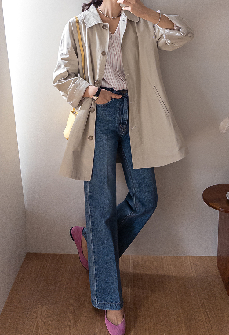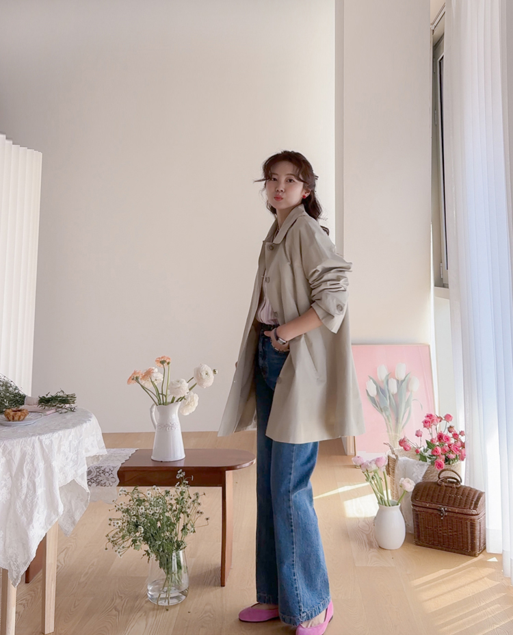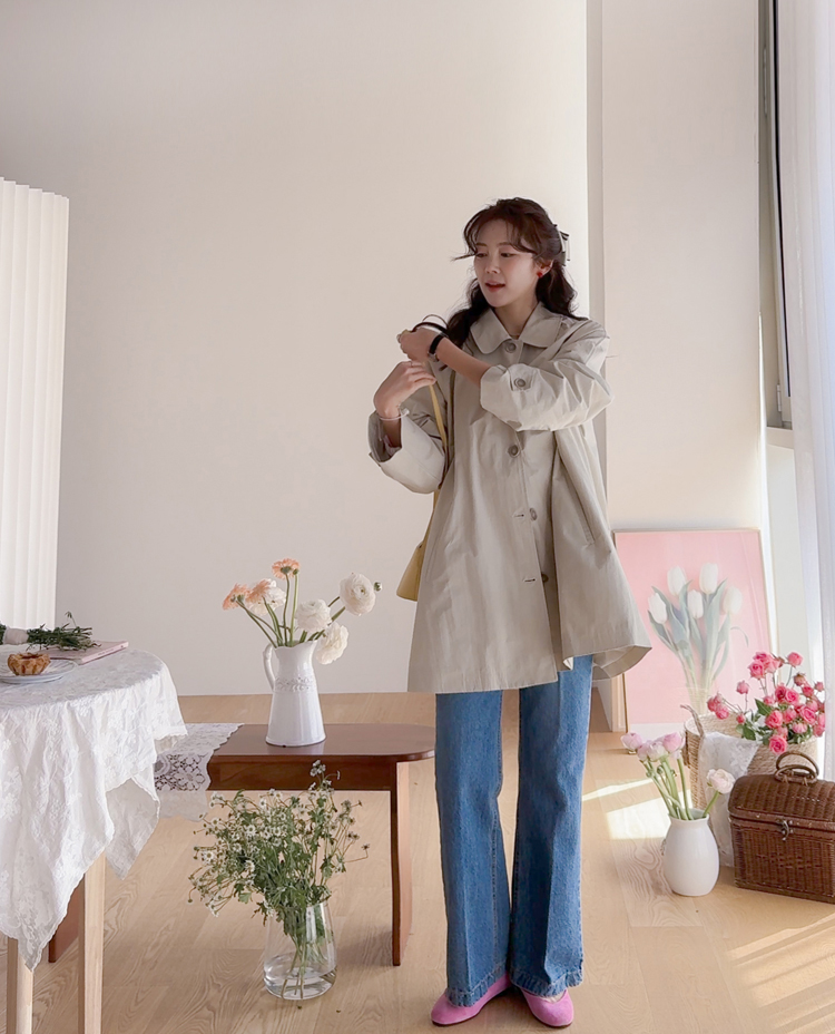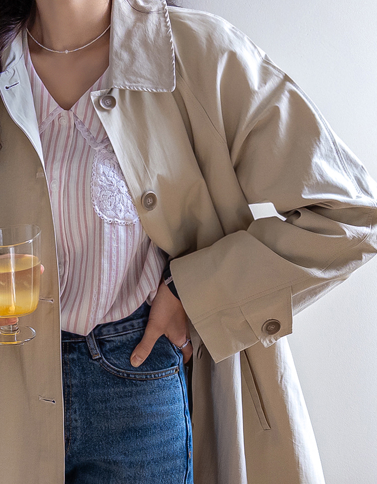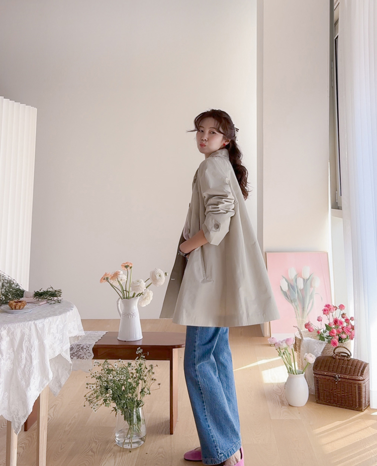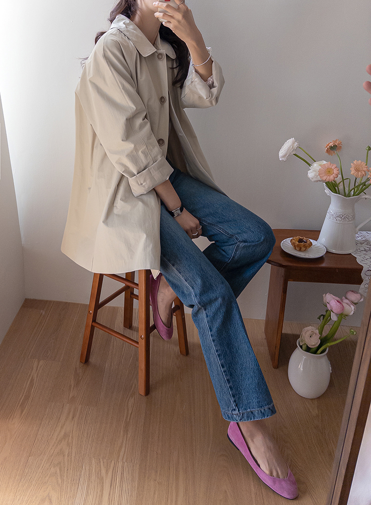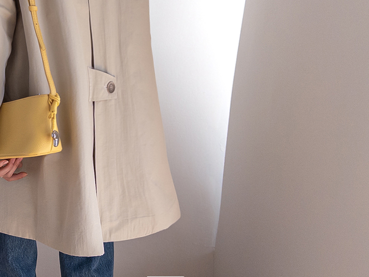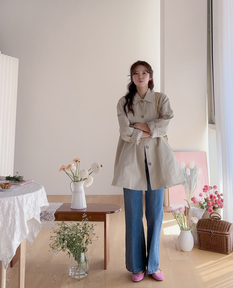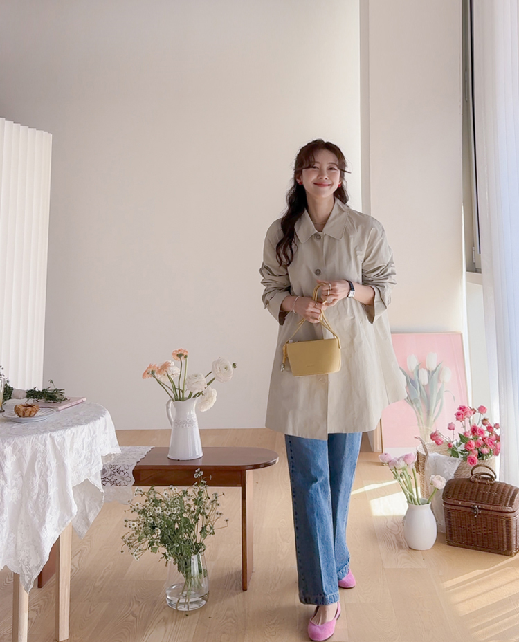 간절기 시즌 가볍게 걸치기 좋은 하프 트렌치 코트 소개드려요 ^^ 라글란 소매 디자인으로 어깨 라인이 자연스럽게 떨어지면서 부드럽고 여리한 실루엣을 연출해주고요, 싱글 여밈 디자인으로 군더더기 없이 깔끔하게 떨어져 데일리하게 활용하기 좋은 아이템이에요. 소매에는 비조 디테일을 더해 핏을 조절할 수 있으며 뒷중심에도 비조 장식을 더해 은은한 트렌치 감성을 살려주었어요. 뒷중심 맞턱 디테일로 움직일 때마다 자연스럽게 훌이 퍼져 전체적으로 A라인 실루엣이 예쁘게 연출되는 데일리 아우터로 추천드릴게요 ♥