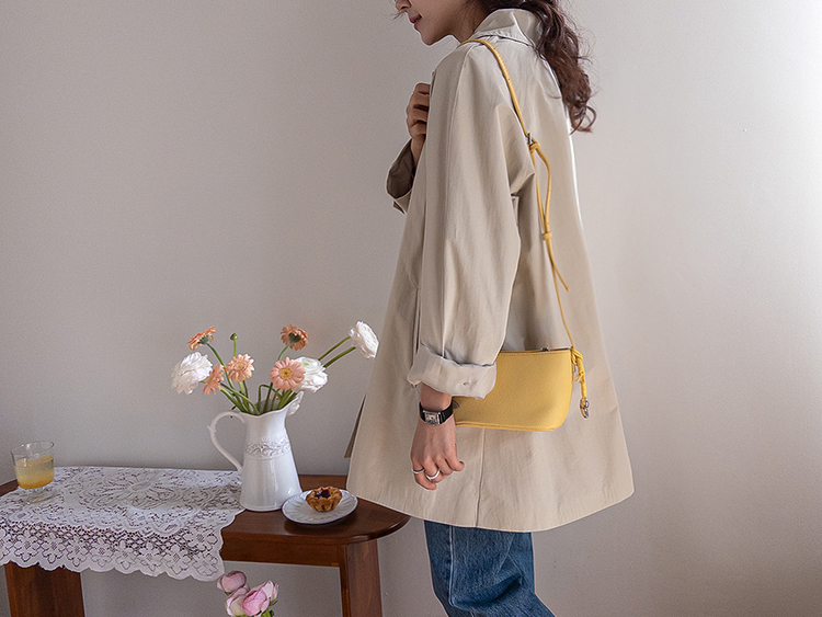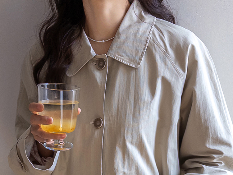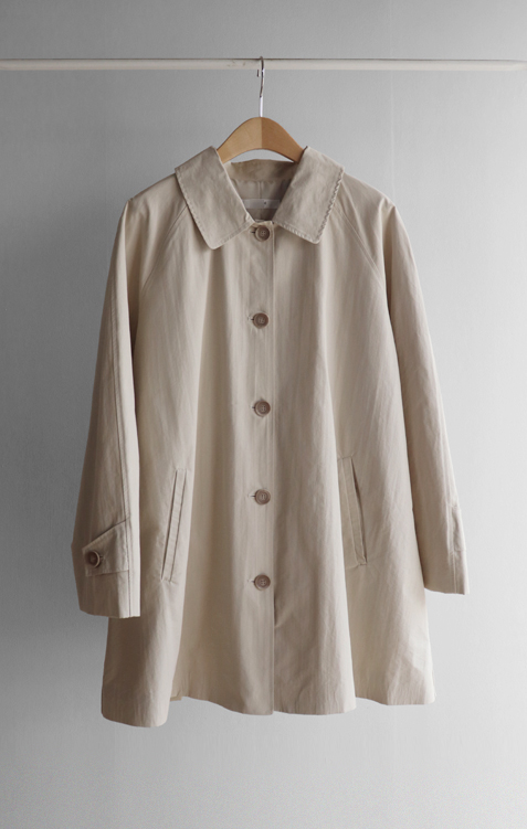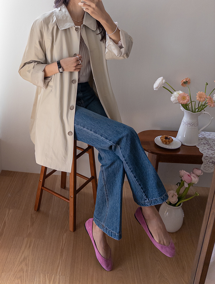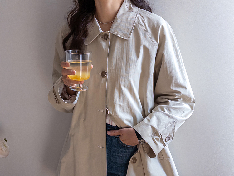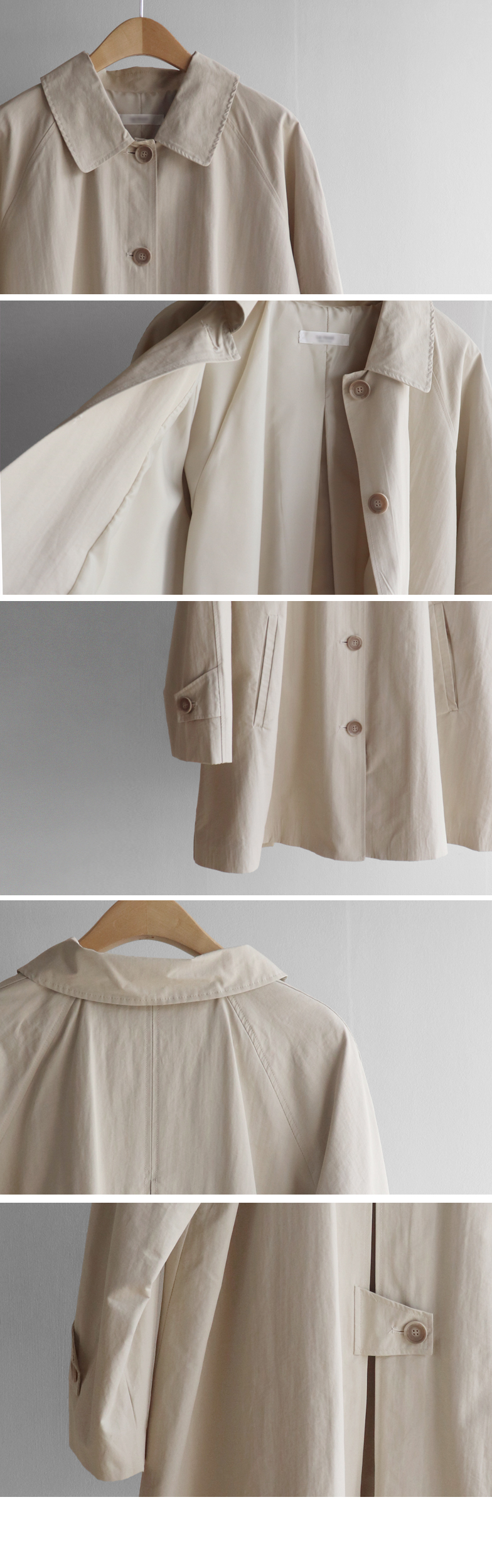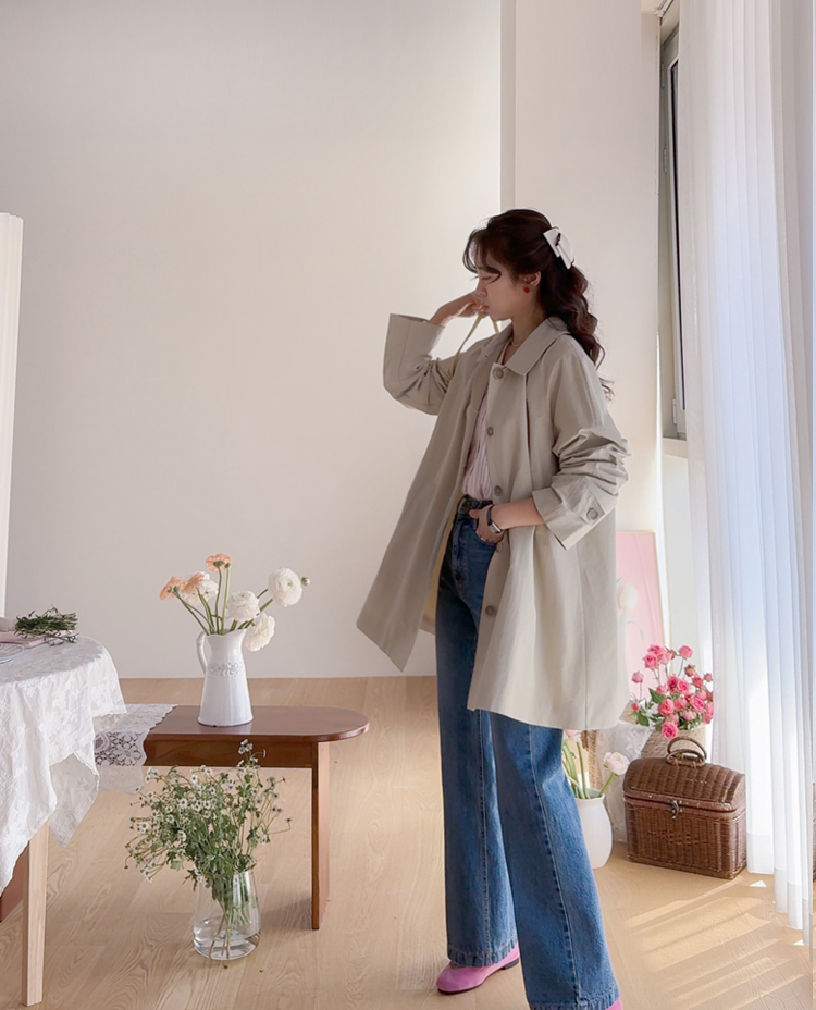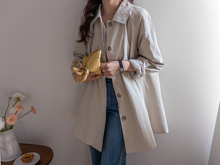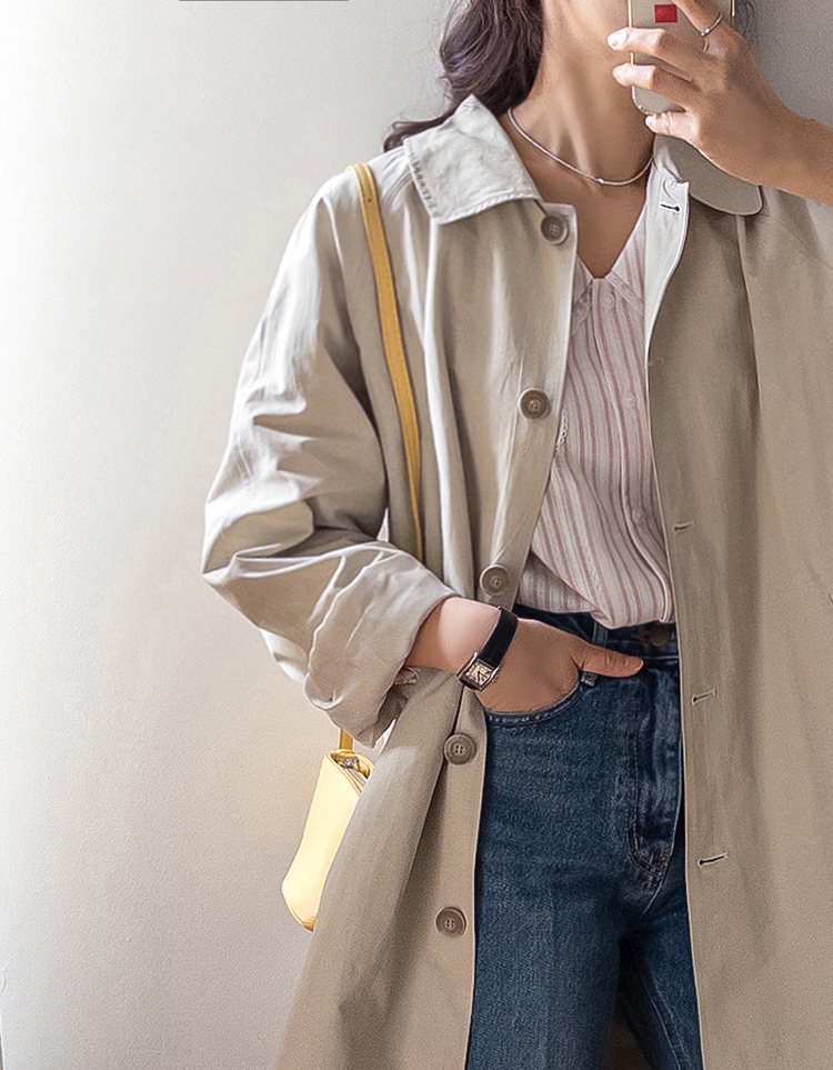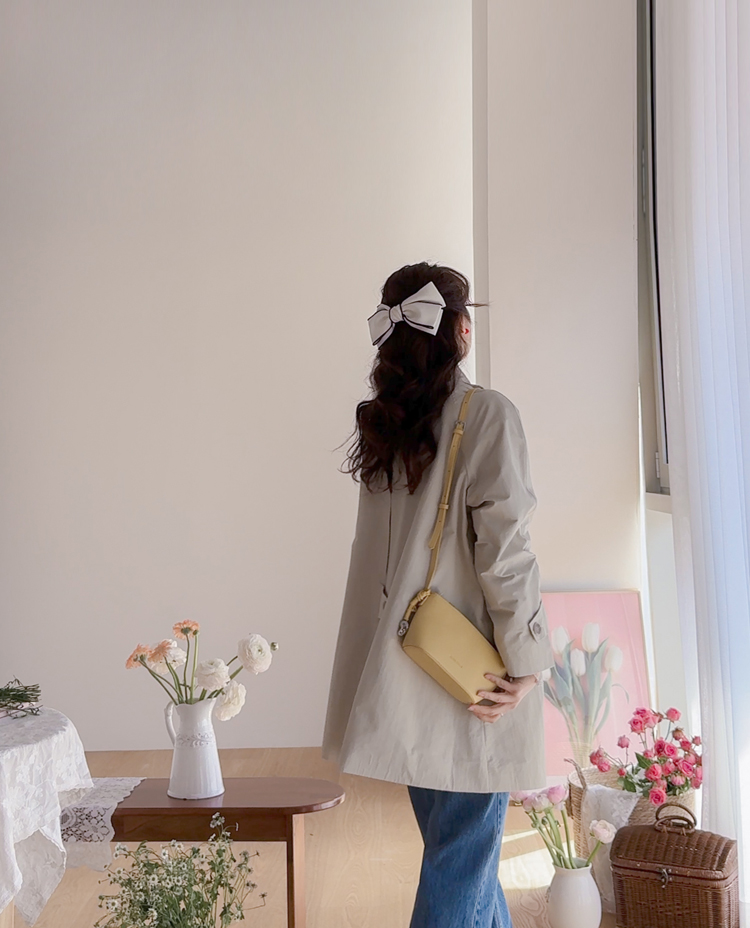 간절기 시즌 가볍게 걸치기 좋은 하프 트렌치 코트 소개드려요 ^^ 라글란 소매 디자인으로 어깨 라인이 자연스럽게 떨어지면서 부드럽고 여리한 실루엣을 연출해주고요, 싱글 여밈 디자인으로 군더더기 없이 깔끔하게 떨어져 데일리하게 활용하기 좋은 아이템이에요. 소매에는 비조 디테일을 더해 핏을 조절할 수 있으며 뒷중심에도 비조 장식을 더해 은은한 트렌치 감성을 살려주었어요. 뒷중심 맞턱 디테일로 움직일 때마다 자연스럽게 훌이 퍼져 전체적으로 A라인 실루엣이 예쁘게 연출되는 데일리 아우터로 추천드릴게요 ♥