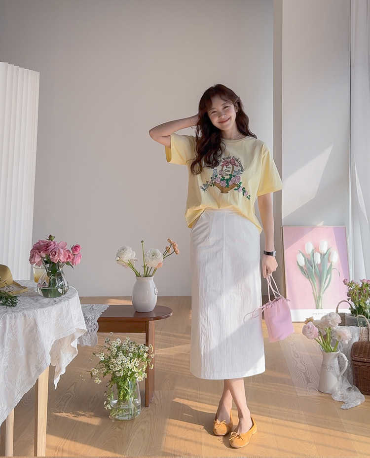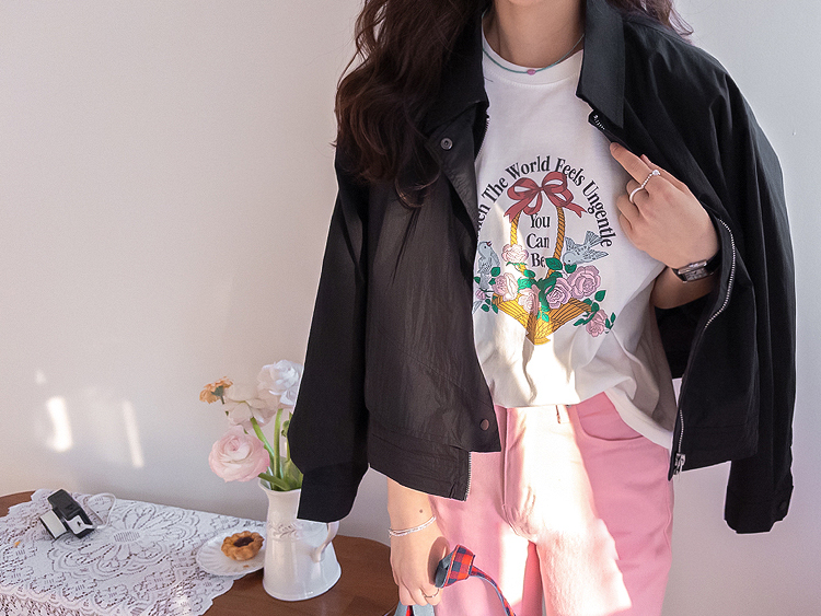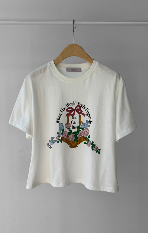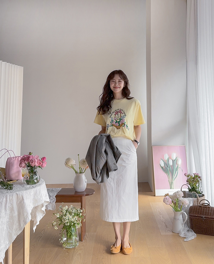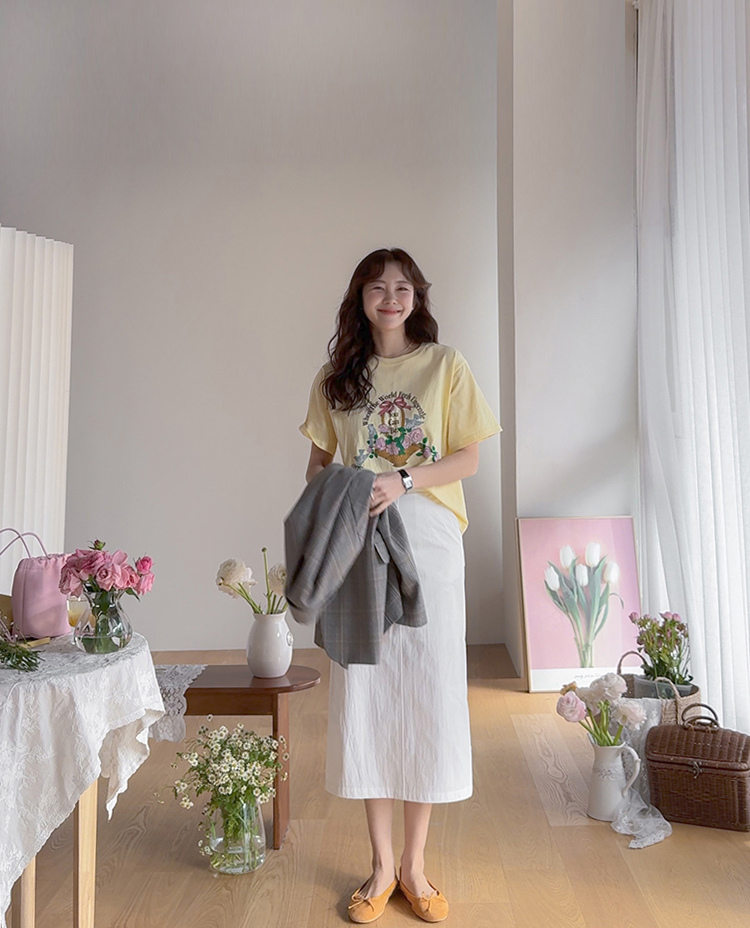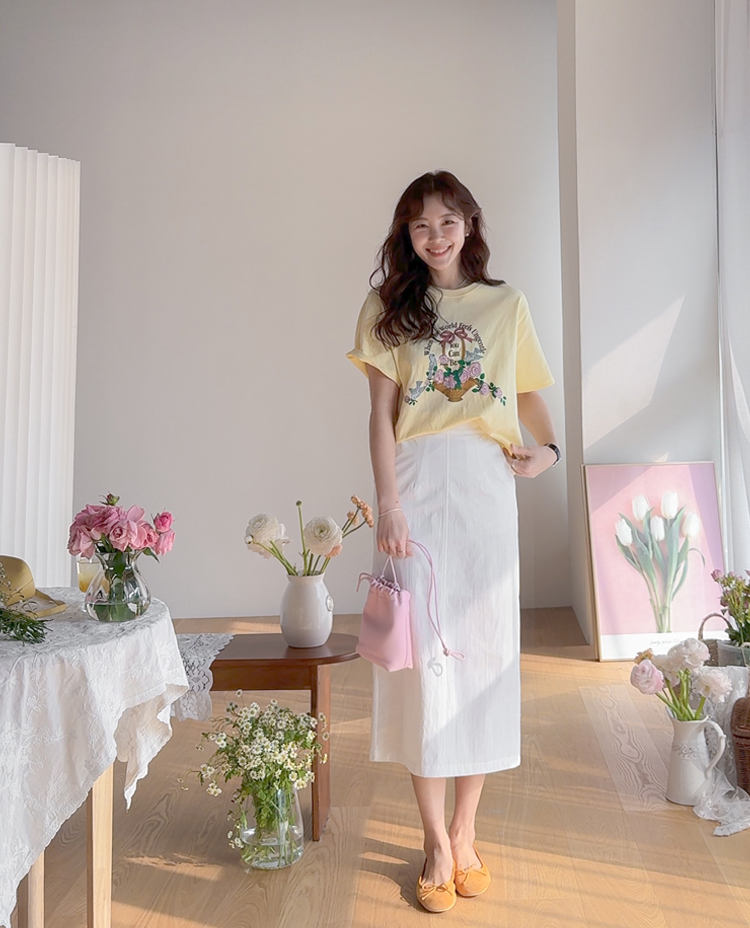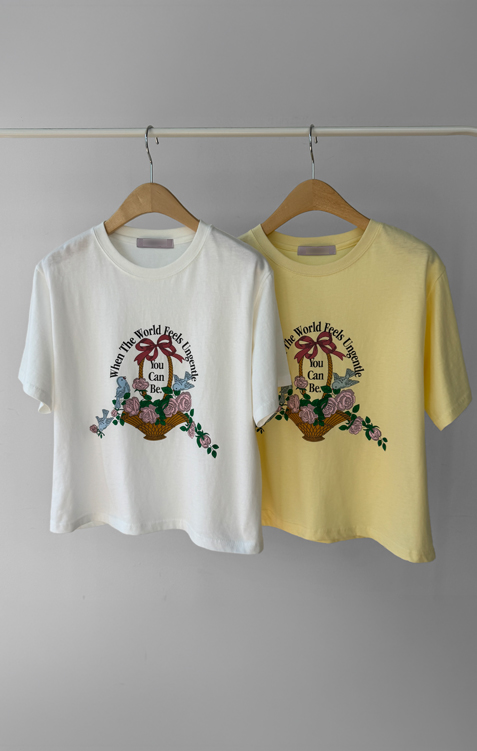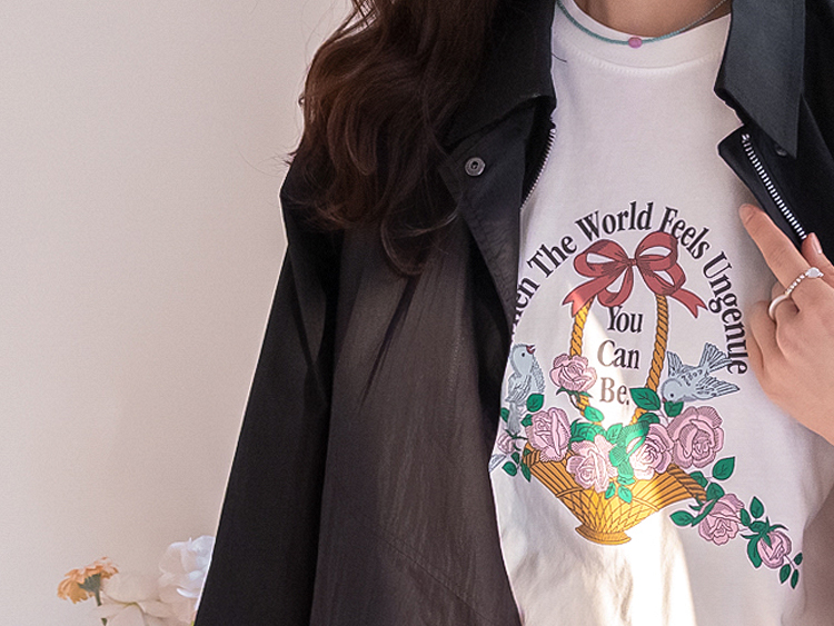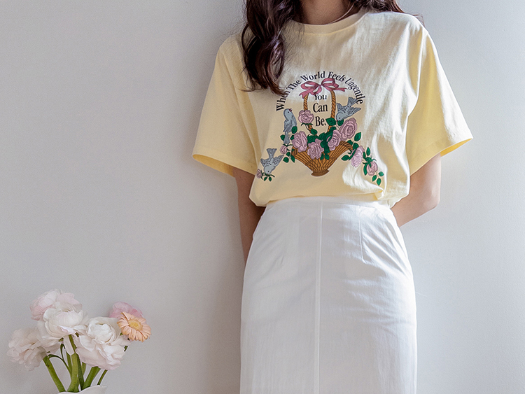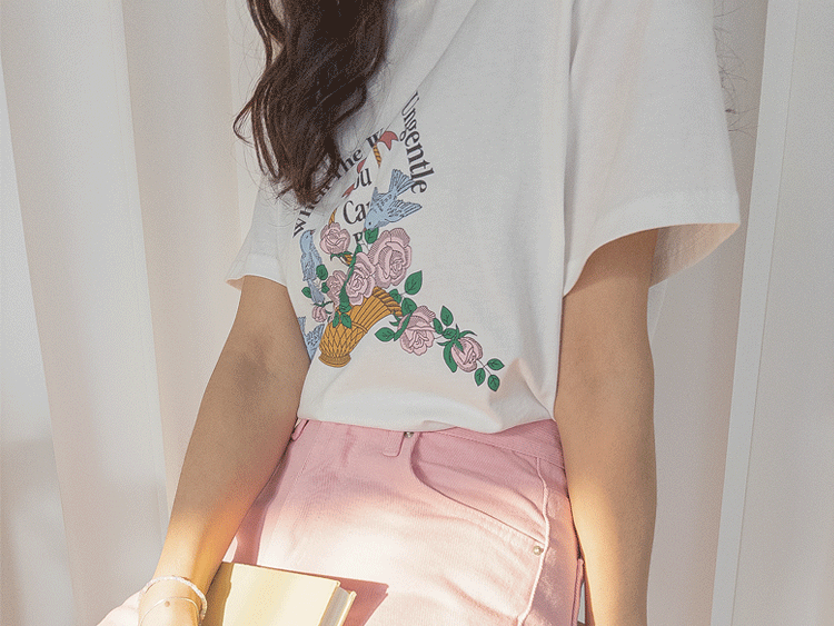 가볍게 입기 좋은 프린트 라운드 티셔츠 소개드려요 ^^ 전체적으로 딱 기본 사이즈의 라운드 티셔츠 핏으로 편안하면서도 깔끔하게 입기 좋은 아이템이에요. 앞판에는 꽃바구니와 새 모티브 프린트가 들어가 사랑스럽고 화사한 분위기를 만들어주며 과하지 않아 데일리로 부담 없이 착용하기 좋습니다. 은은한 컬러감의 프린트가 포인트가 되어 단독으로 입어도 밋밋하지 않고 봄 시즌 분위기를 살려주는 티셔츠예요. 데님, 스커트, 슬랙스 등 다양한 아이템과 매치하기 좋아 데일리룩으로 활용하기 좋은 티셔츠입니다 ♡