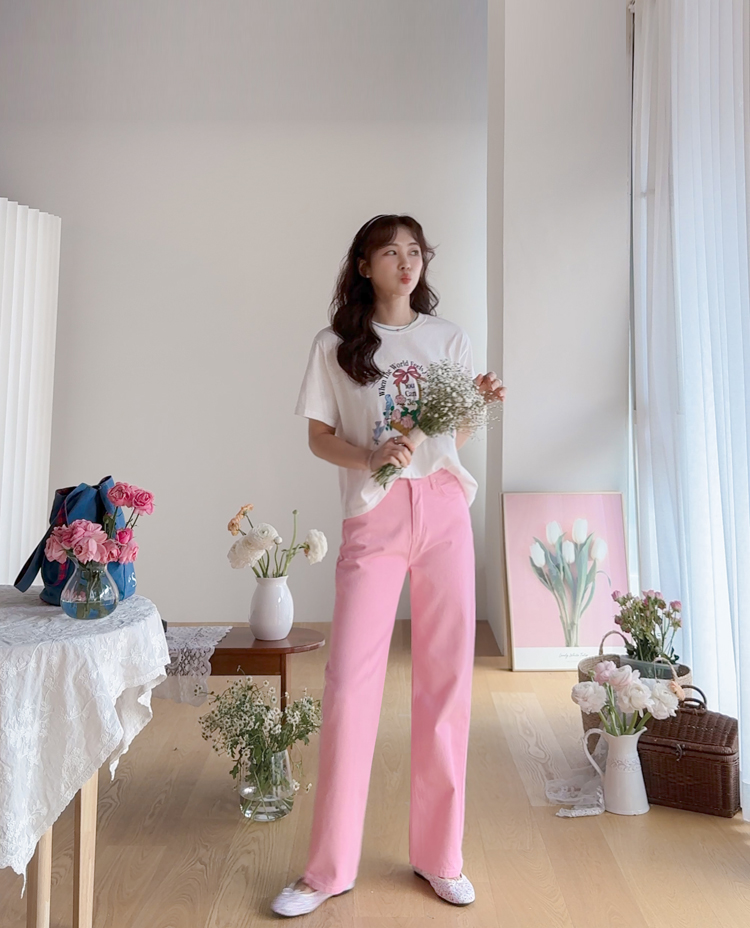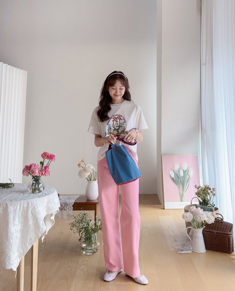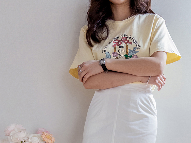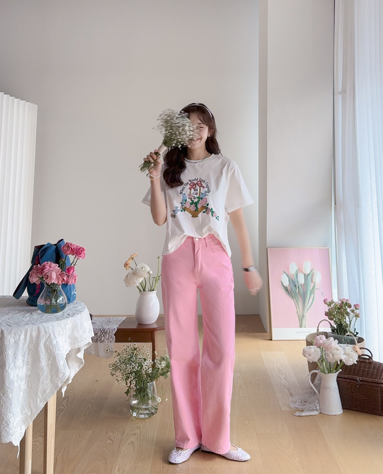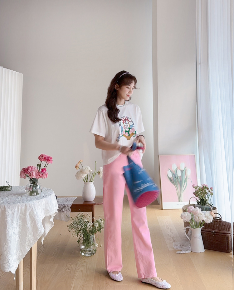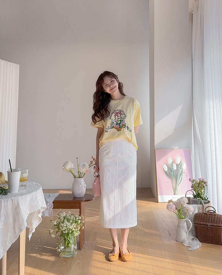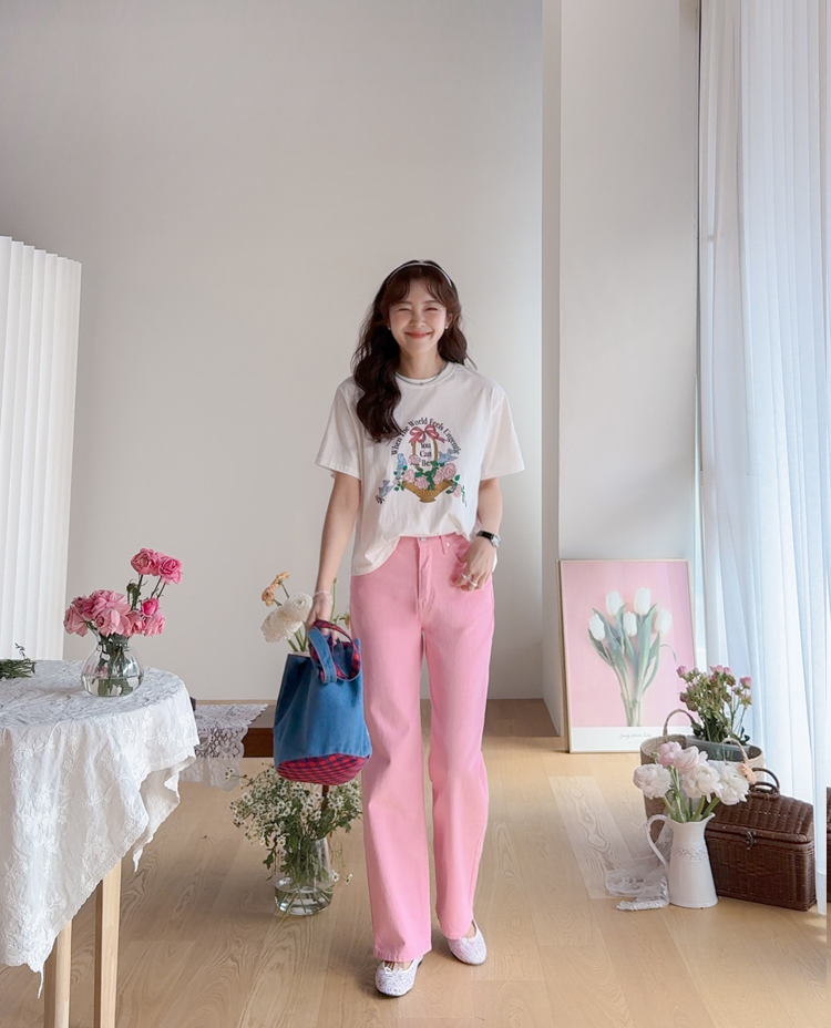가볍게 입기 좋은 프린트 라운드 티셔츠 소개드려요 ^^ 전체적으로 딱 기본 사이즈의 라운드 티셔츠 핏으로 편안하면서도 깔끔하게 입기 좋은 아이템이에요. 앞판에는 꽃바구니와 새 모티브 프린트가 들어가 사랑스럽고 화사한 분위기를 만들어주며 과하지 않아 데일리로 부담 없이 착용하기 좋습니다. 은은한 컬러감의 프린트가 포인트가 되어 단독으로 입어도 밋밋하지 않고 봄 시즌 분위기를 살려주는 티셔츠예요. 데님, 스커트, 슬랙스 등 다양한 아이템과 매치하기 좋아 데일리룩으로 활용하기 좋은 티셔츠입니다 ♡