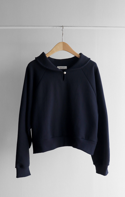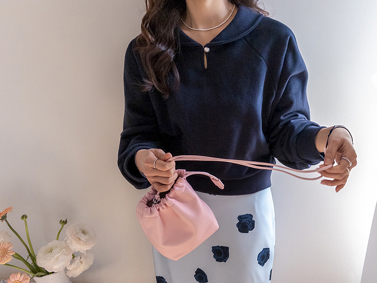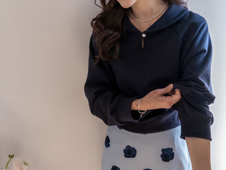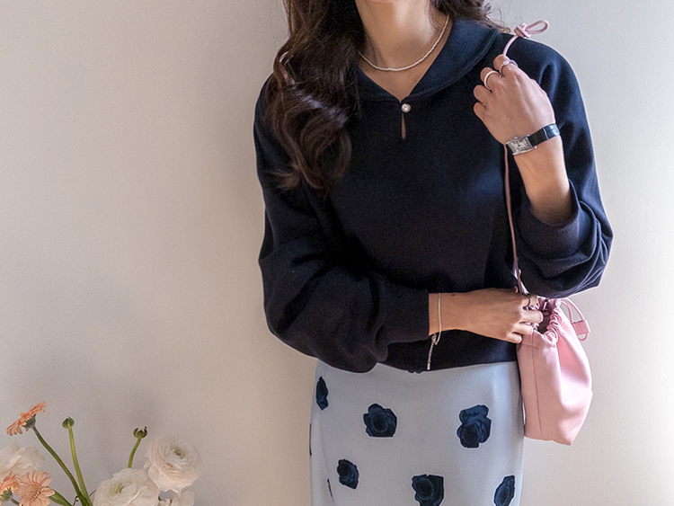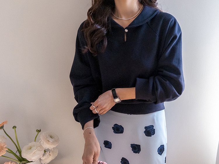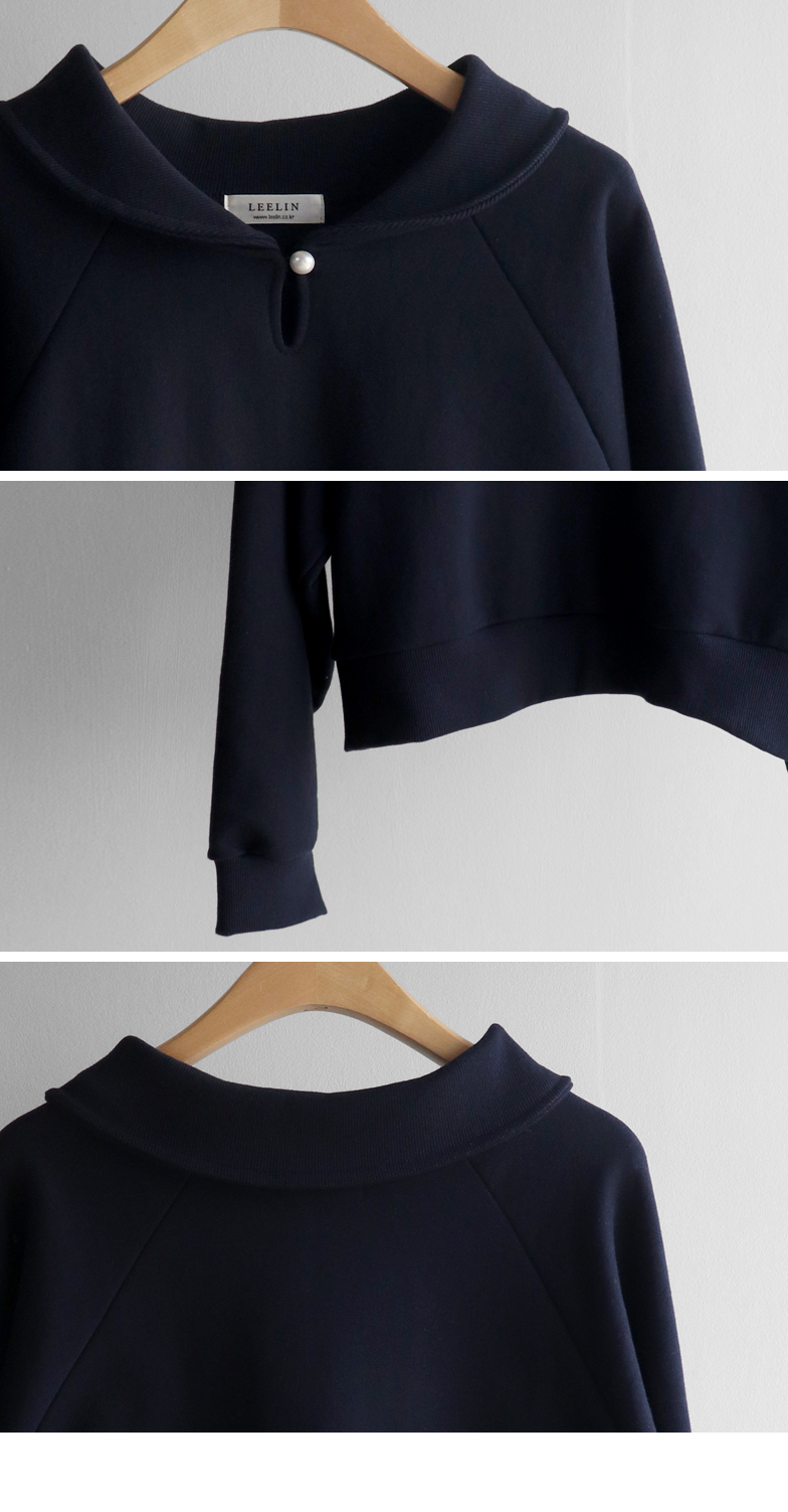 넥라인 중앙에 더해진 진주 버튼 디테일이 포인트로 콕!
