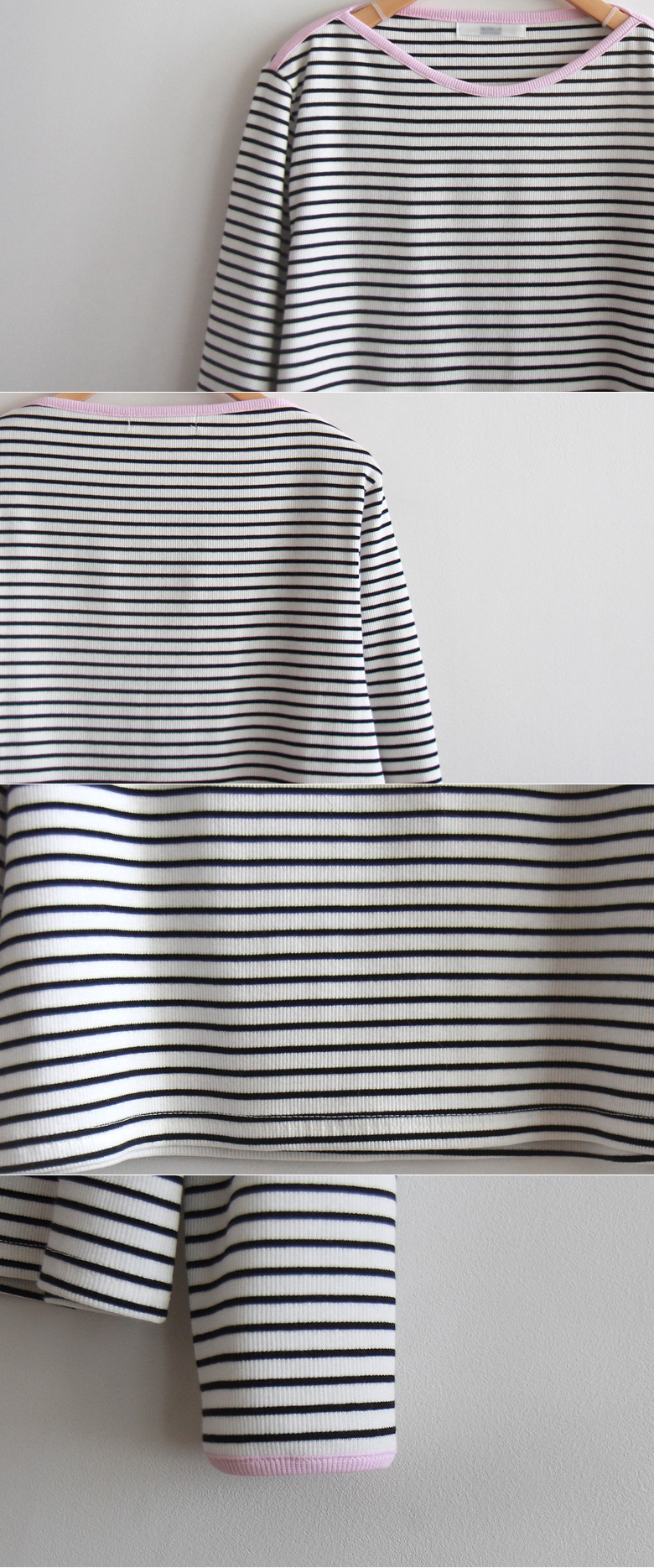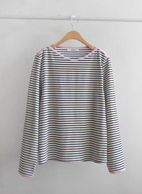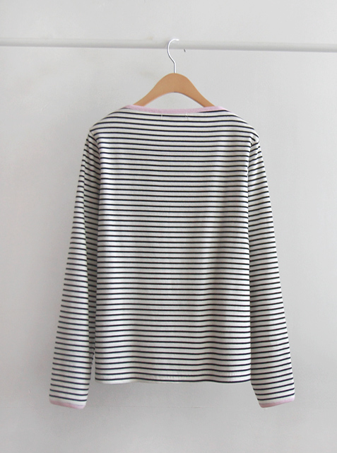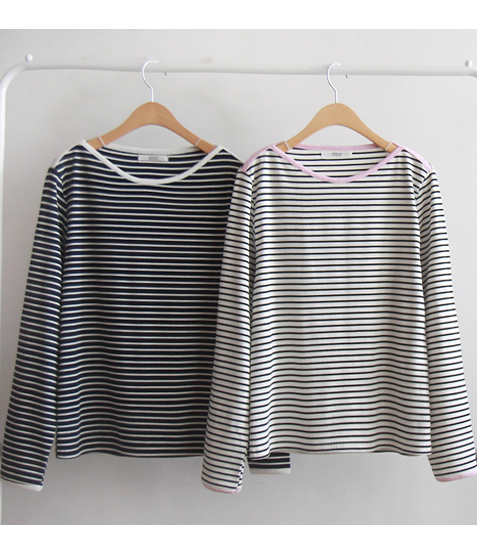 넥 배색이 산뜻한 매력으로 봄을 느끼게 해주는 티셧이랍니다~