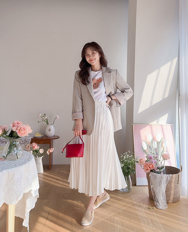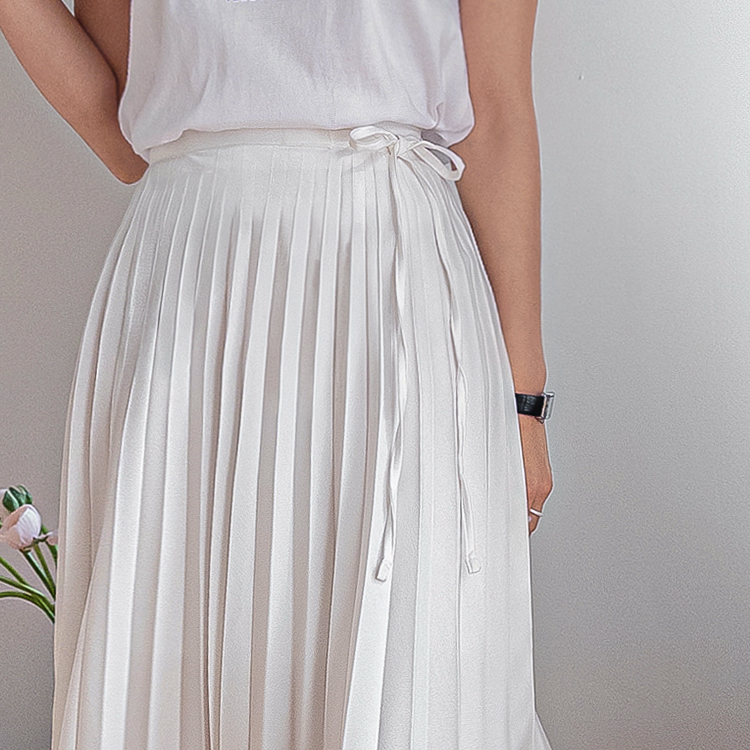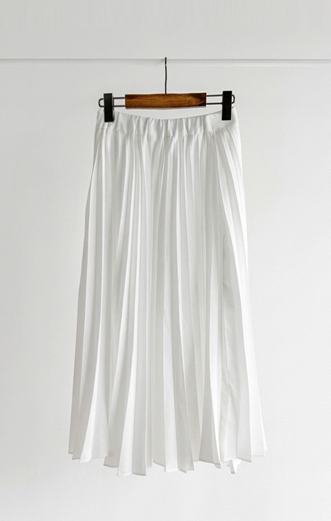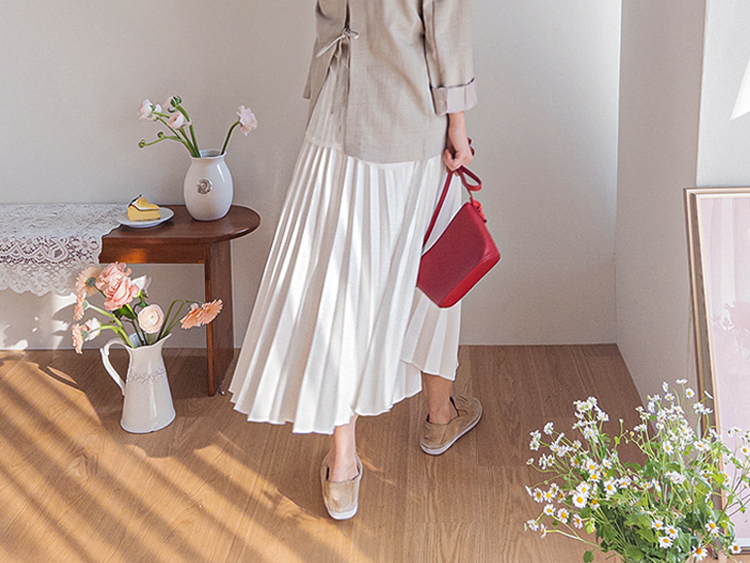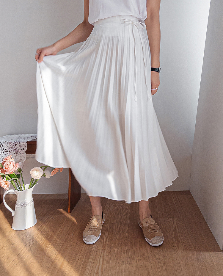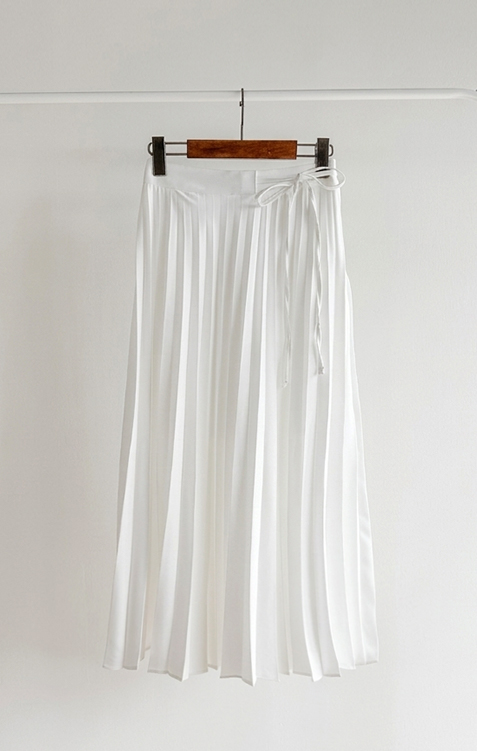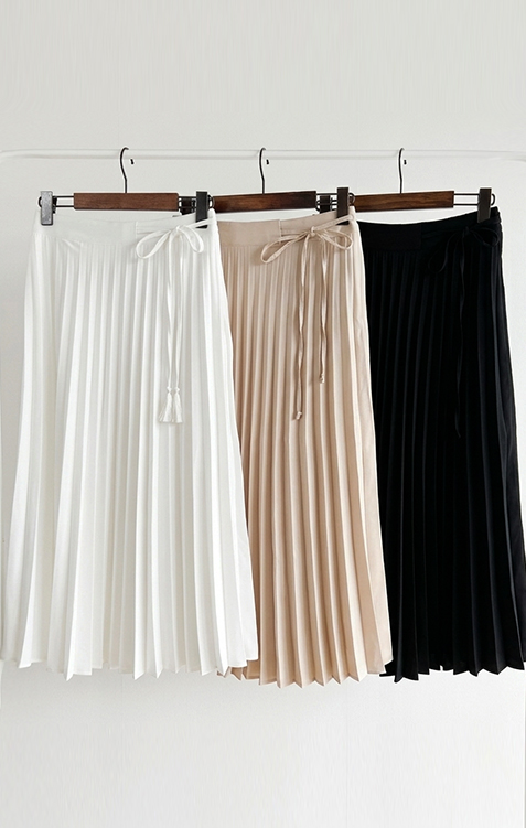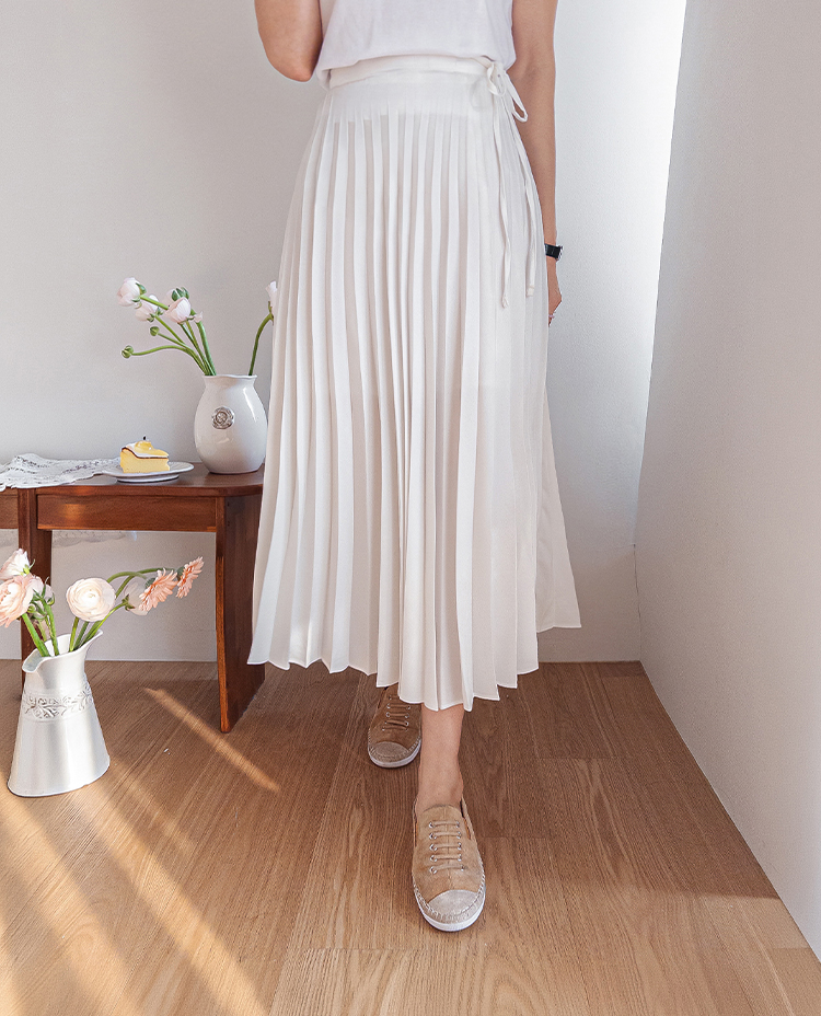 여성스럽고 단정한 분위기가 매력적인 플리츠 스커트 소개드려요 ^^ 전체적으로 곱게 잡힌 플리츠 주름이 움직일 때마다 자연스럽게 퍼지며 여리하고 우아한 실루엣을 만들어주는 스커트예요. 기장은 종아리 중간 정도로 내려오는 롱미디 기장으로 부담 없이 입기 좋으면서도 단정하고 여성스러운 분위기를 한층 더 살려주고요, 허리 부분에는 조절용이 아닌 장식 리본 스트랩 디테일이 더해져 가볍게 리본으로 연출해주면 한층 더 사랑스럽고 로맨틱한 무드가 느껴져요. 티셔츠, 니트, 블라우스 어디에나 잘 어울려 데일리룩부터 모임룩까지 다양하게 활용하기 좋은 스커트로 추천드릴게요 ♥