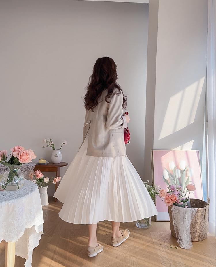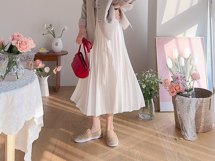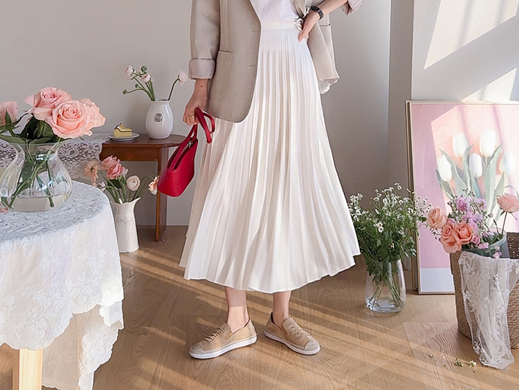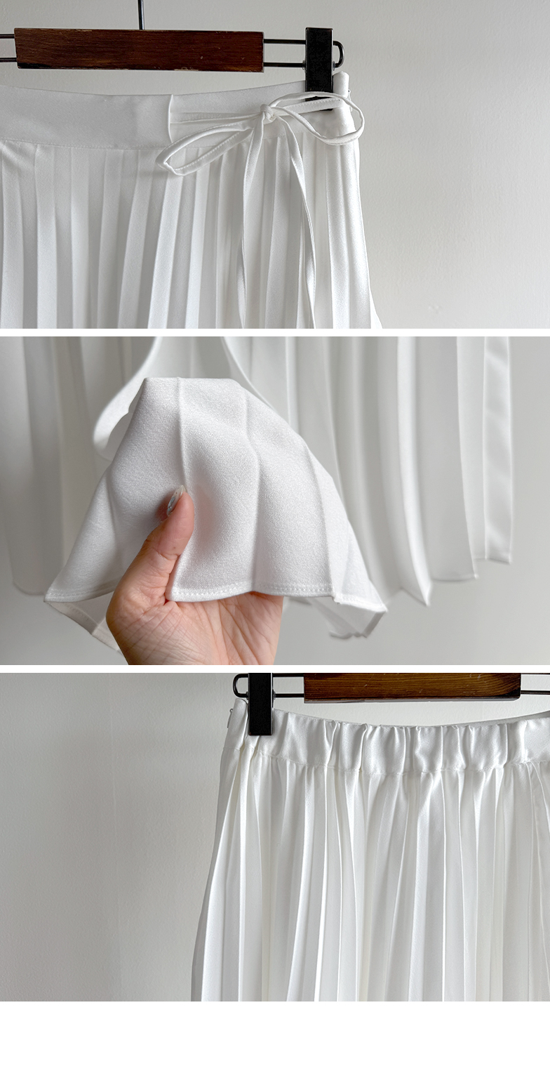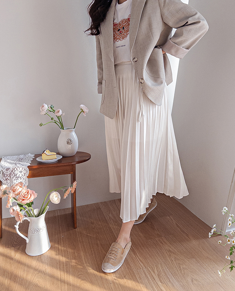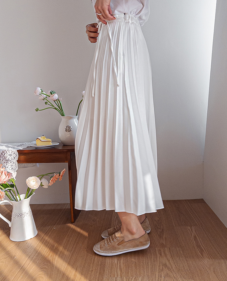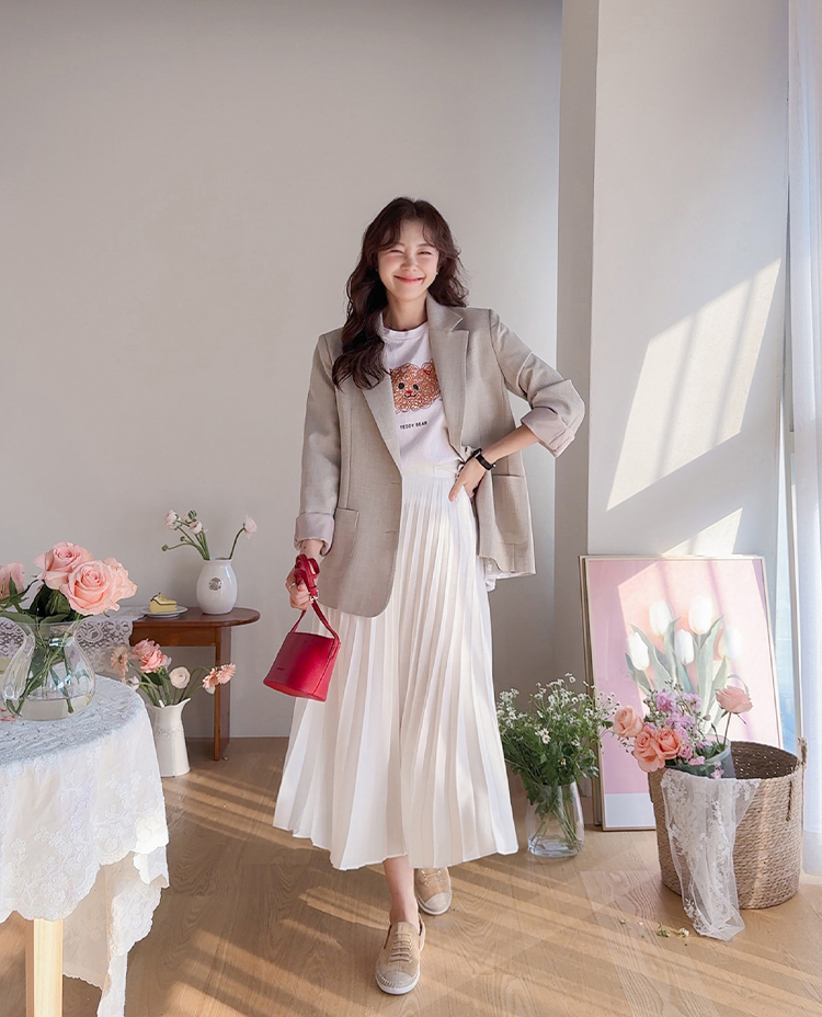 여성스럽고 단정한 분위기가 매력적인 플리츠 스커트 소개드려요 ^^ 전체적으로 곱게 잡힌 플리츠 주름이 움직일 때마다 자연스럽게 퍼지며 여리하고 우아한 실루엣을 만들어주는 스커트예요. 기장은 종아리 중간 정도로 내려오는 롱미디 기장으로 부담 없이 입기 좋으면서도 단정하고 여성스러운 분위기를 한층 더 살려주고요, 허리 부분에는 조절용이 아닌 장식 리본 스트랩 디테일이 더해져 가볍게 리본으로 연출해주면 한층 더 사랑스럽고 로맨틱한 무드가 느껴져요. 티셔츠, 니트, 블라우스 어디에나 잘 어울려 데일리룩부터 모임룩까지 다양하게 활용하기 좋은 스커트로 추천드릴게요 ♥