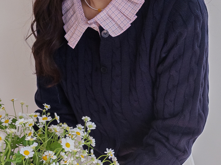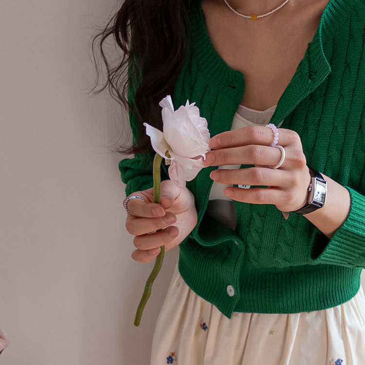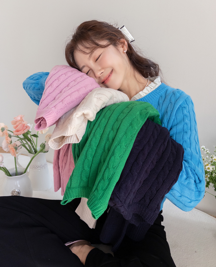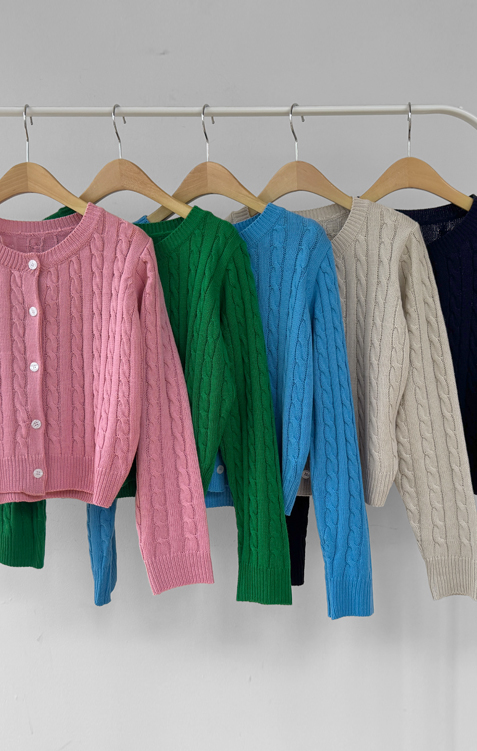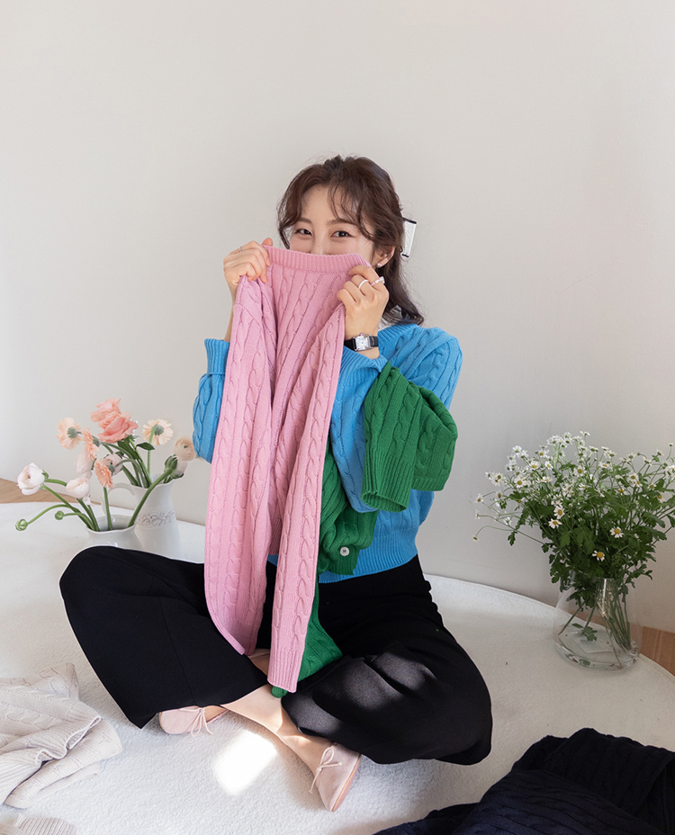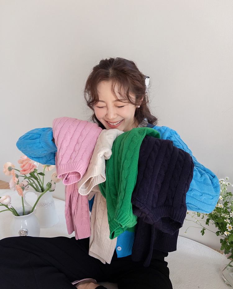 컬러감이 매력적인 꽈배기 니트 가디건 소개드려요 ^^ 전체적으로 라운드넥 디자인에 깔끔하게 떨어지는 핏으로 단정하면서도 데일리하게 입기 좋은 아이템이에요. 니트 전체에 꽈배기 짜임 디테일을 더해 심플한 디자인에 은은한 포인트를 주었고 입체감 있는 텍스처가 돋보이는 가디건입니다. 골반 위로 살짝 올라오는 세미 크롭 기장으로 부담스럽지 않으면서도 비율이 좋아 보이게 연출해줘요. 슬랙스, 데님, 스커트와 함께 다양하게 매치하기 좋으며 단독으로 입거나 이너와 레이어드해도 예쁜 아이템이에요. 핑크, 아이보리, 그린, 네이비 등 컬러별로 소장하기 좋은 데일리 니트 가디건으로 추천드릴게요 ♡